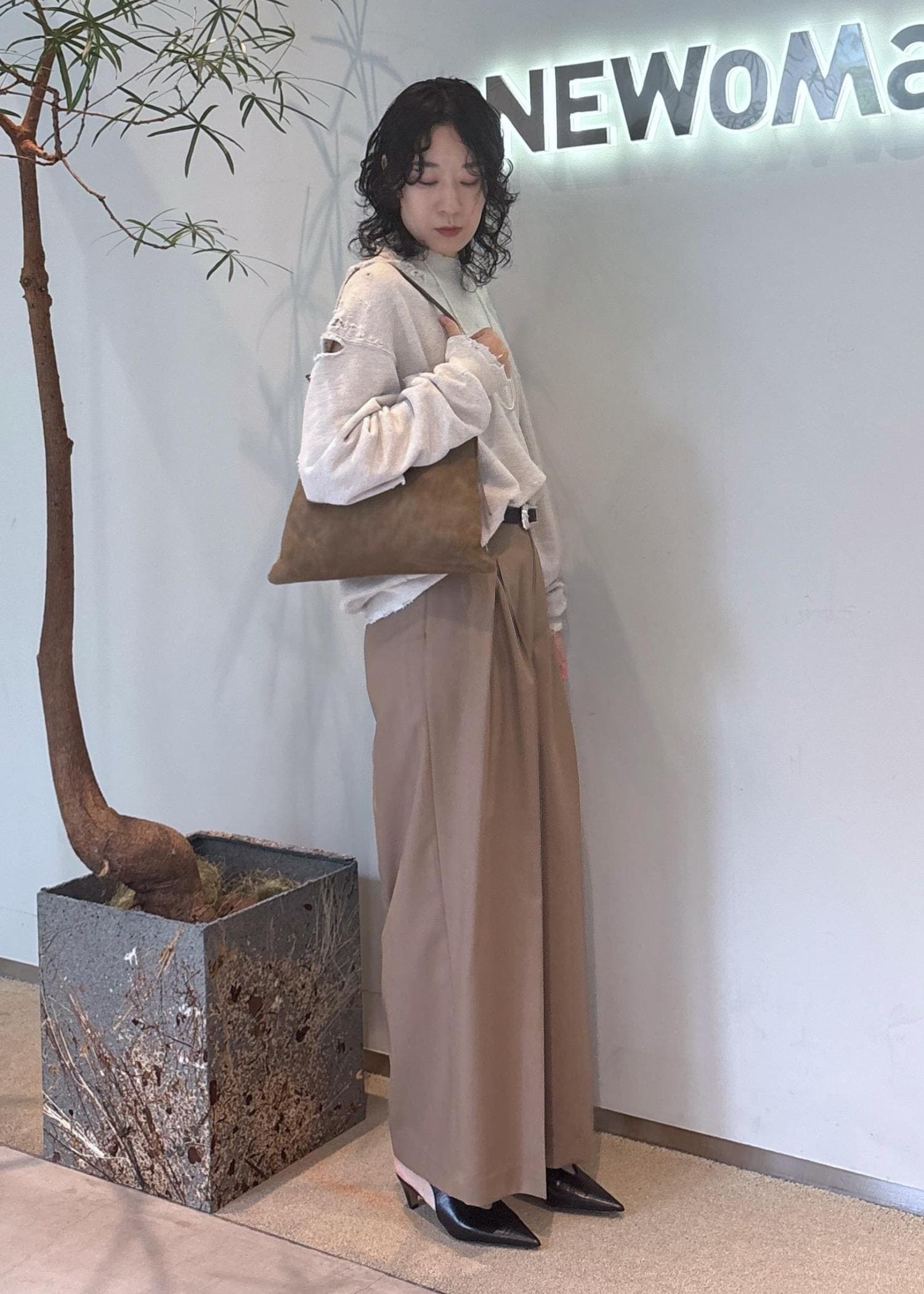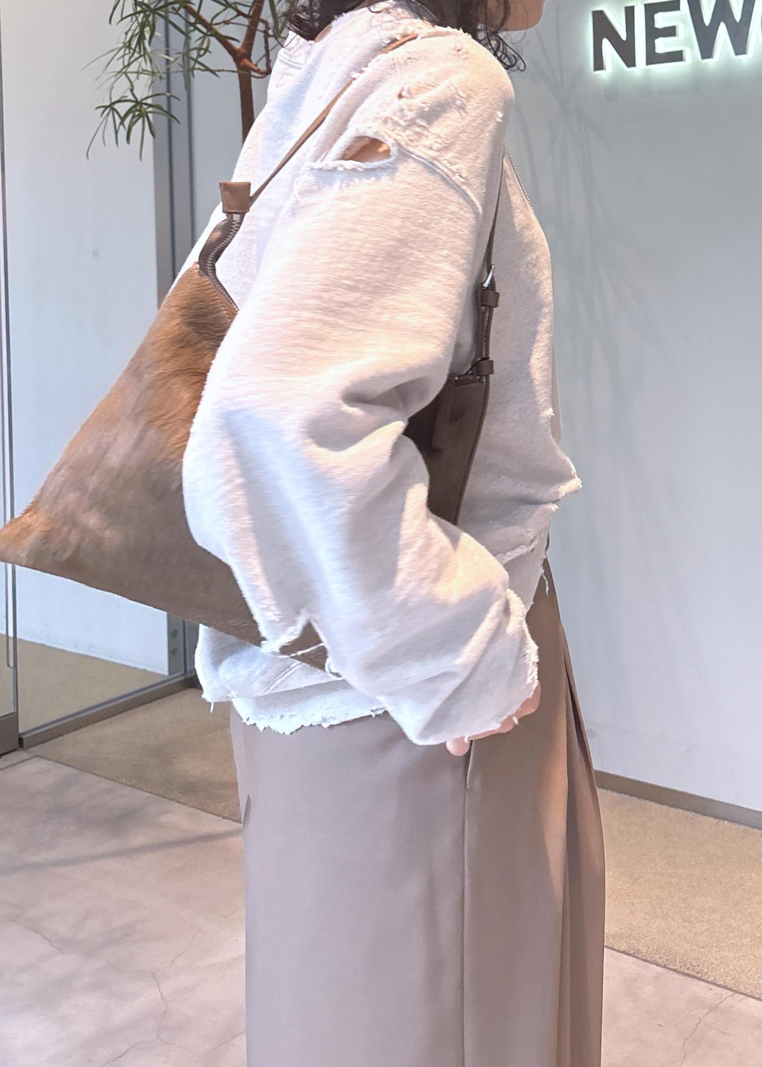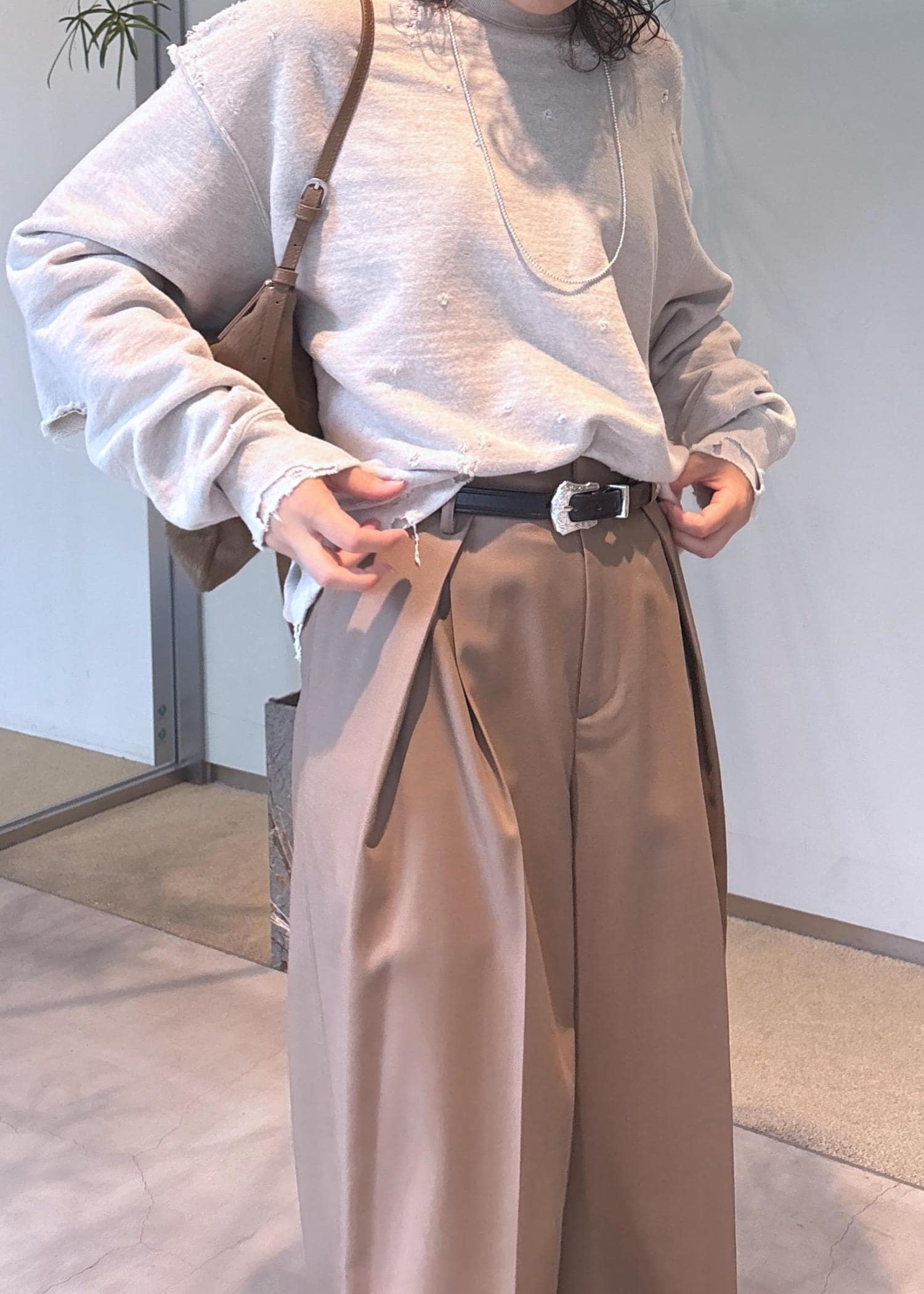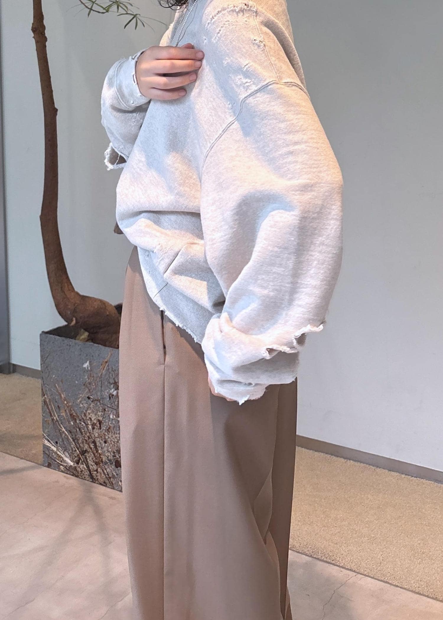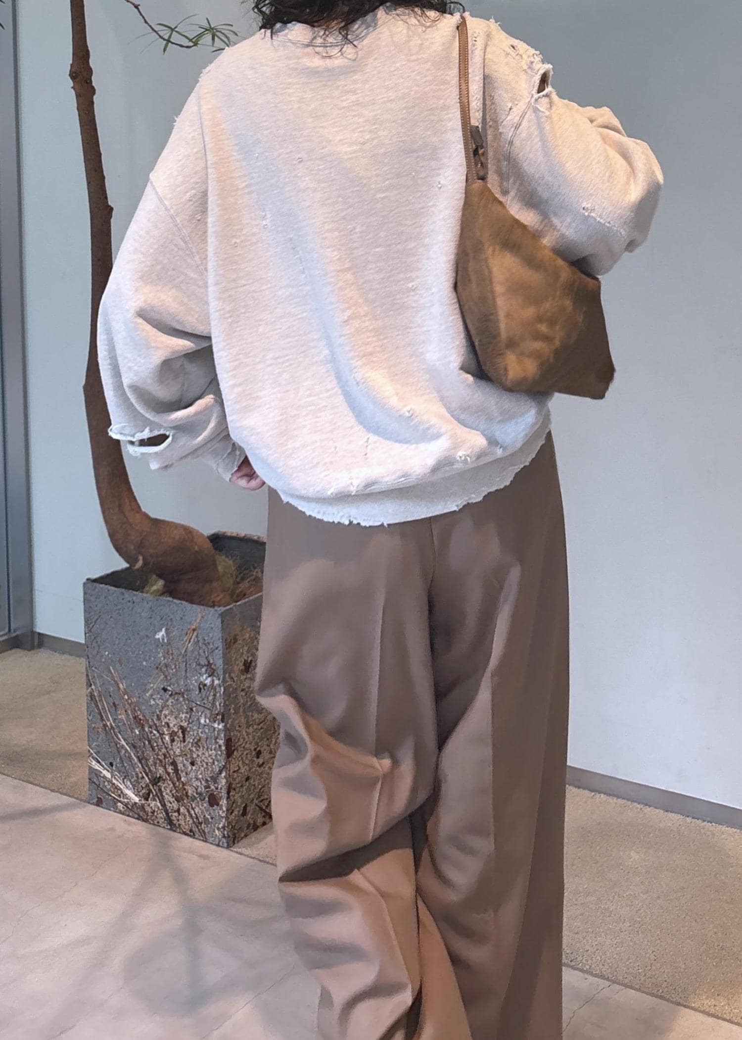 カジュアルなダメージスウェットにきれいめのパンツを合わせたMIXコーデ。パンツはタックの入ったオンオフ重宝する1着。きれいめなのでかなりダメージの入ったスウェットもカジュアルになりすぎずまとまります!