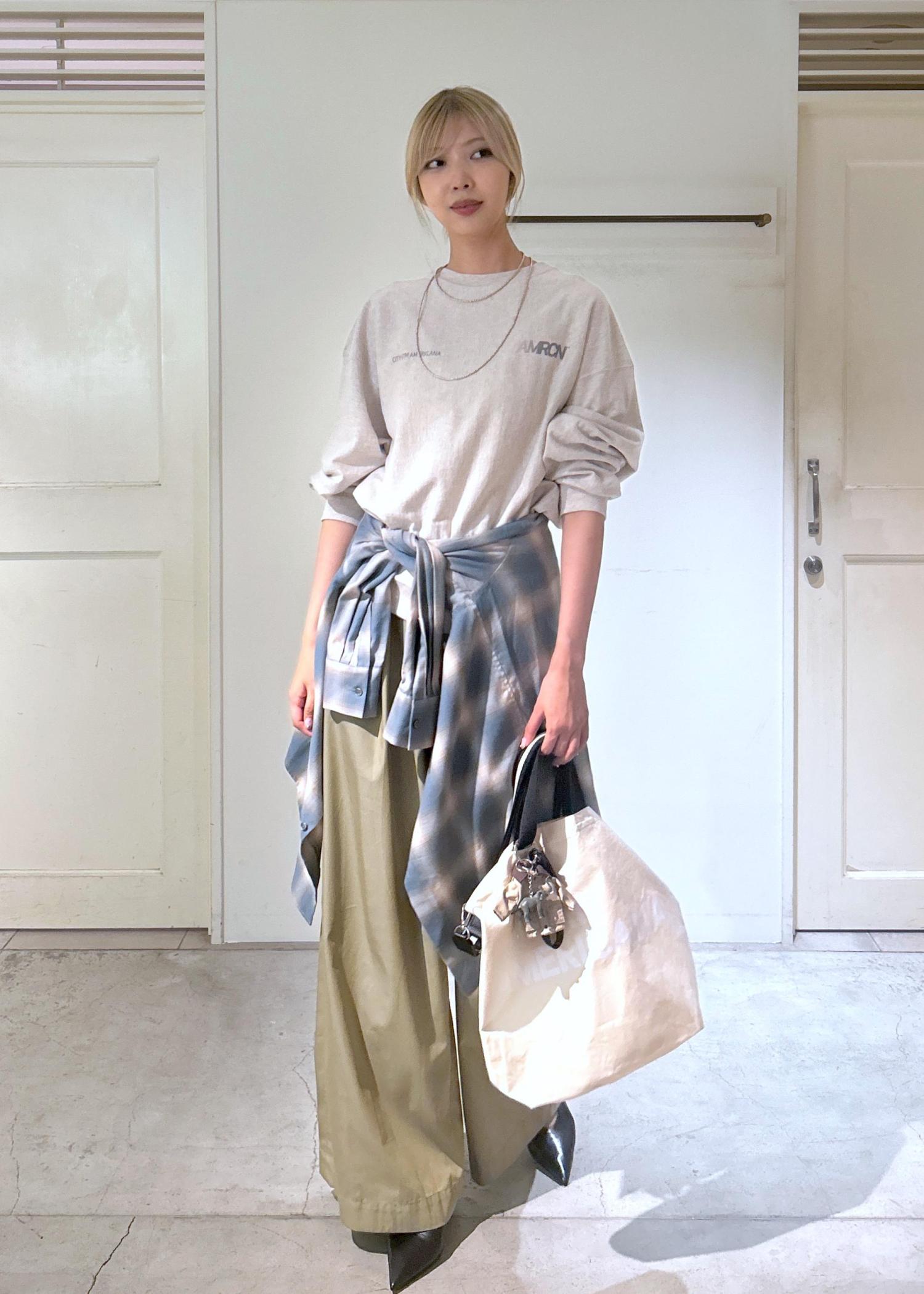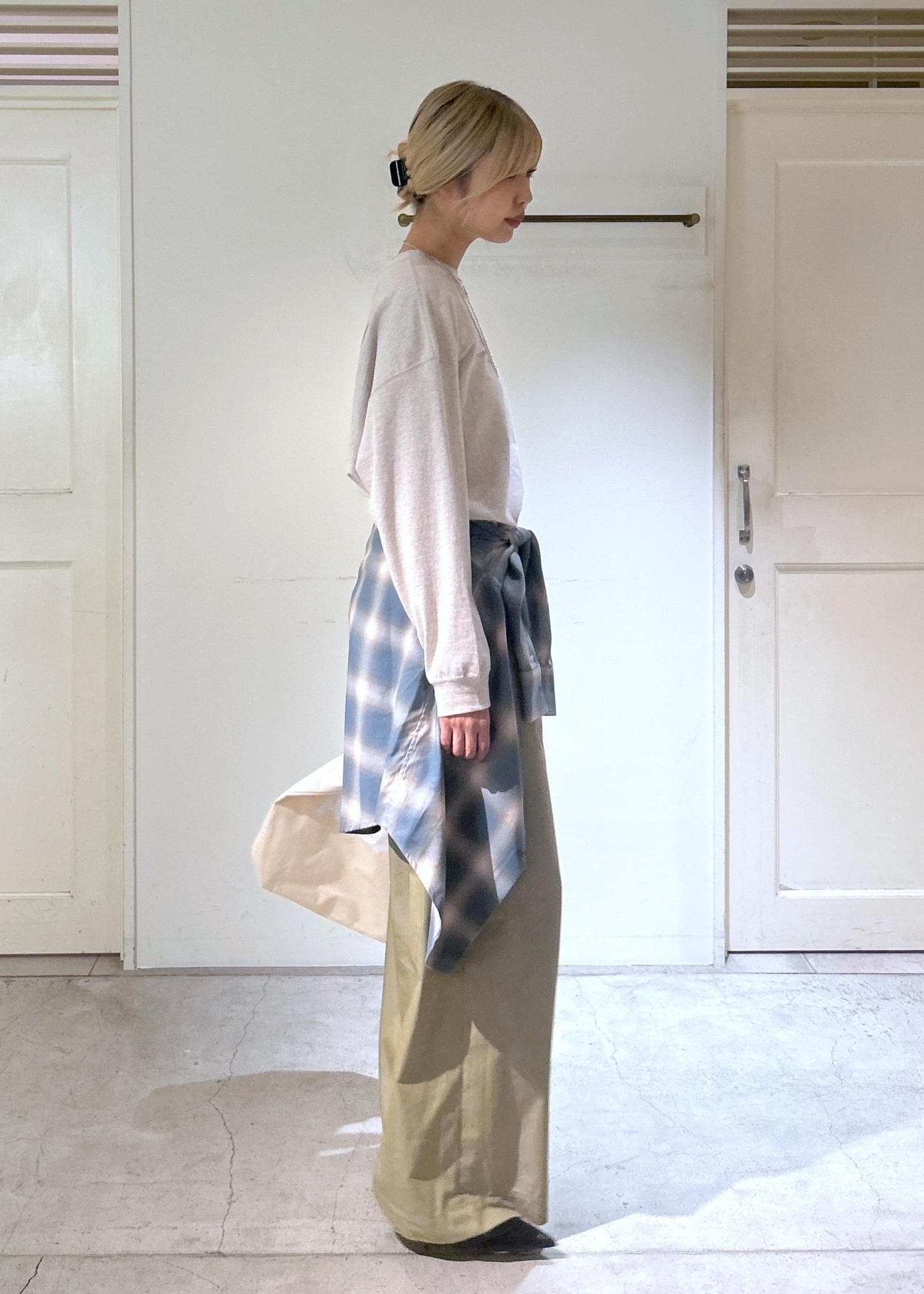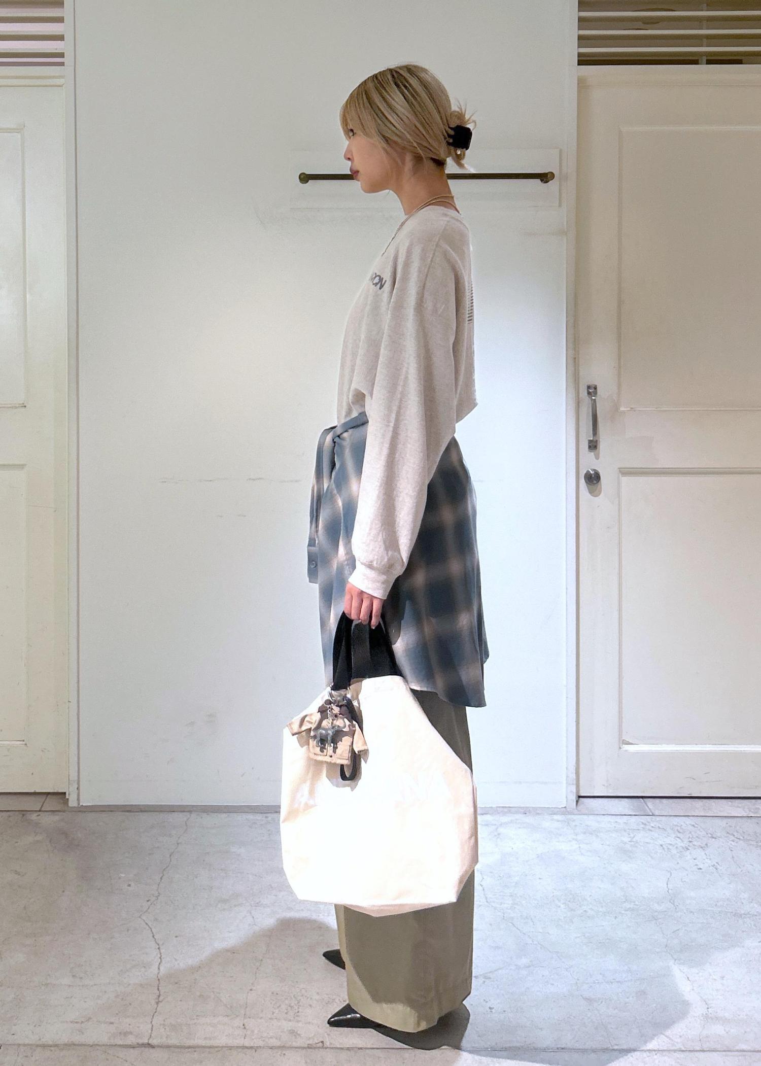 オンブレチェックはどこか懐かしい空気がありつつも、腰巻きをしたりキャミと合わせたりあえて女性らしくスタイリングすることで今っぽさも感じさせます。 -