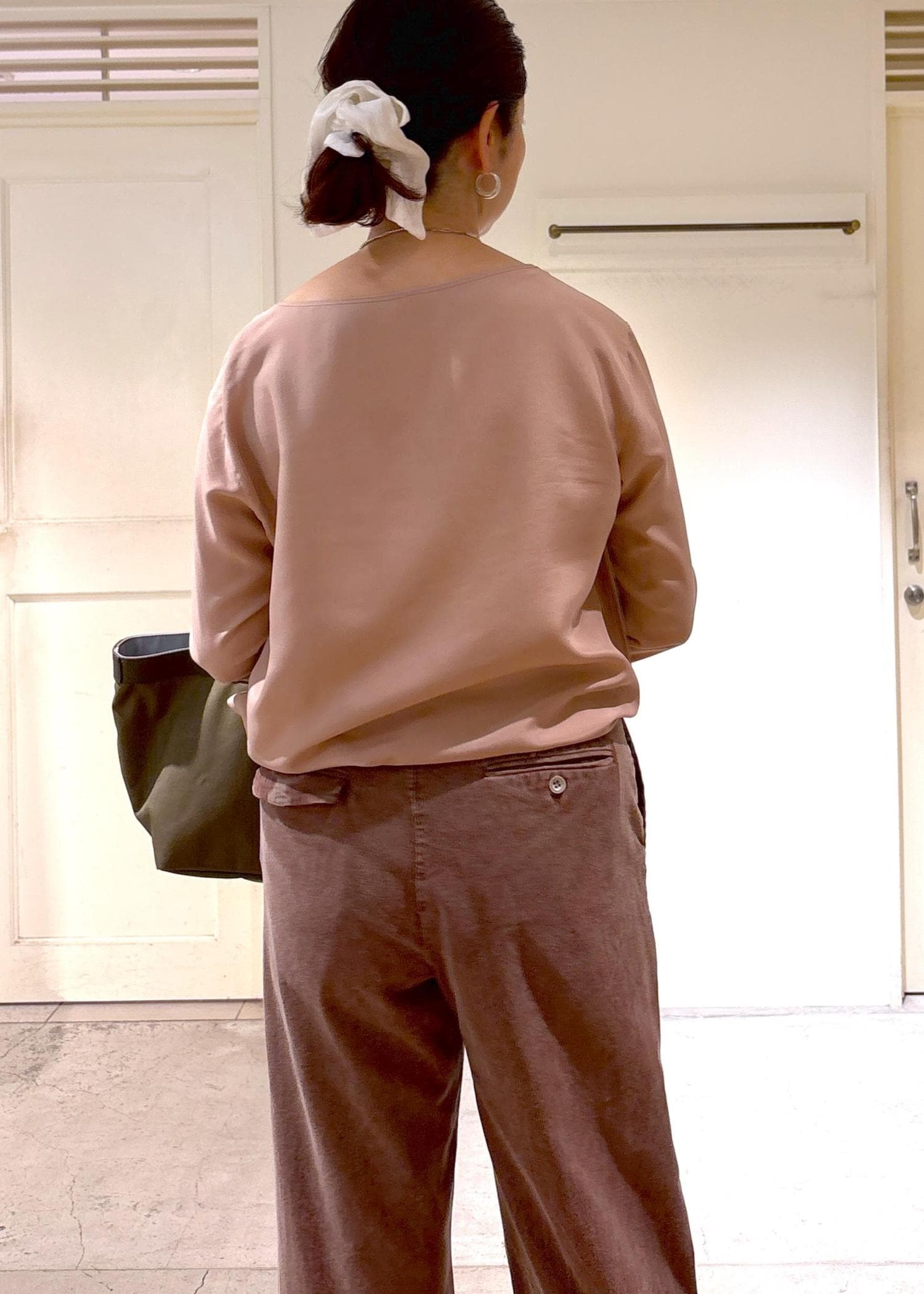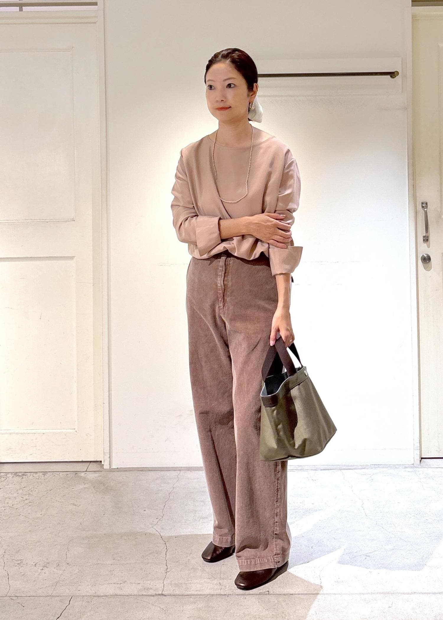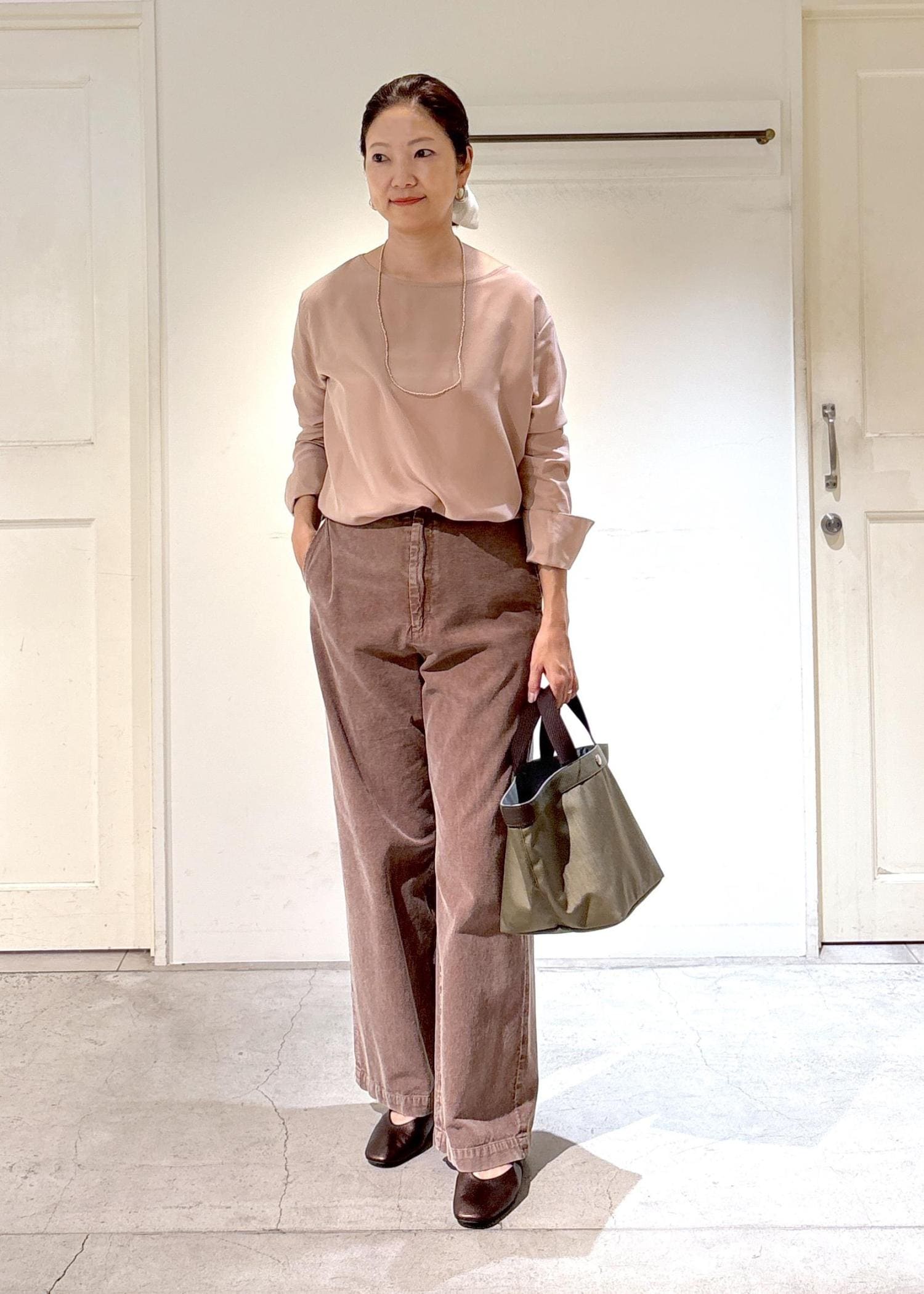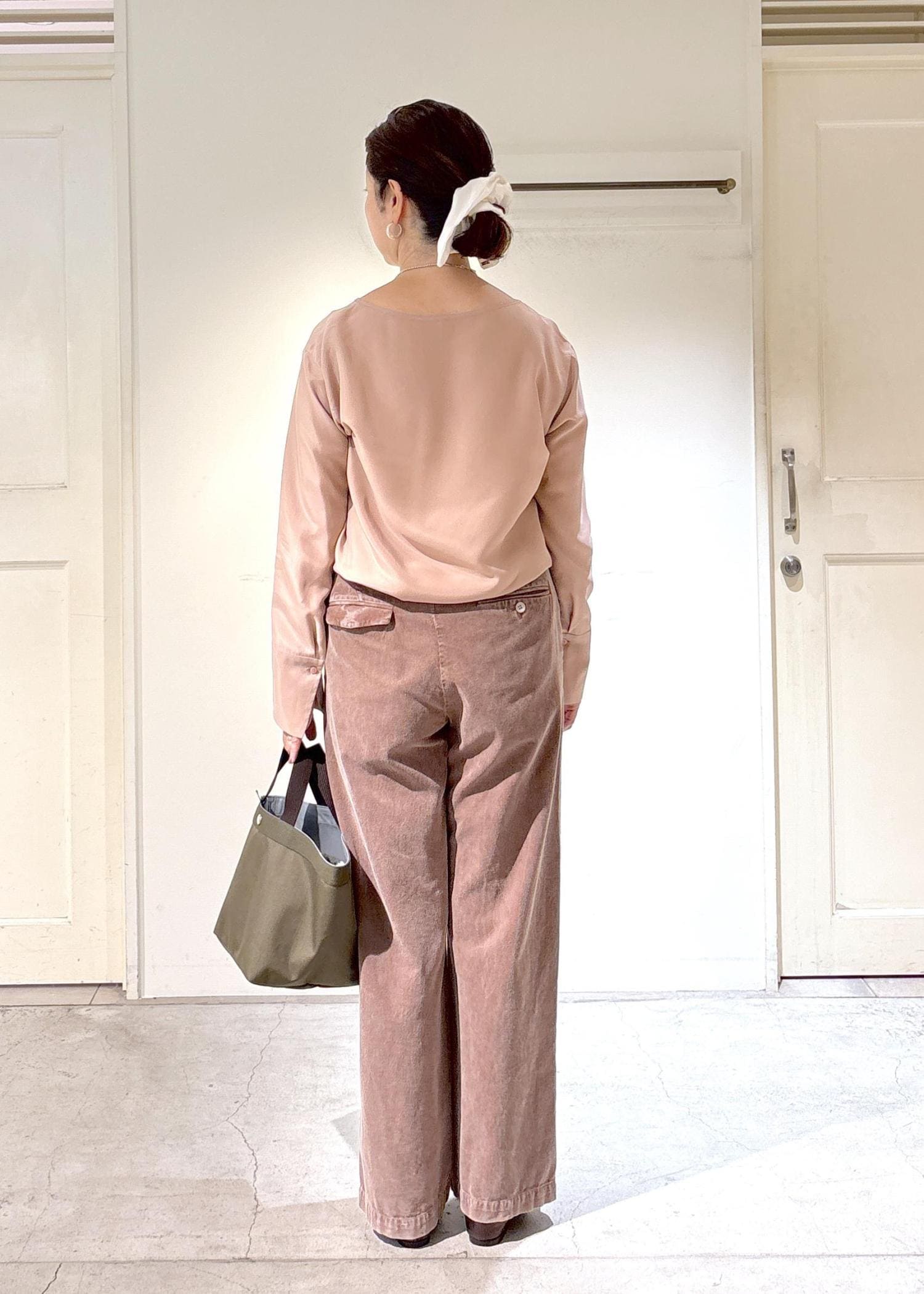 くすみピンクのシルクブラウスとヴィンテージ感のあるコーデュロイパンツを合わせた、