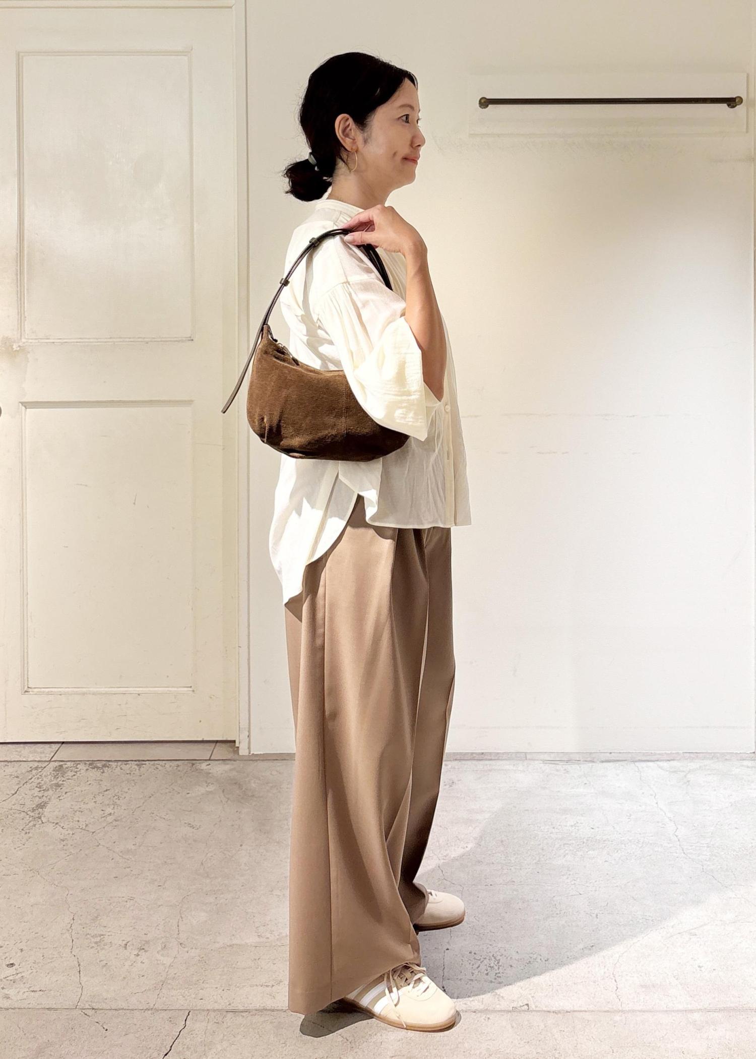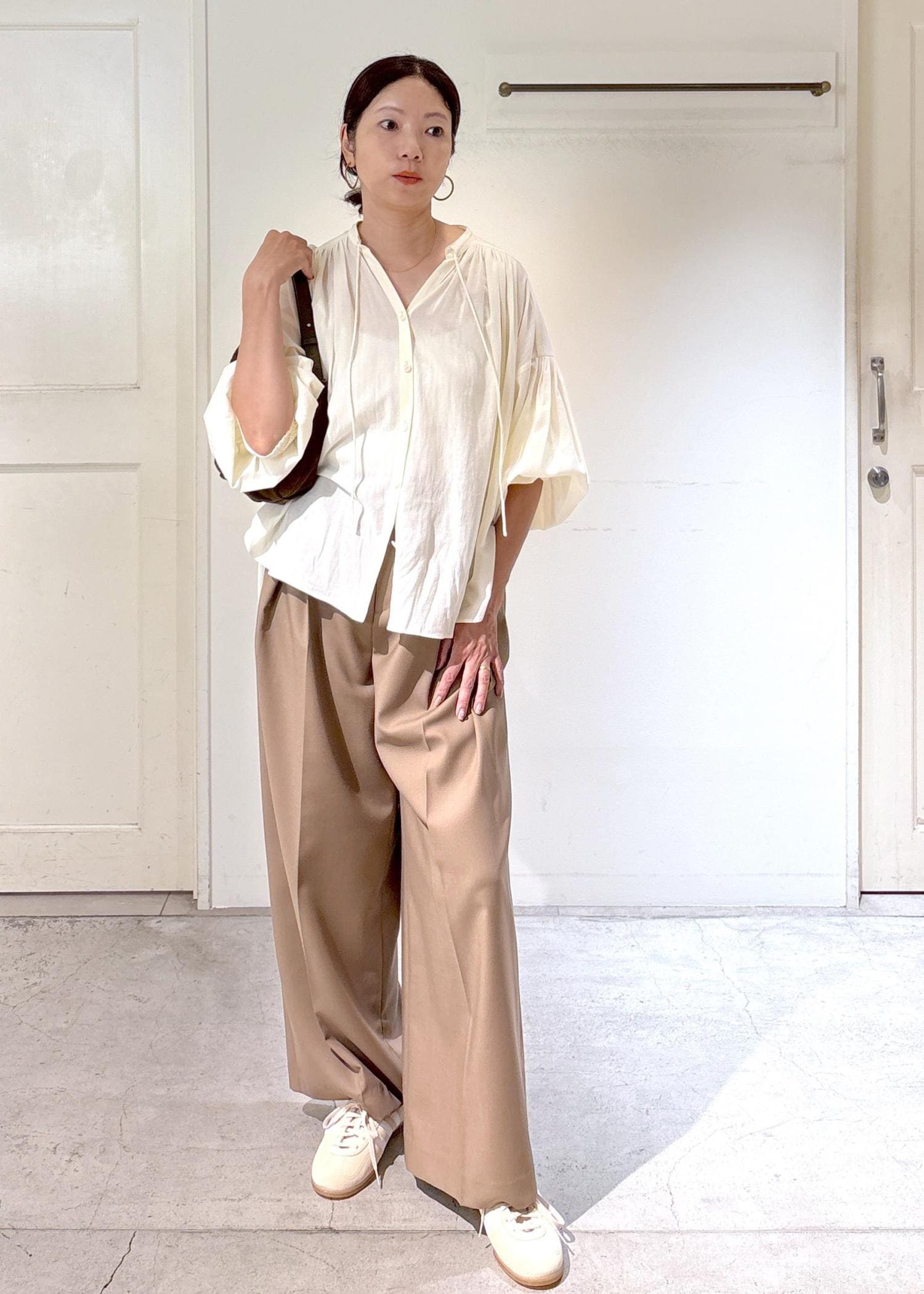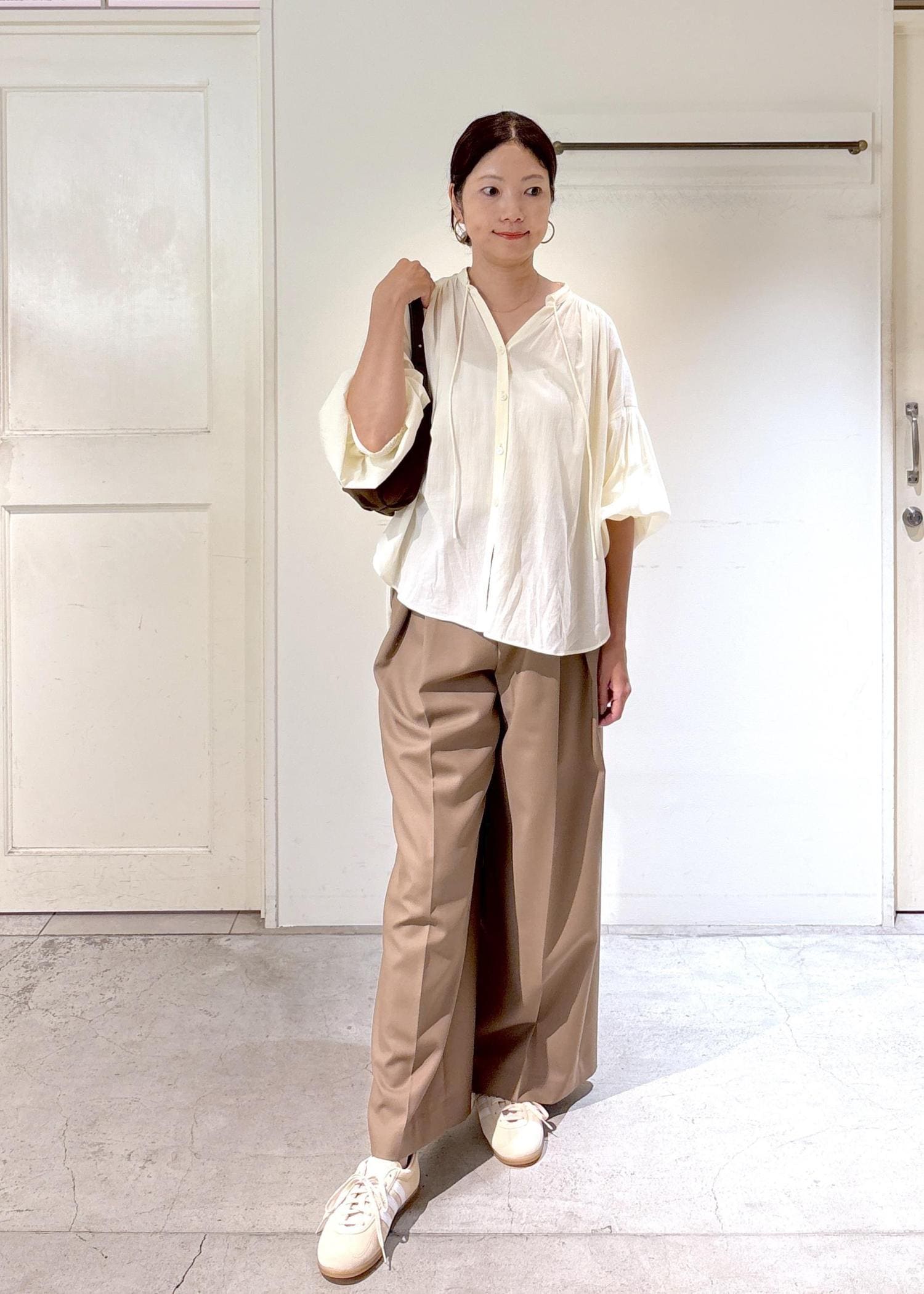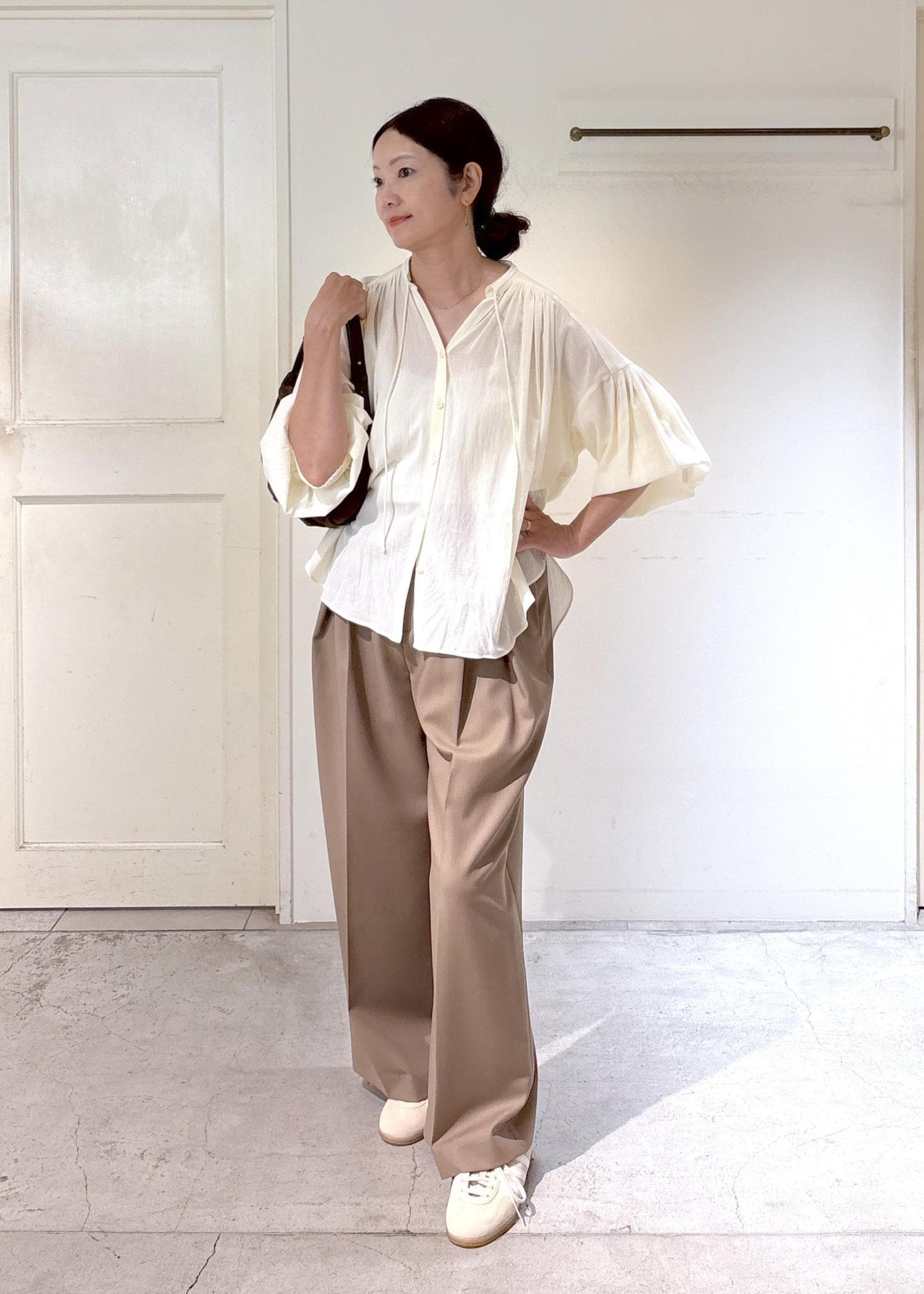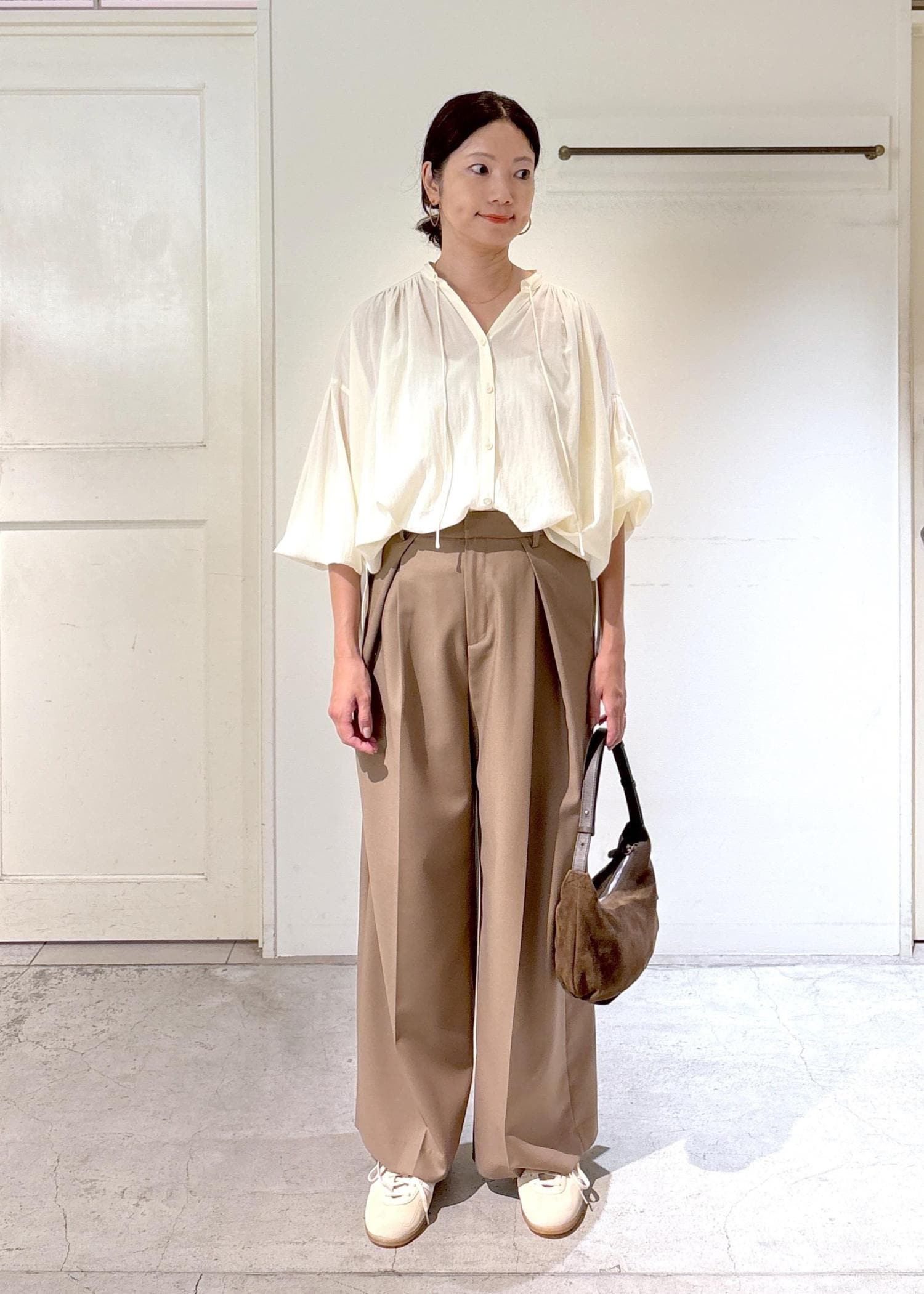 軽やかで秋を感じられるギャザーブラウスにタックパンツを合わせ、