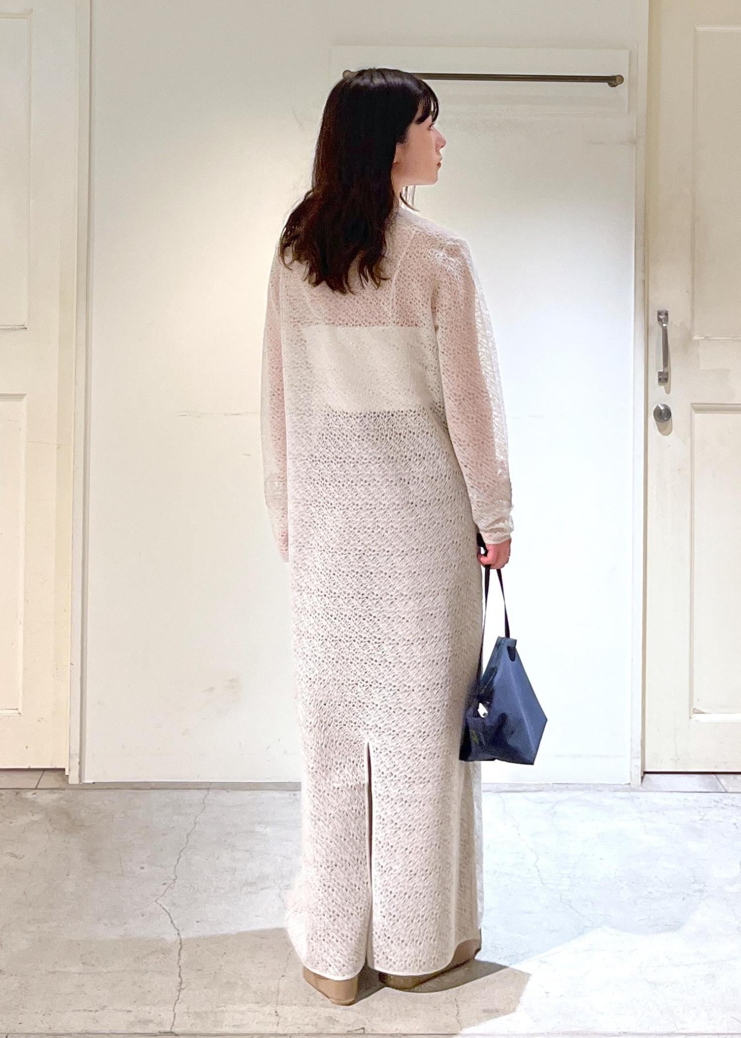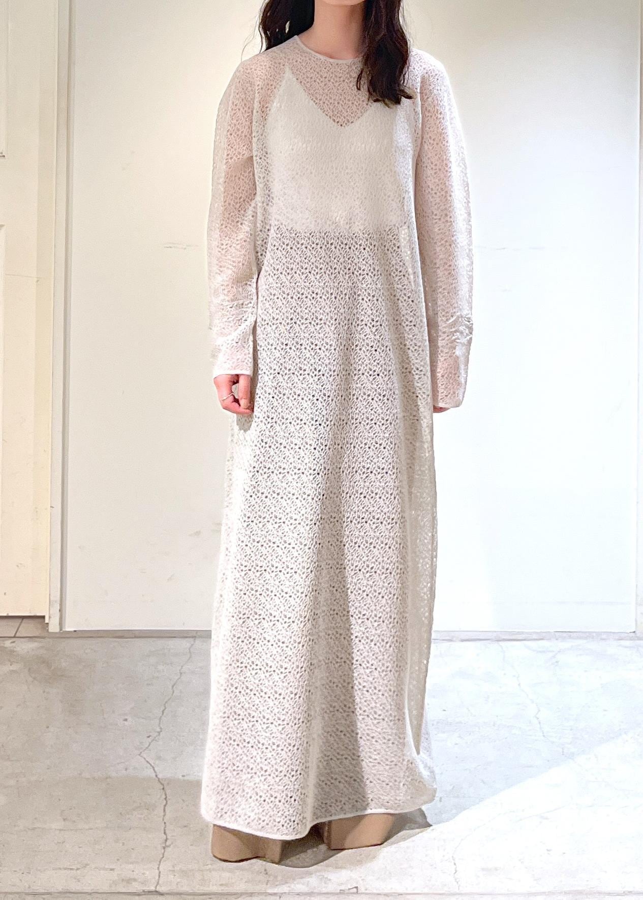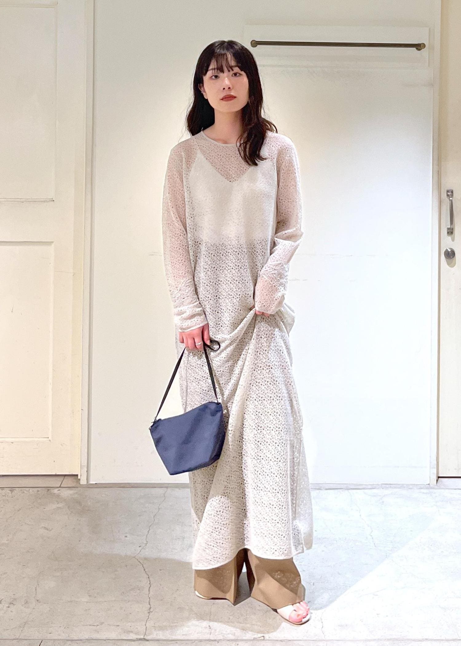 繊細なレース編みのナローシルエットのワンピース。袖先にはさりげないフラワー刺繍がデザインされています。 -