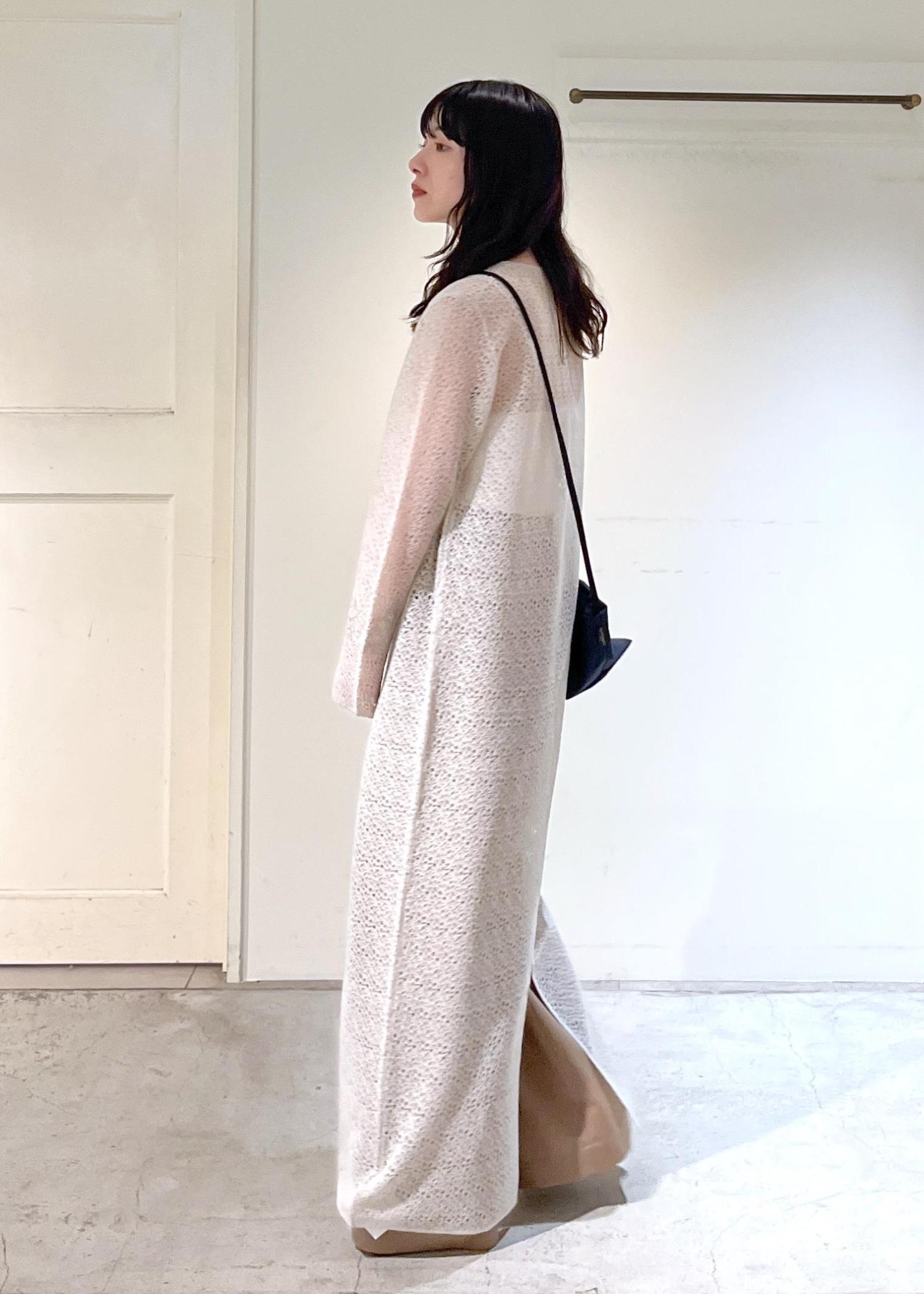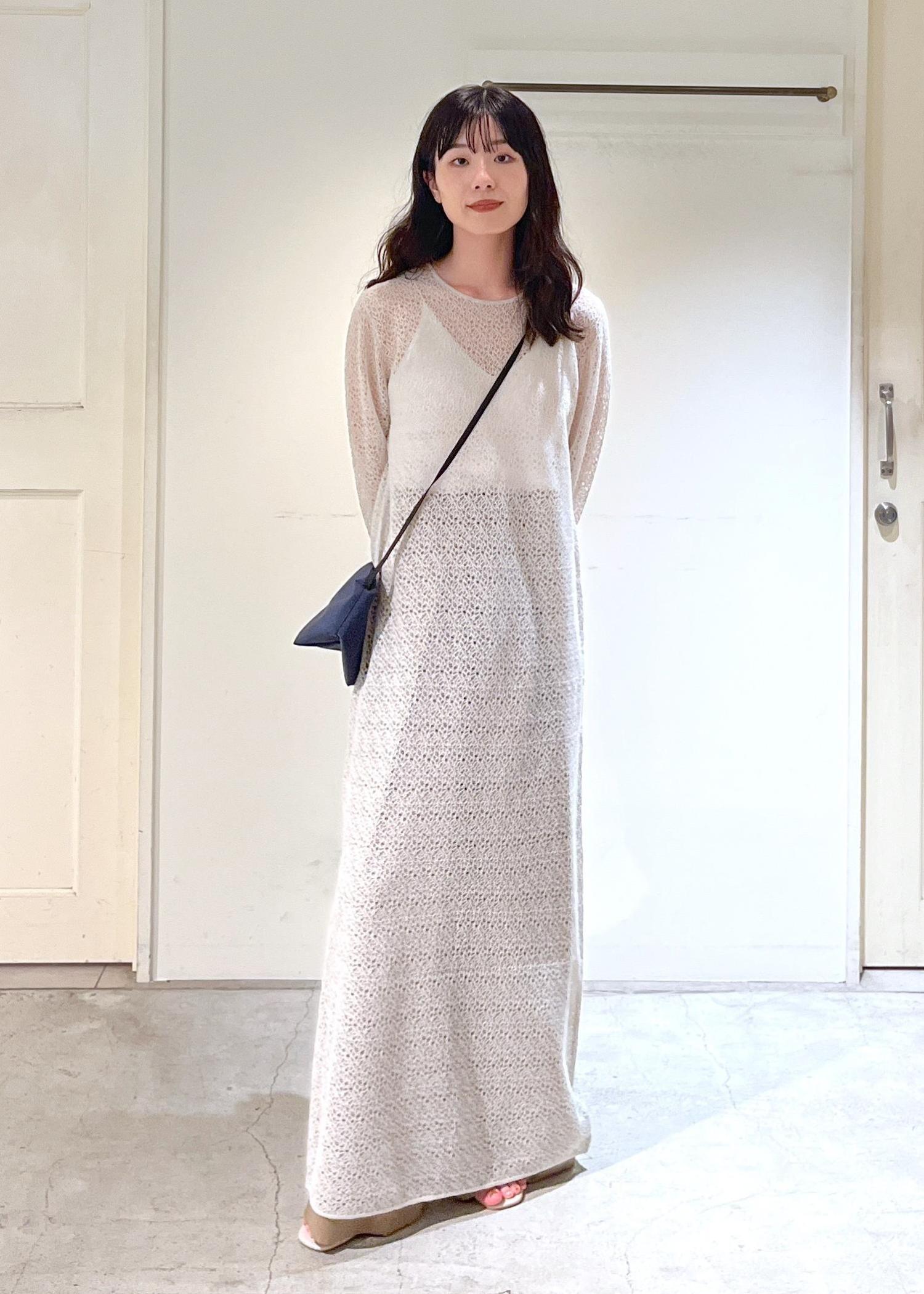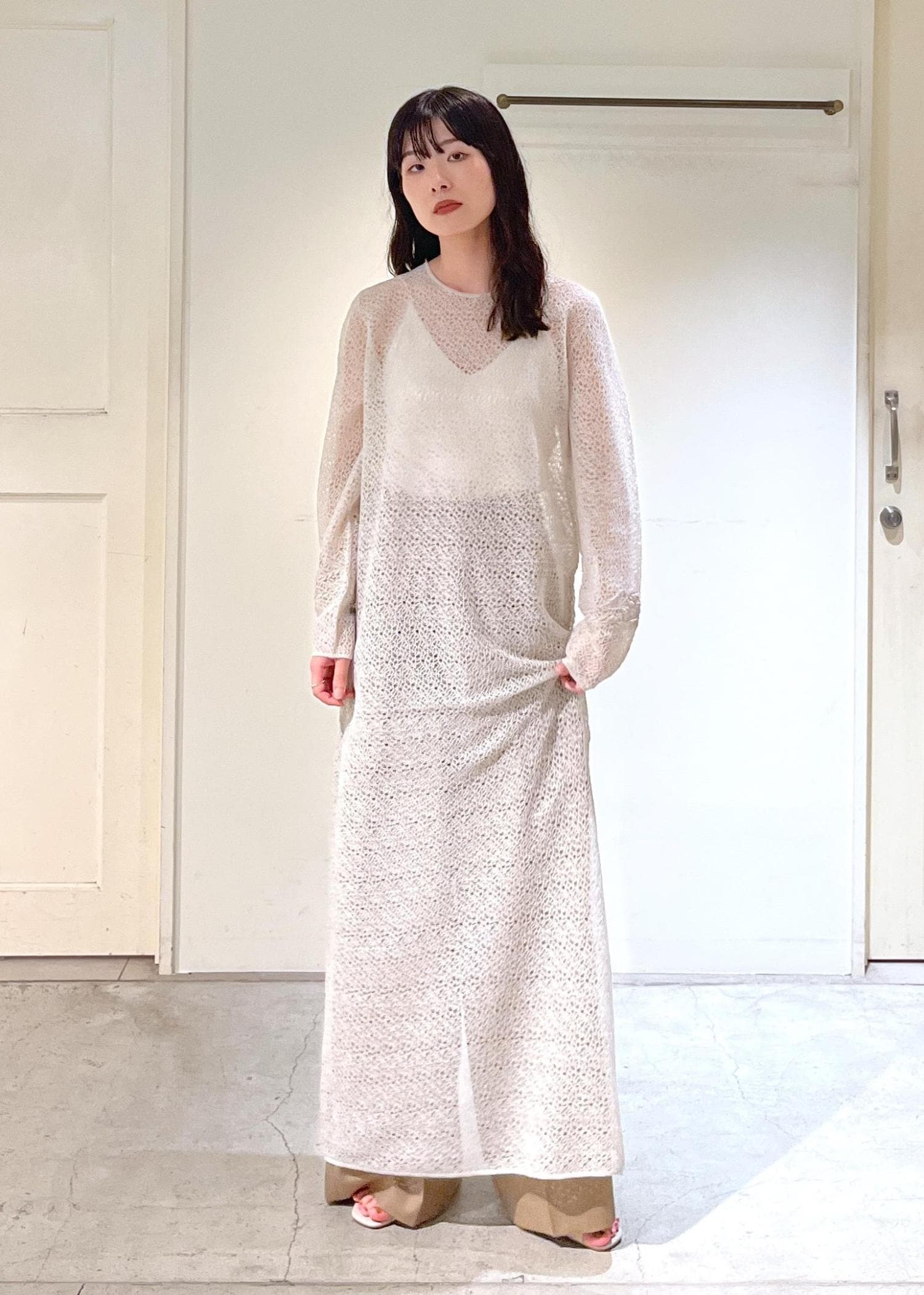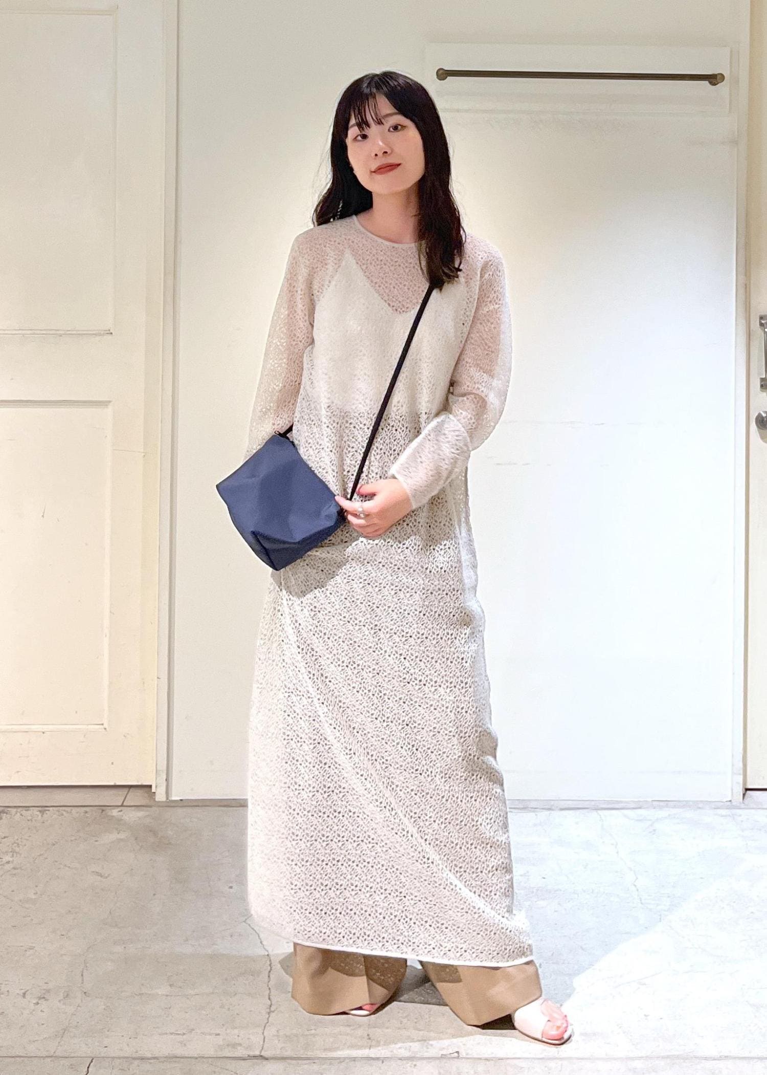 繊細なレース編みのナローシルエットのワンピース。袖先にはさりげないフラワー刺繍がデザインされています。 -