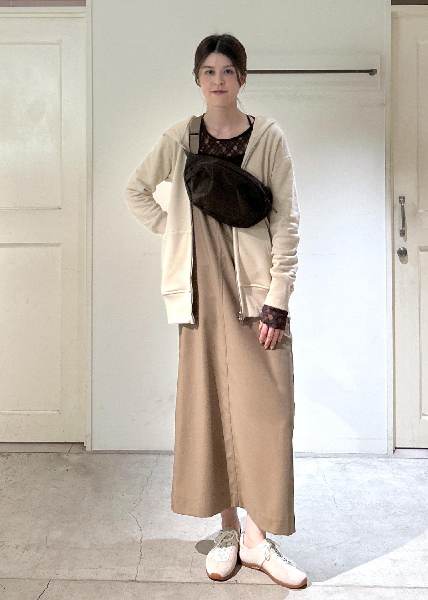 ジャンパースカートにシアーレースを合わせて、パーカーでカジュアルダウン!アウターありとなしで雰囲気が変わるので、オススメです◎