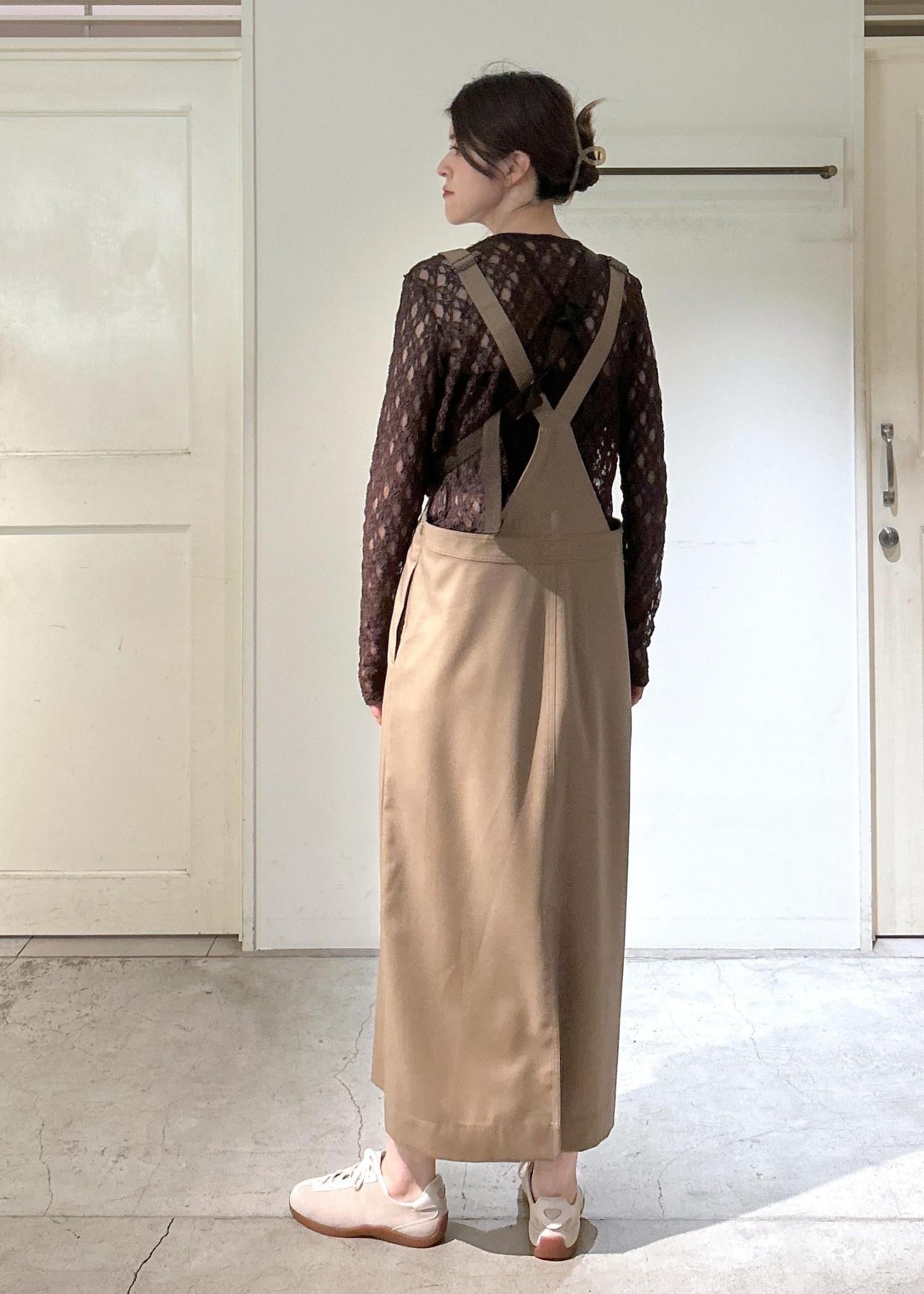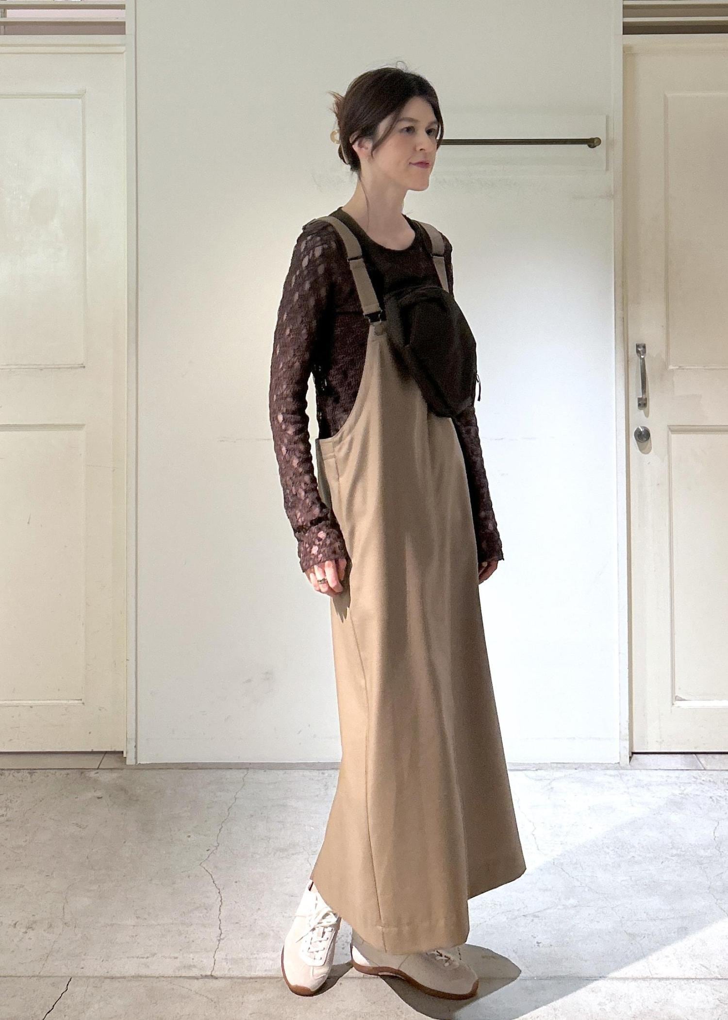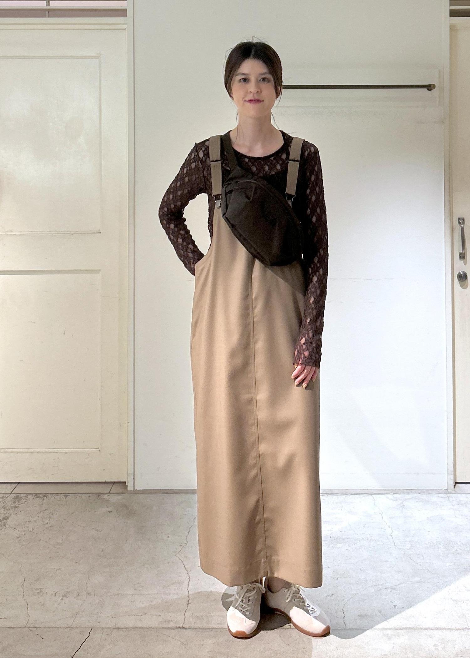 ショルダーベルトが長さ調節できるので、身長171cmでも安心して着られました。身幅はゆったりしているので厚手のニットなども中に着れます。バックスリットが入っているので、足捌きも楽です。