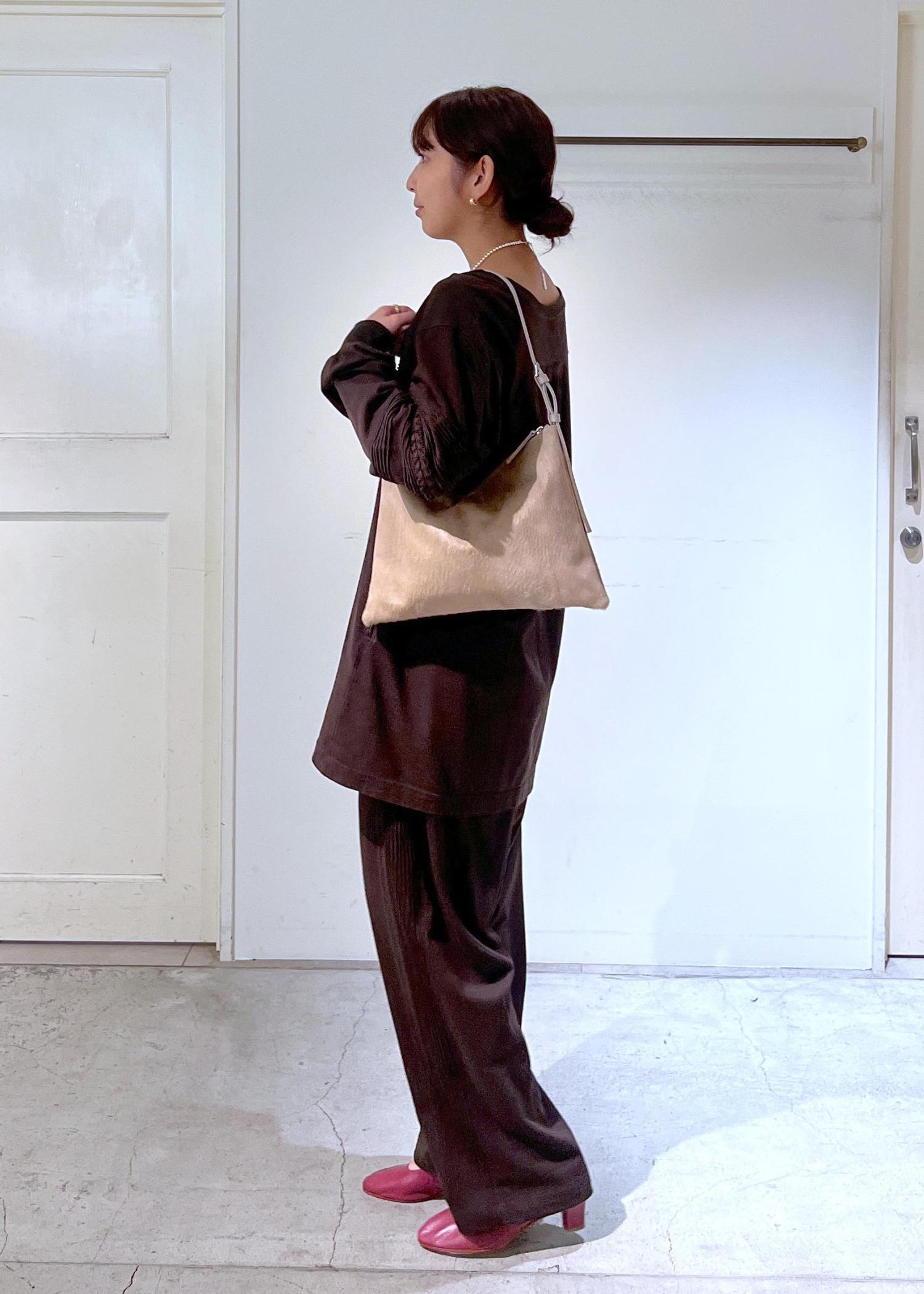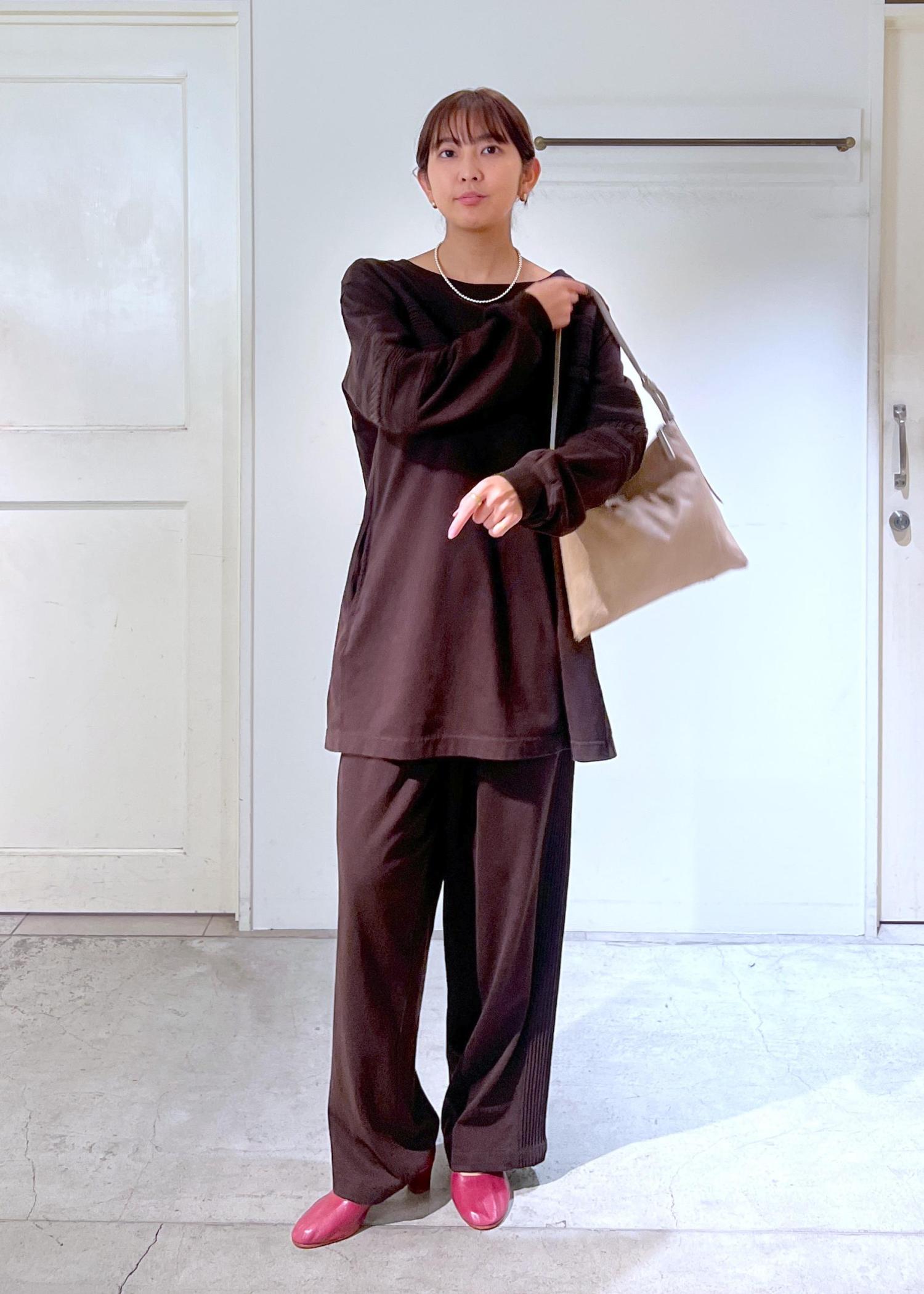 上品なブラウンだったので、シューズやバッグも綺麗めに合わせてみました。