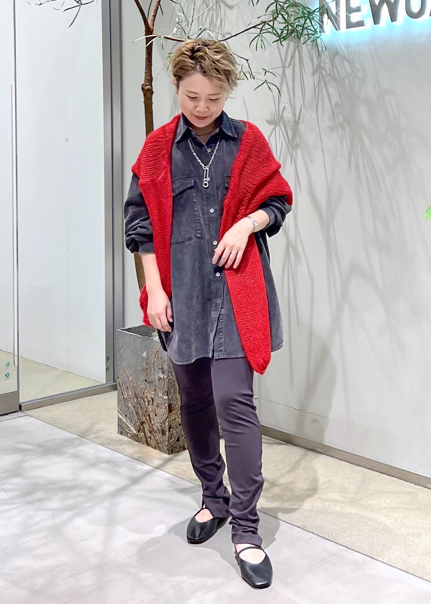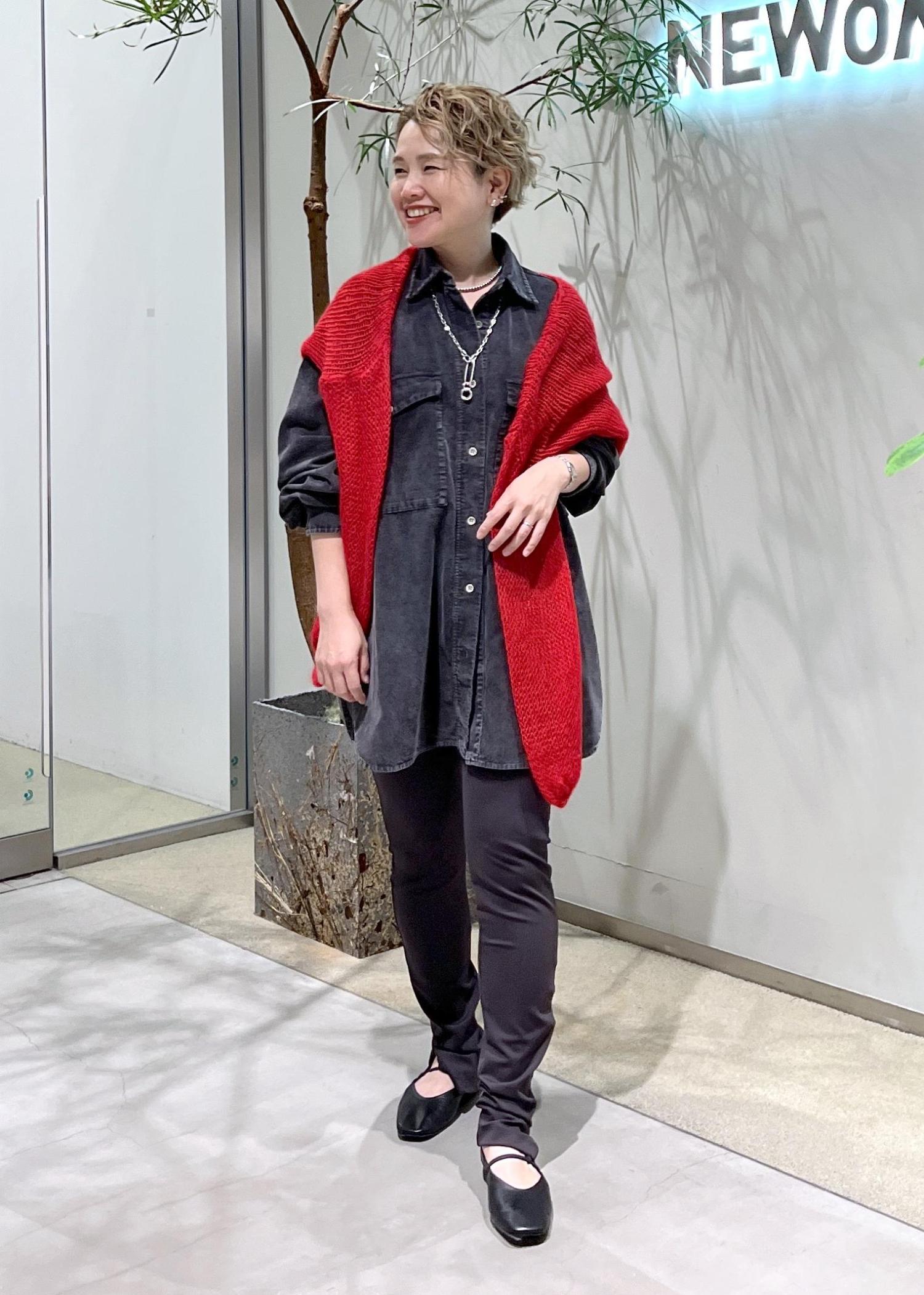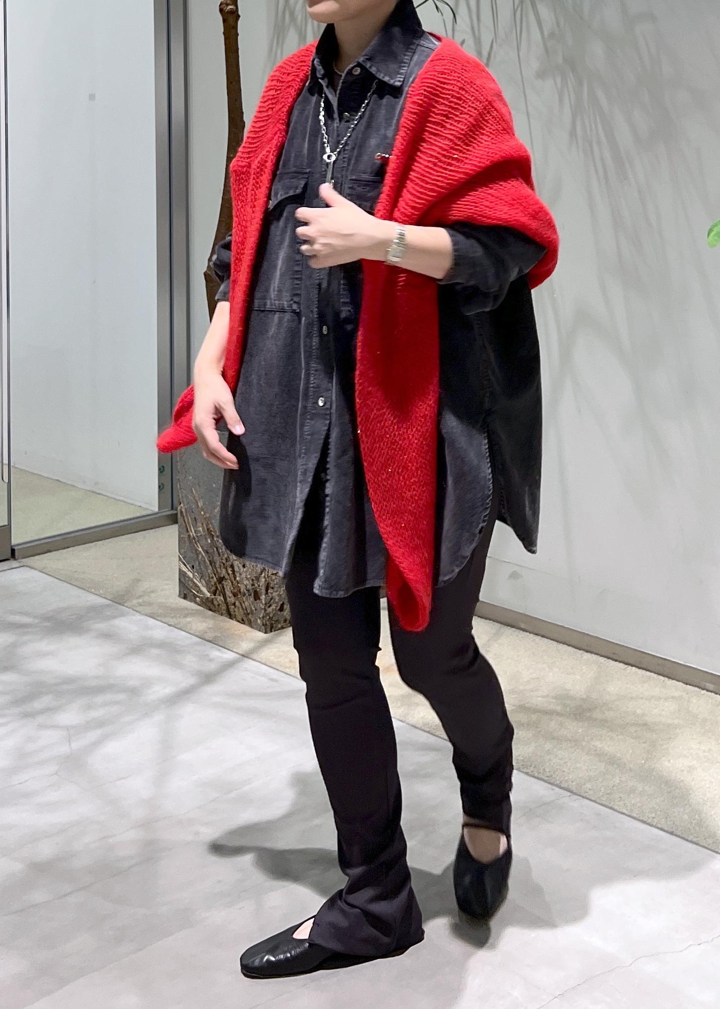 グレーでまとめたシンプルなスタイリングにモヘアの赤で、半歩先の季節感とインパクトをプラスしました♡