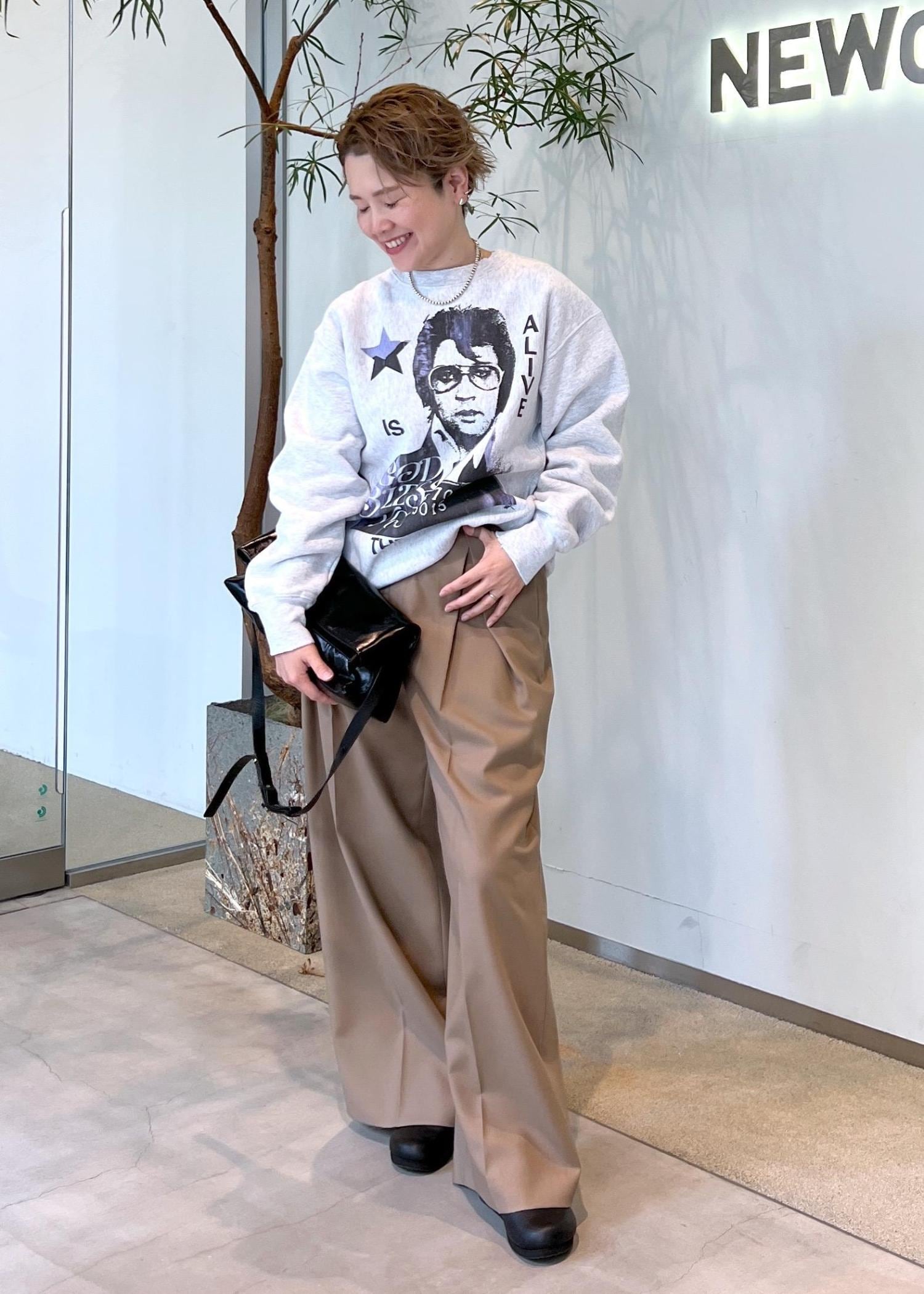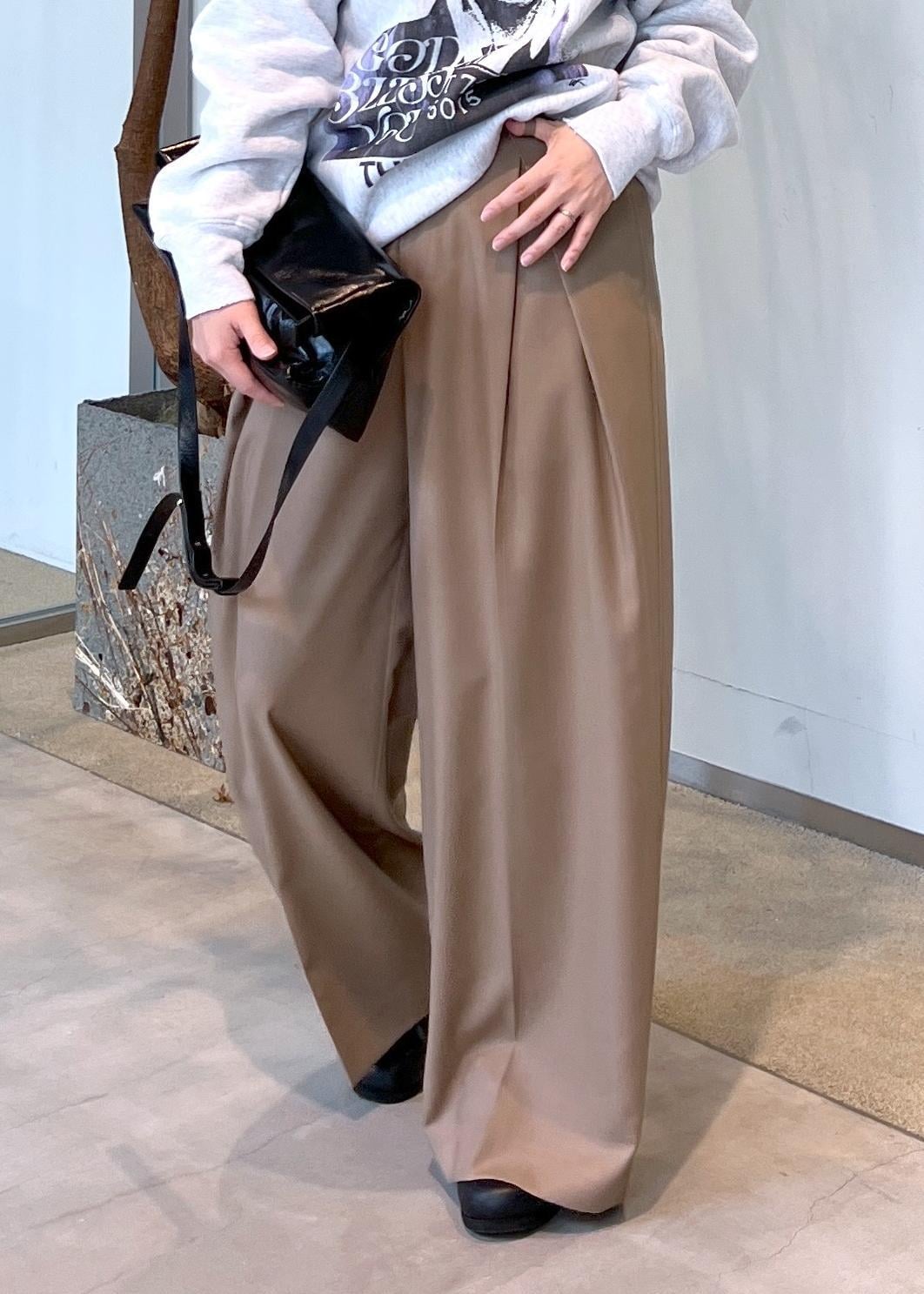 サラッと落ち感があり、ワイドパンツながらスッキリしたシルエットです。素材にハリとツヤがあり、キレイめな印象なのでお仕事にもオススメです。 -