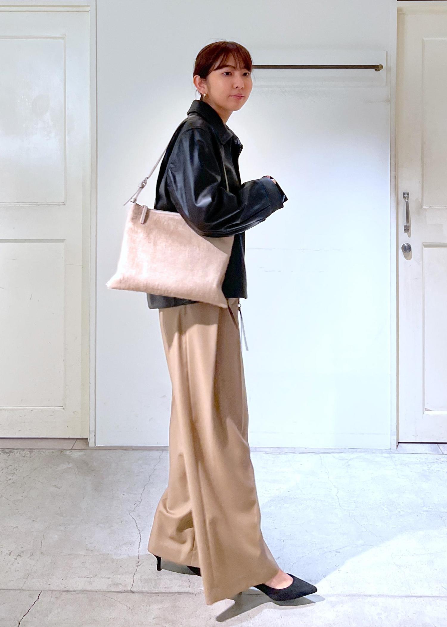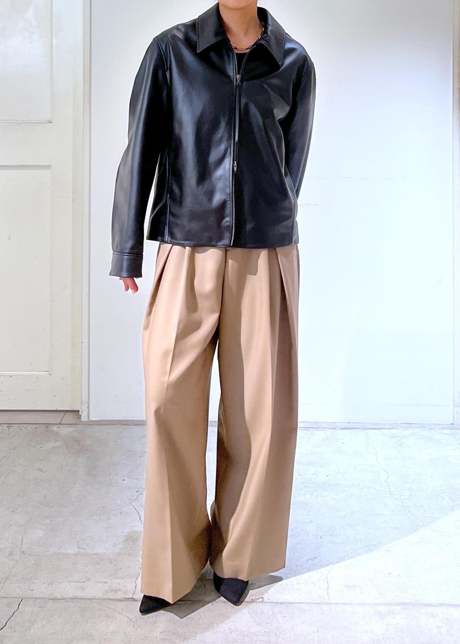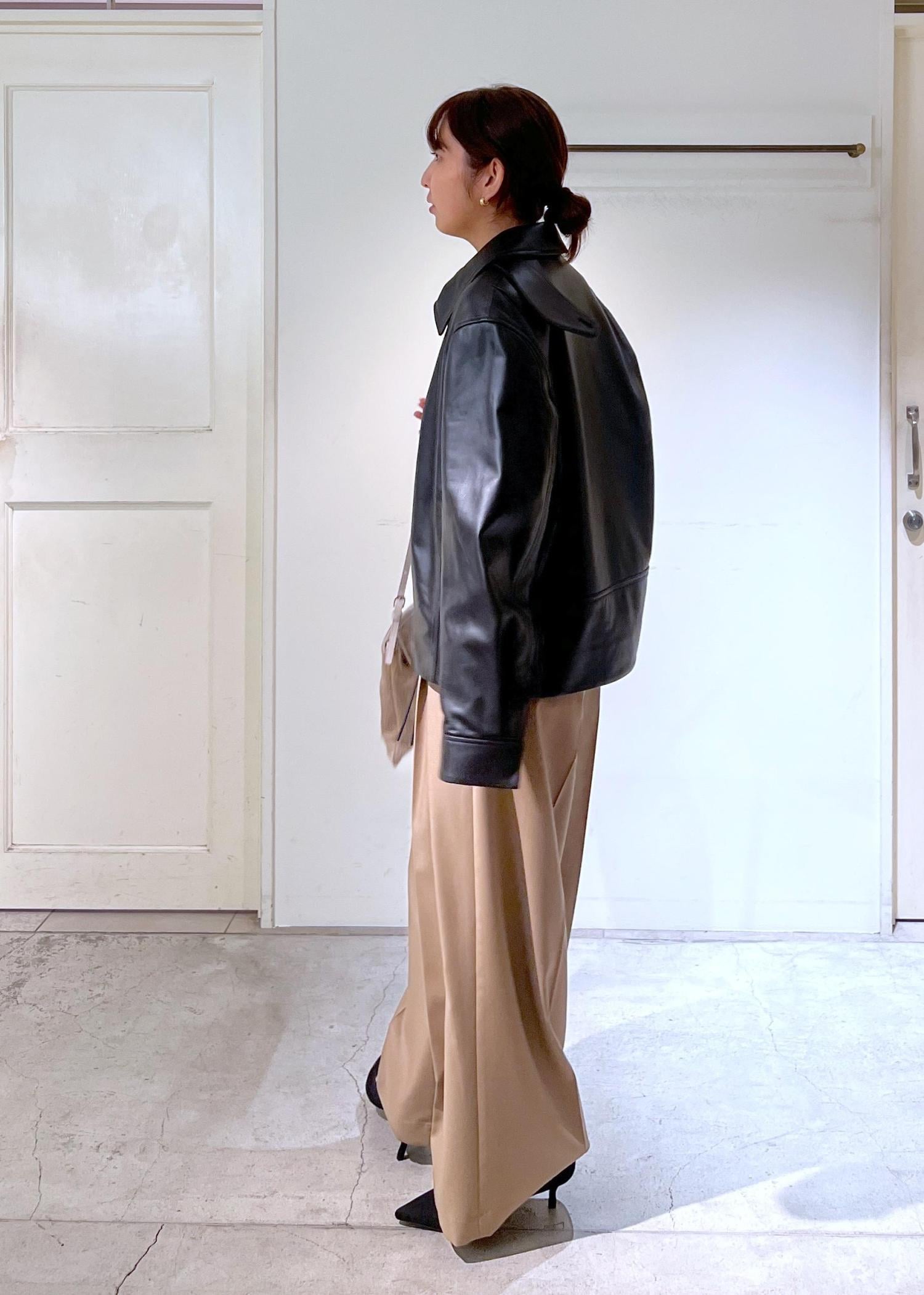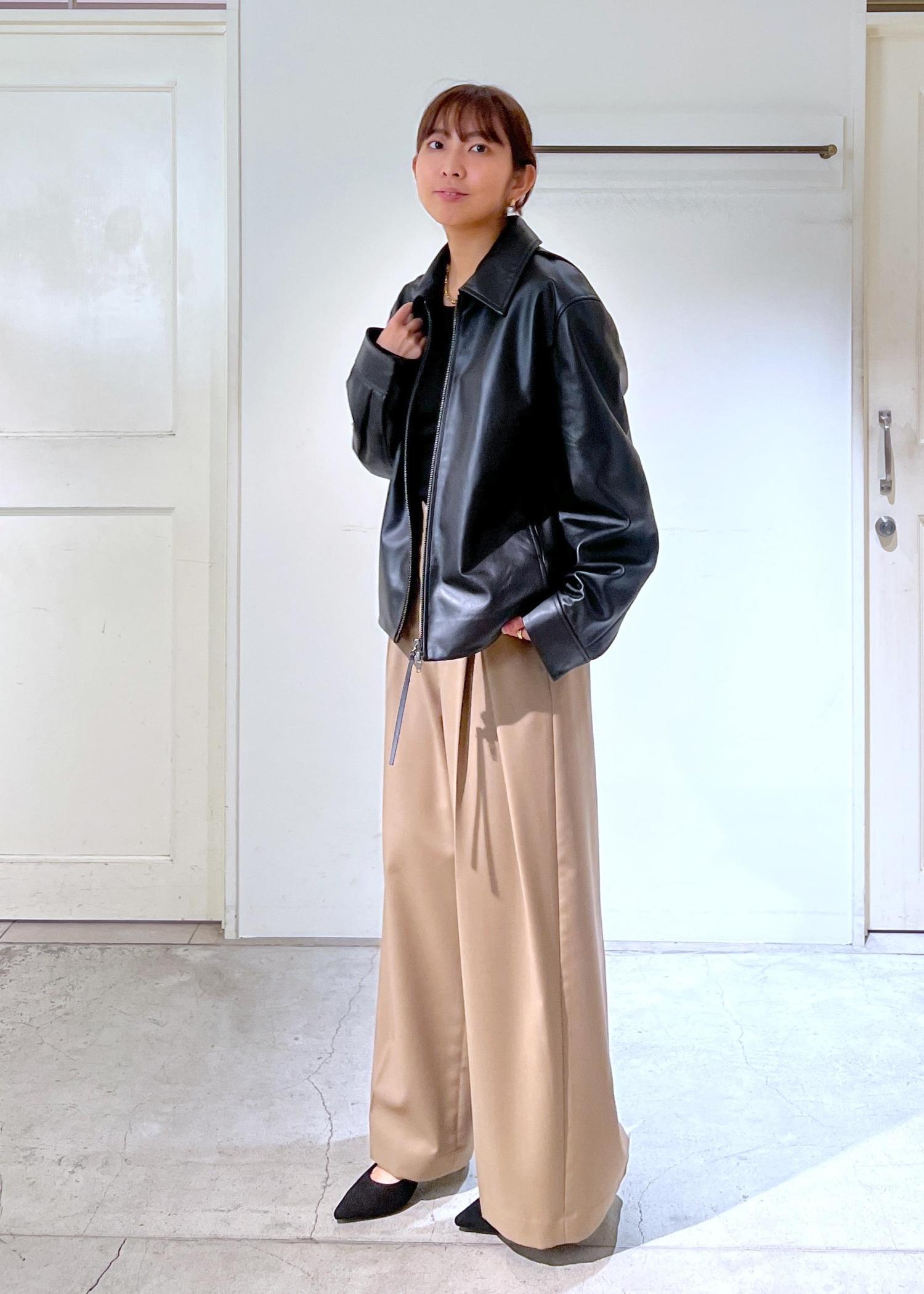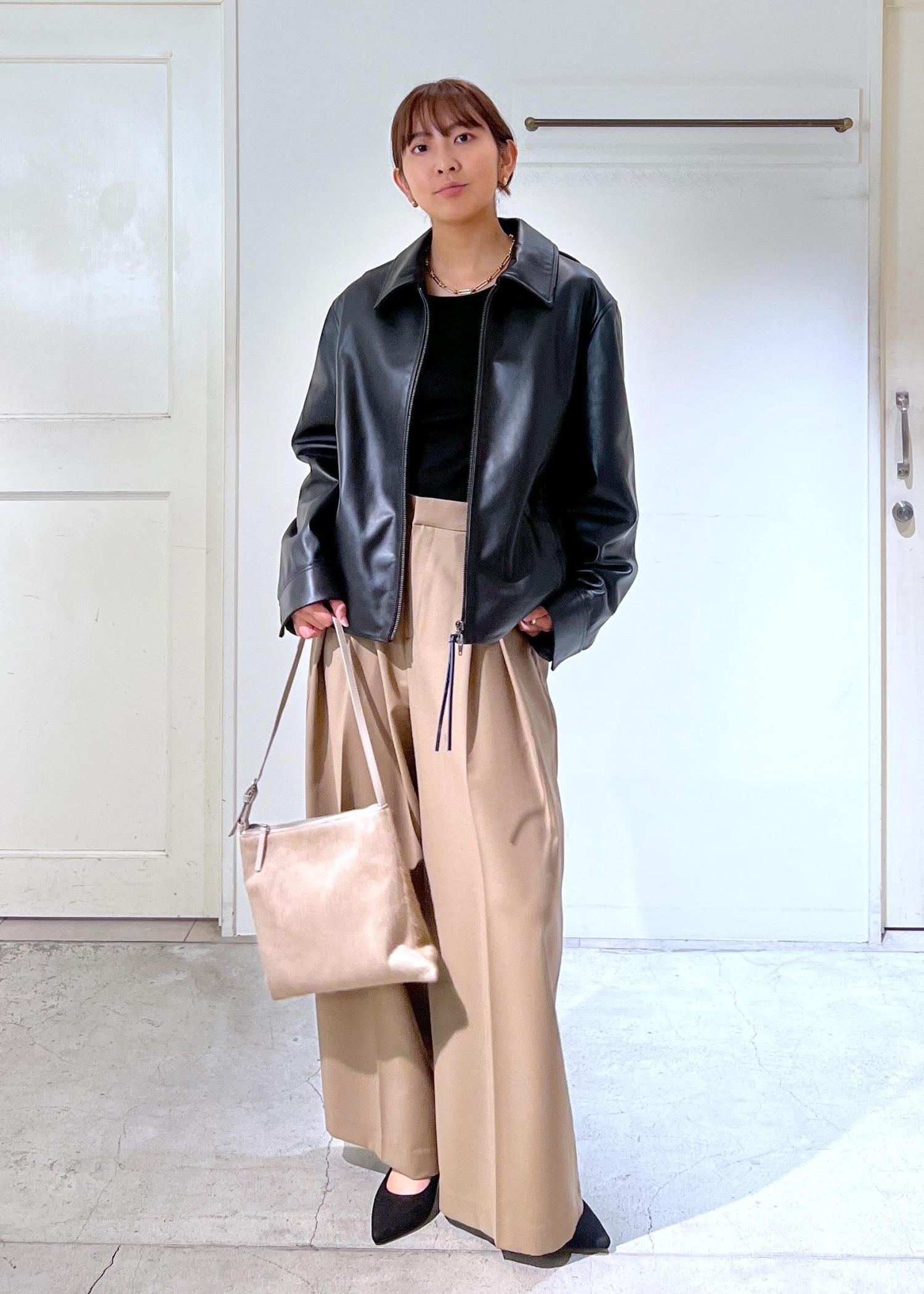 しっとりした光沢感のレザーブルゾンをマニッシュに合わせたくてワイドパンツと着てみました。