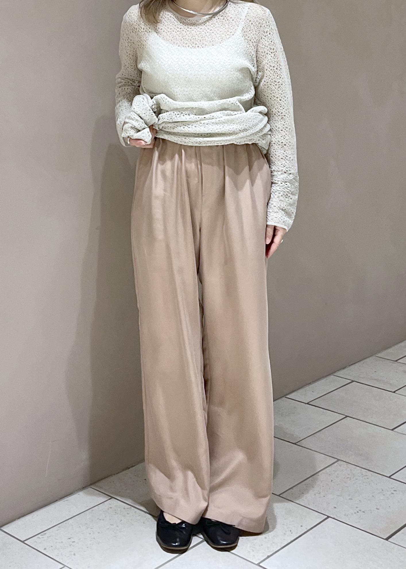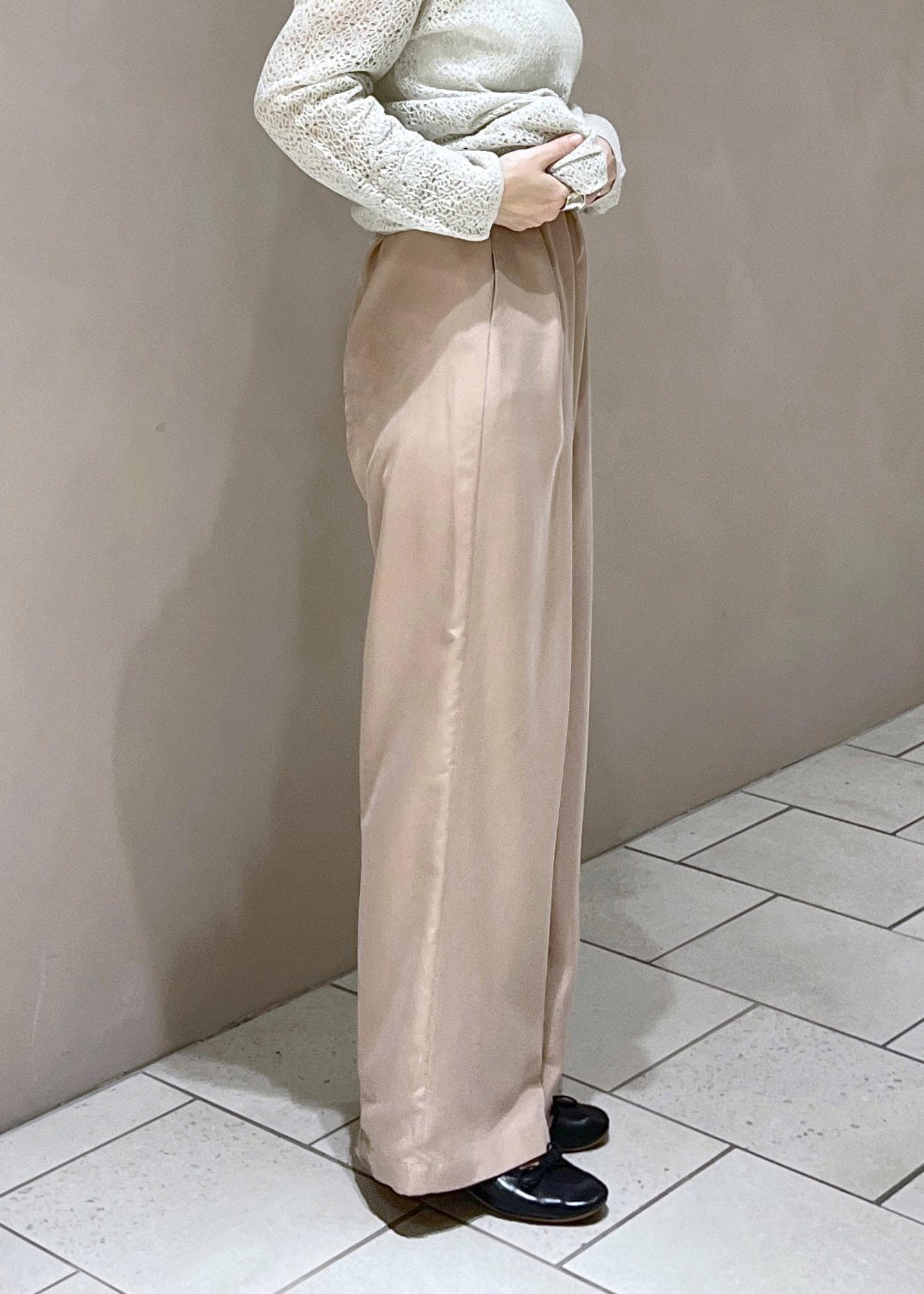 SALON adam et ropé[25AW]GENTLE SILK パンツ / セットアップ対応・洗えるピンク系 / S¥31,900レビュー丈はかなり長め。写真ではウエストを2つ折ってますが、それでもやや長め。低身長さんは丈詰めがおススメ。