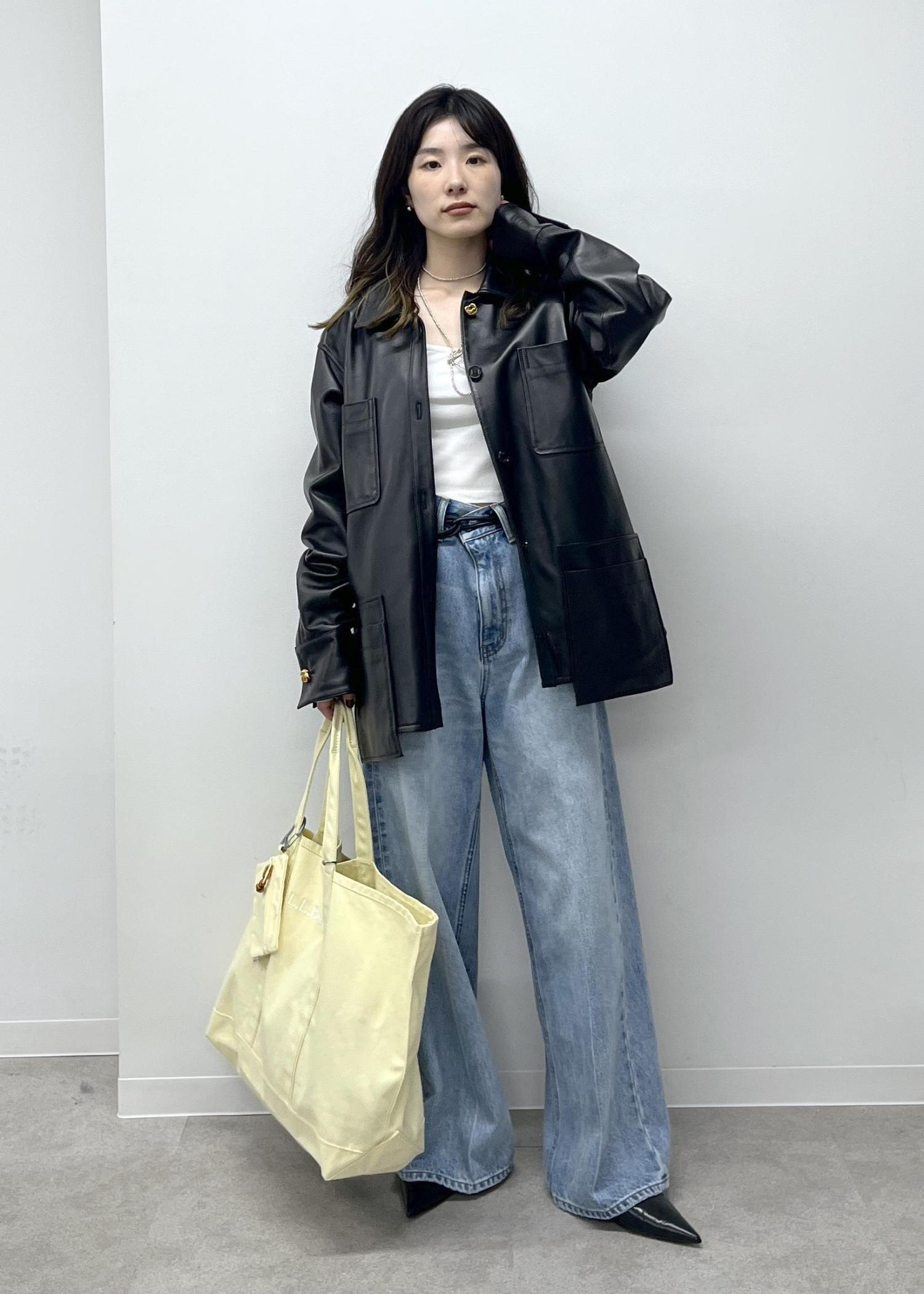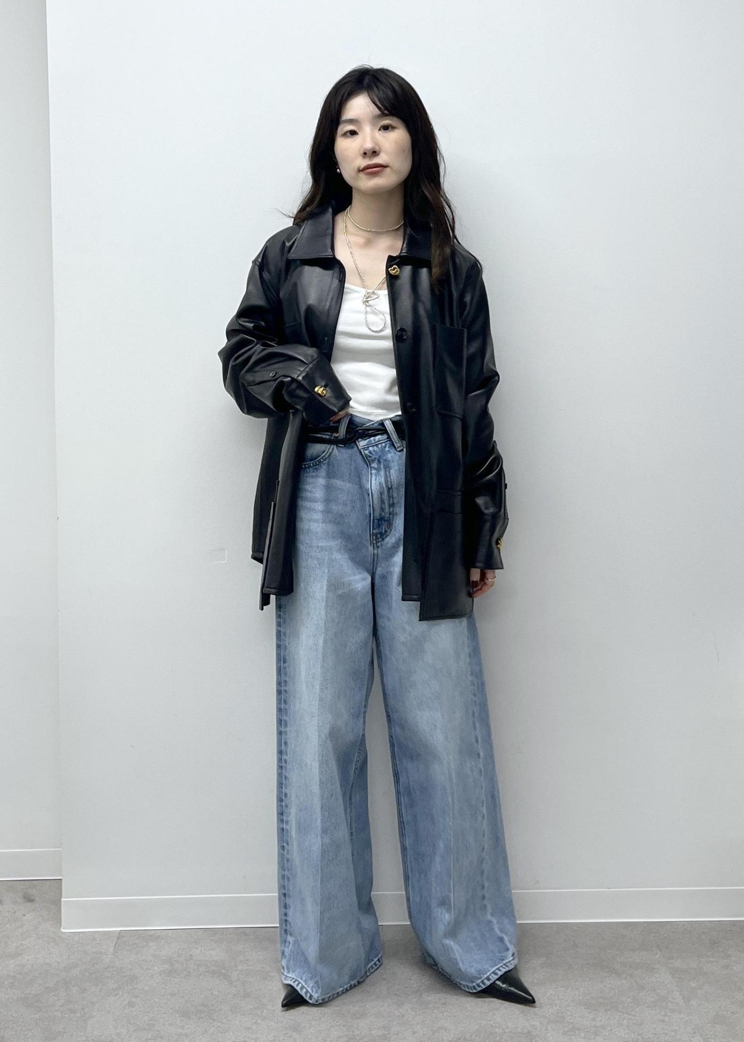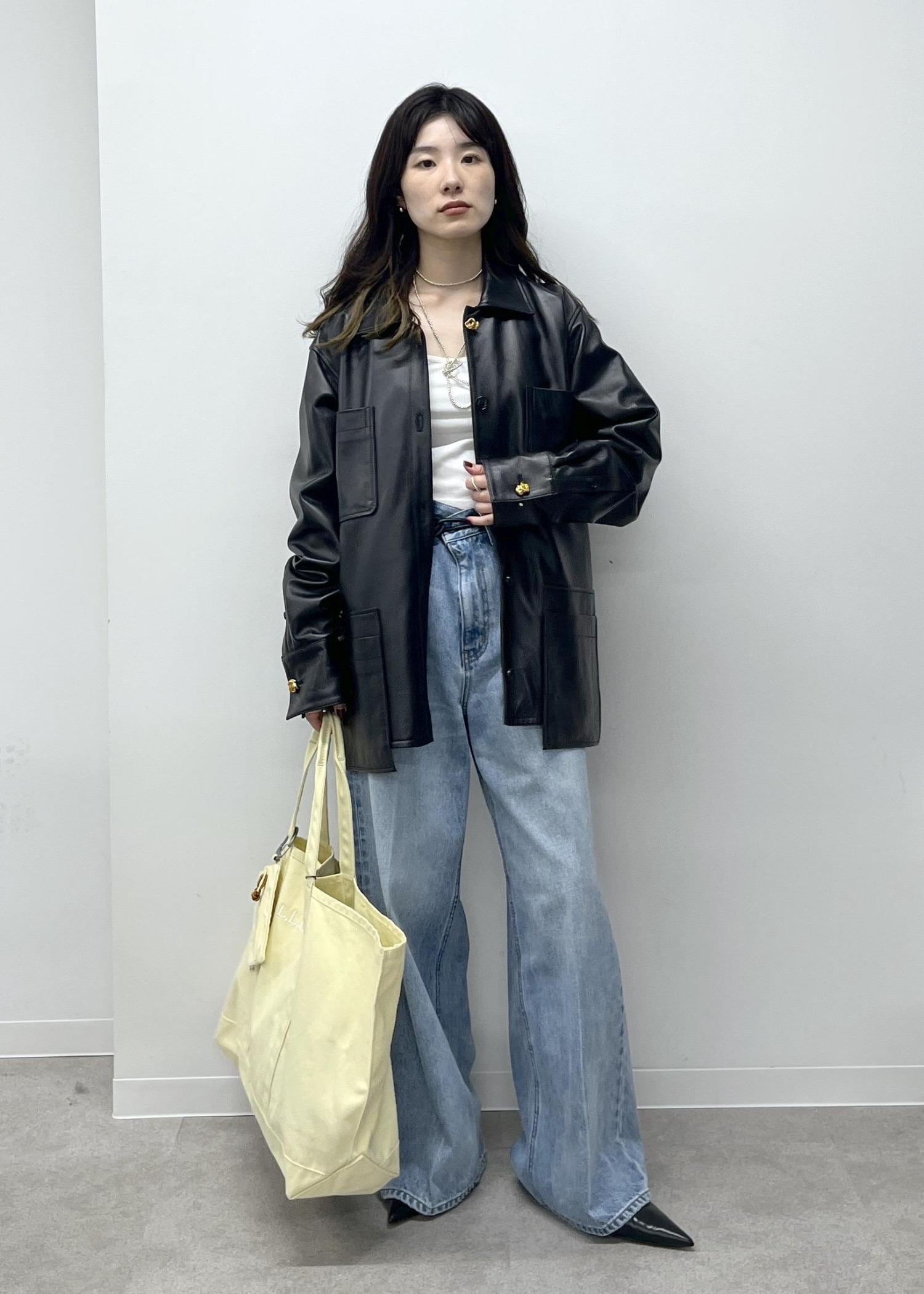 軽くて柔らかいラムレザー使用。レザージャケットですがオーバーシルエットなのでゆとりを持ってラフに着用できます。 -