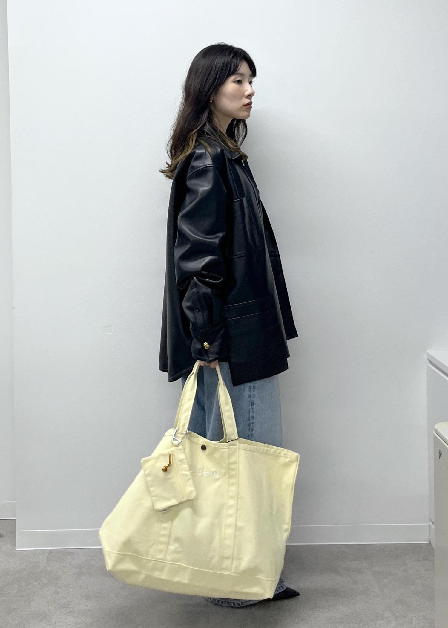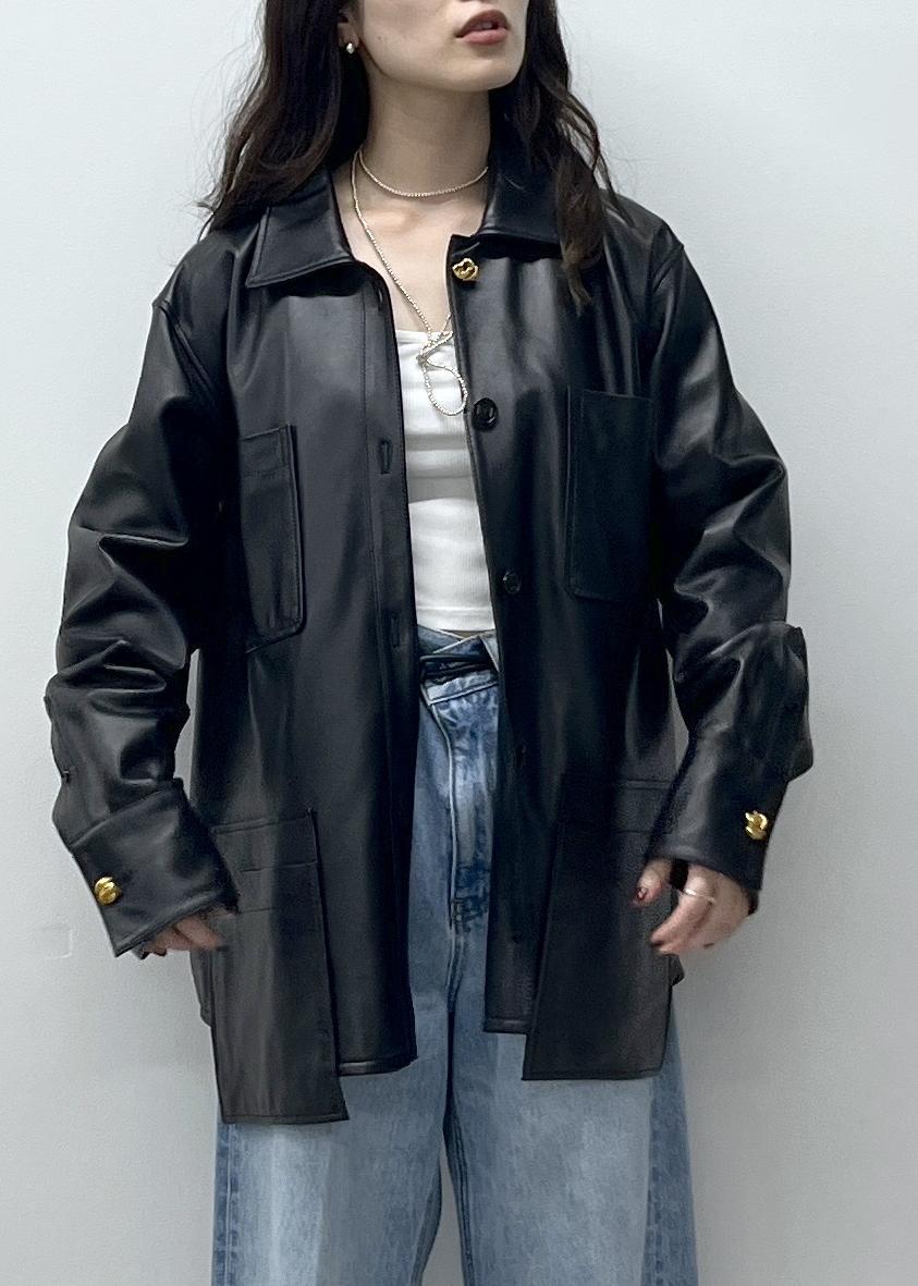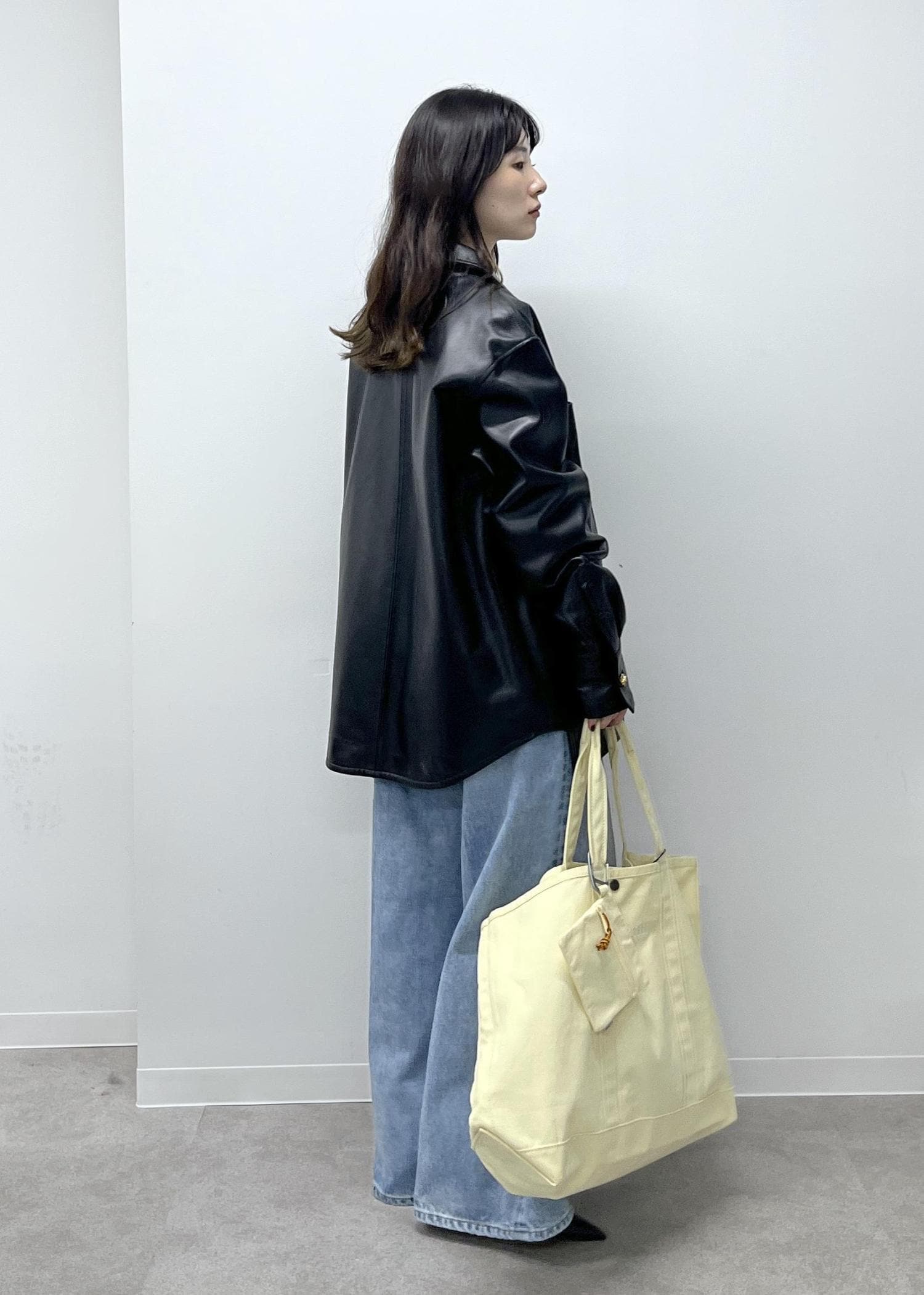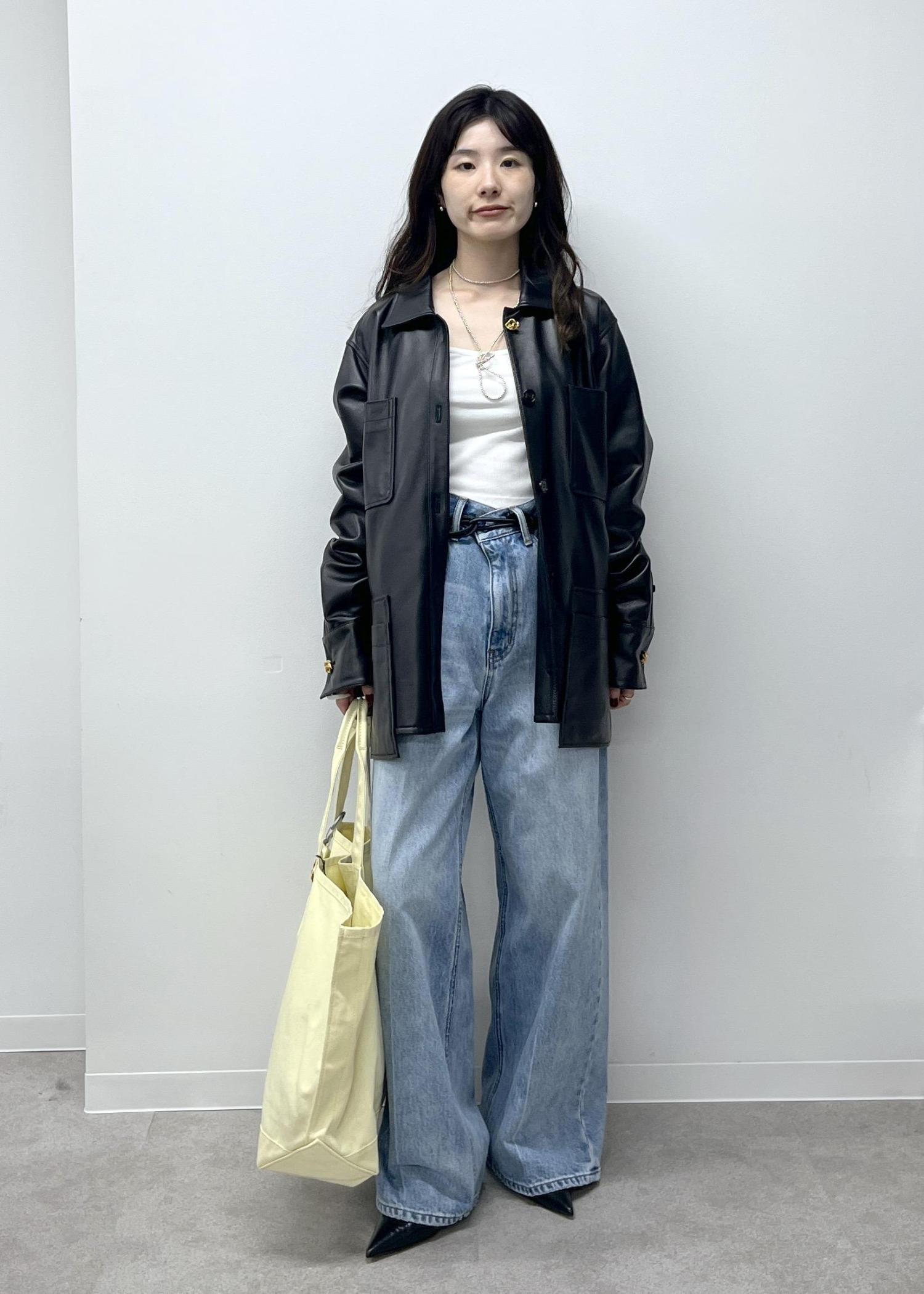 軽くて柔らかいラムレザー使用。レザージャケットですがオーバーシルエットなのでゆとりを持ってラフに着用できます。 -