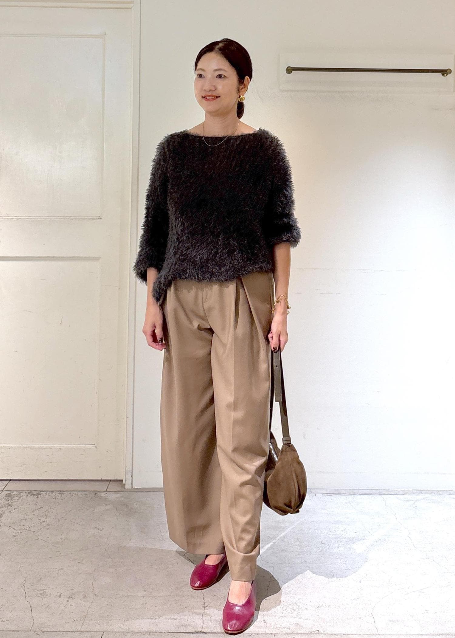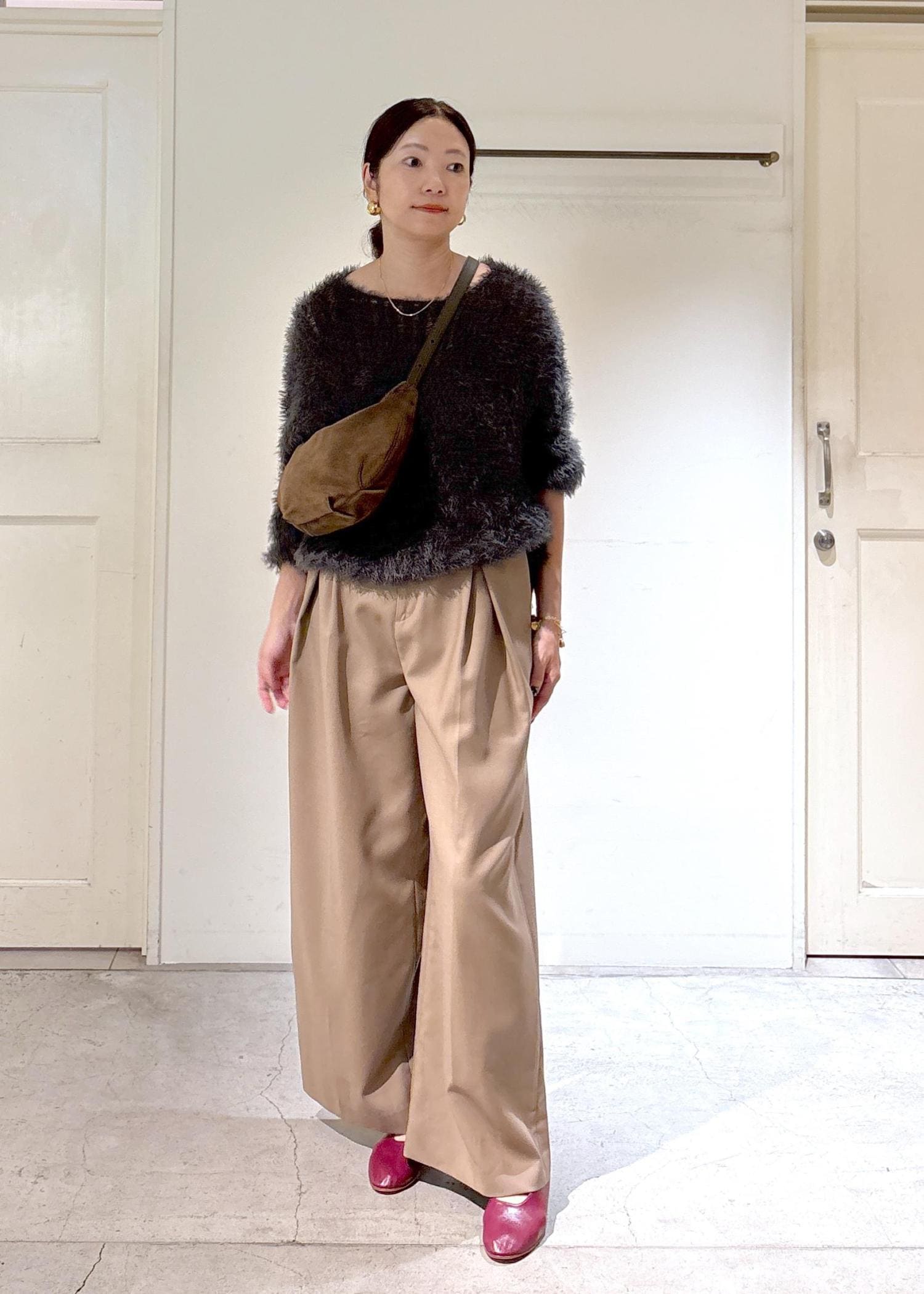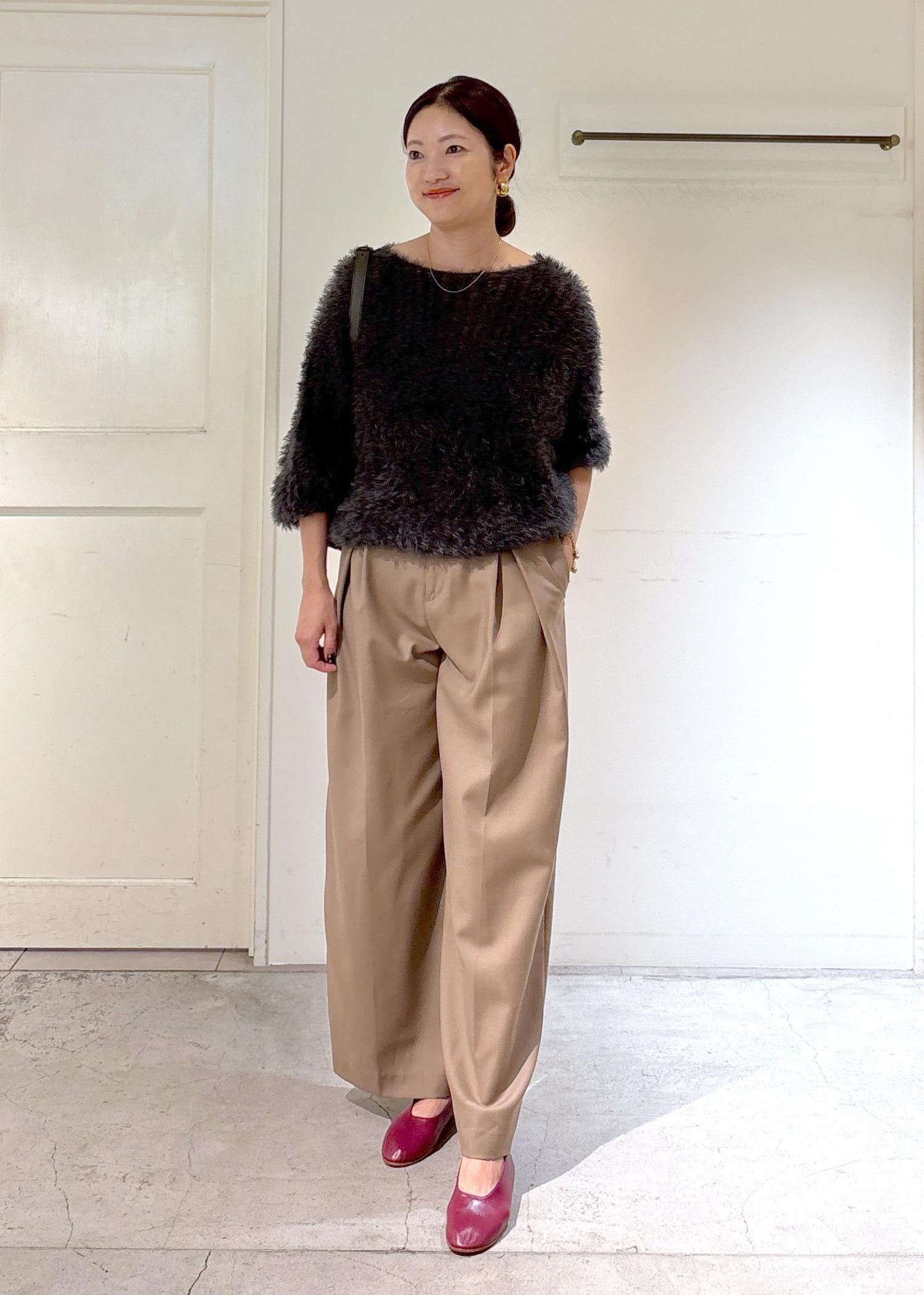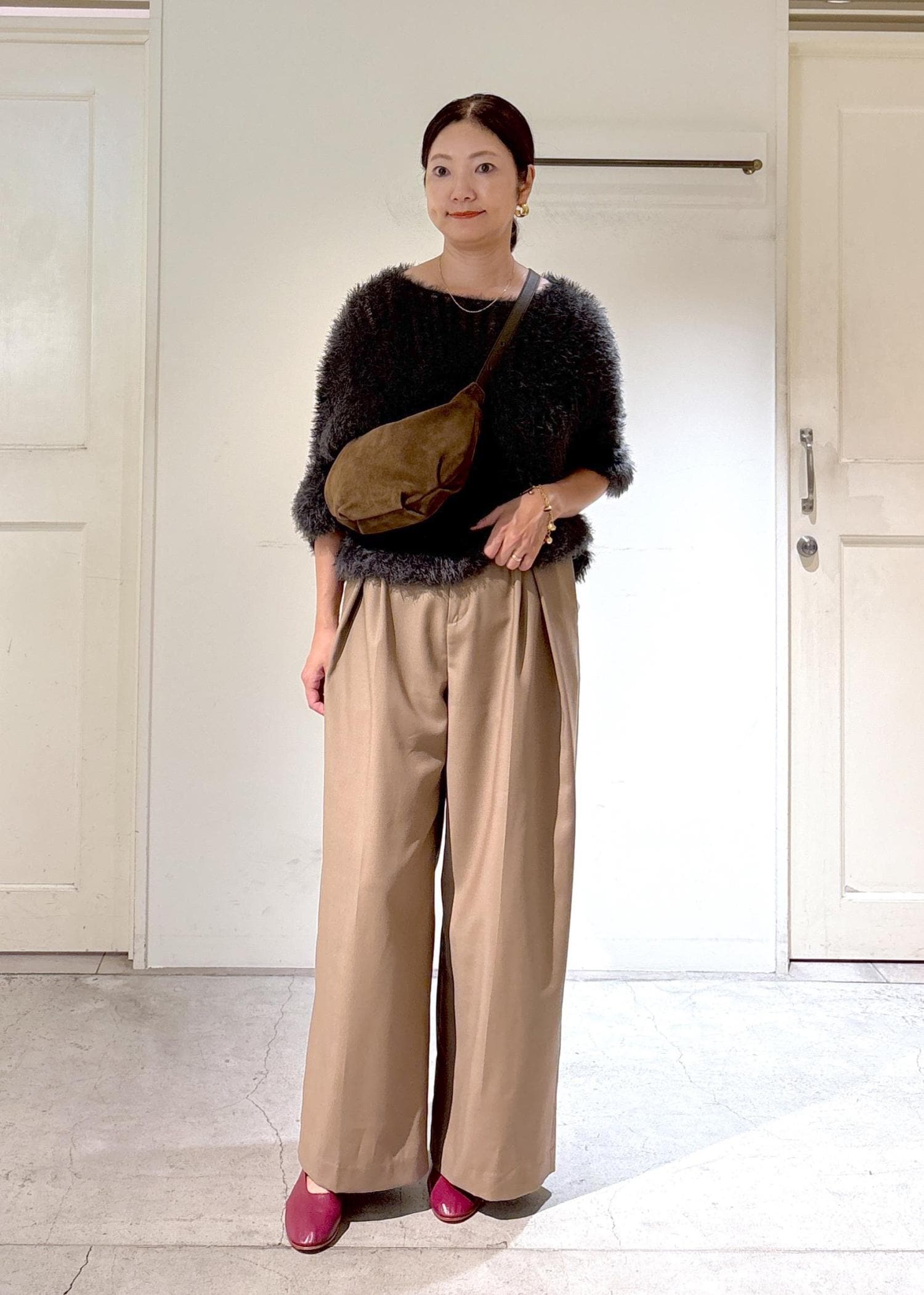 SALON adam et ropéインバーテッドタックパンツ/スラックスベージュ / M¥25,300レビュー両サイドにつけられたタックで流れるような美しいシルエットが表現されたスラックス。脚長効果も期待できます。ウエストにジャストフィットする設計。163cmでフラットシューズを履くと足の甲ぐらいの丈感。