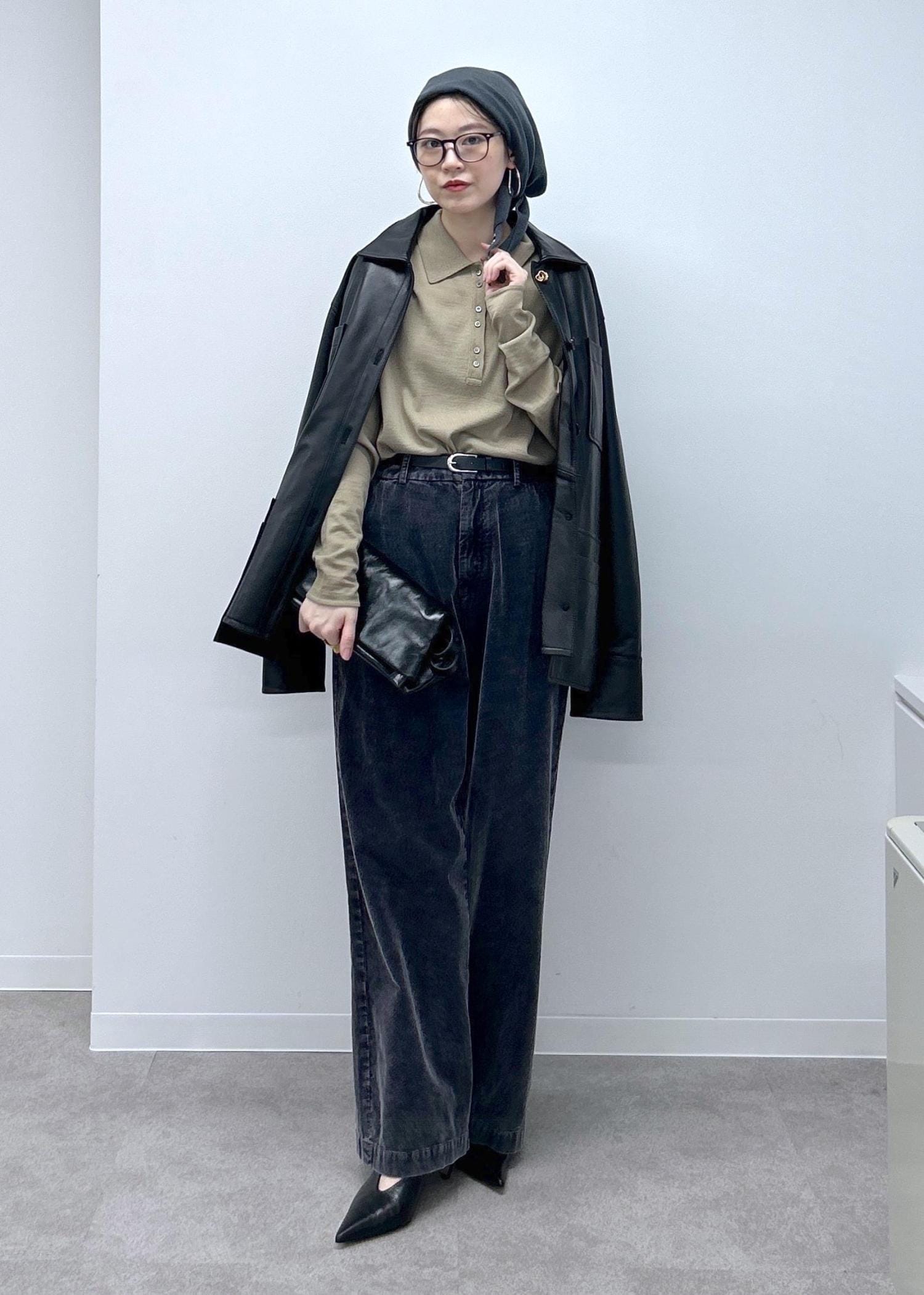 ポロニット×ワイドパンツで全体的にマニッシュなスタイルにまとめつつ、カシミヤのバンダナとパンプスでラフな女性らしさをミックスしてみました◎