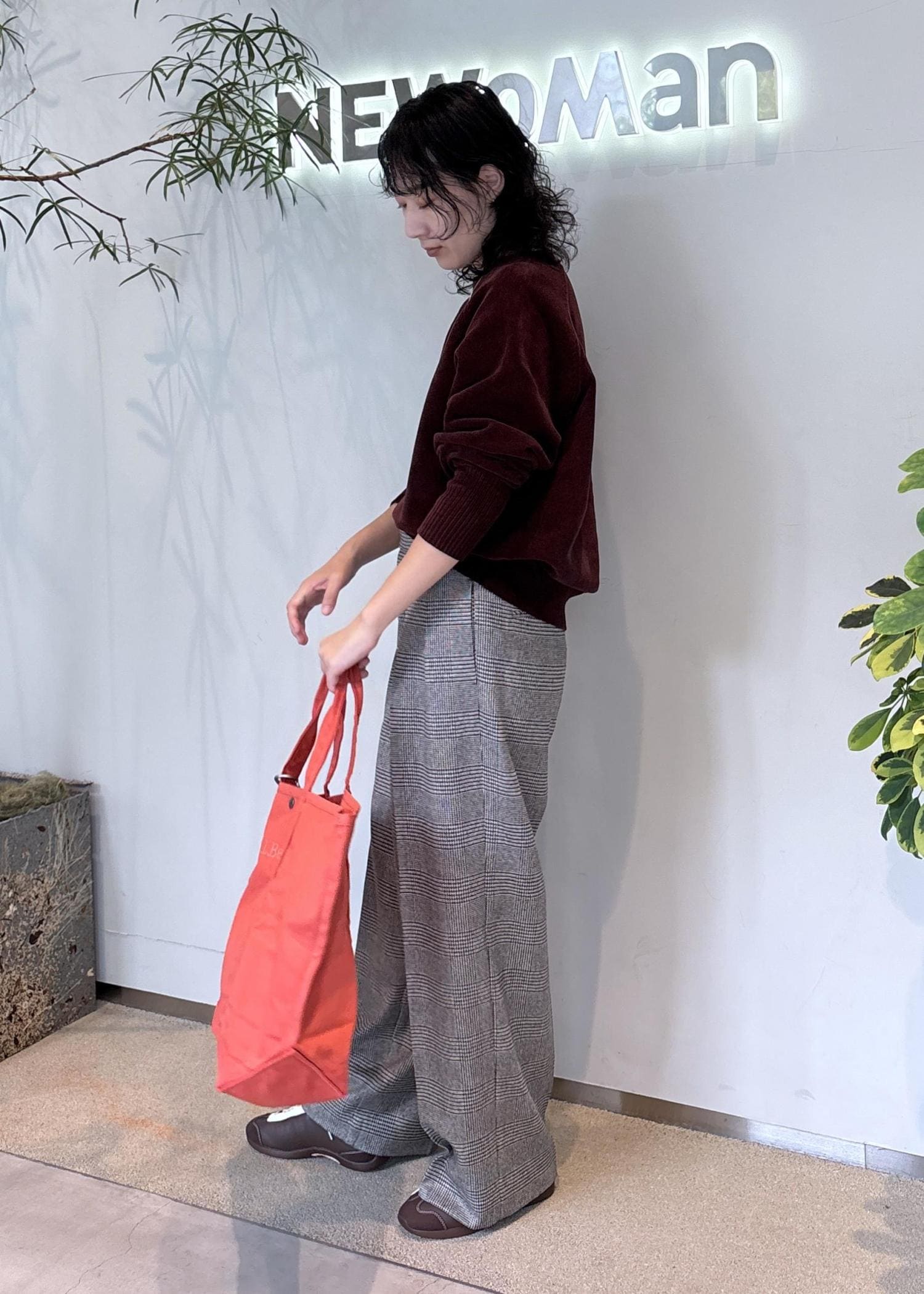 168cm、Mサイズで着丈は余裕あり。ストレートラインを実現したウール混ワイドパンツ。