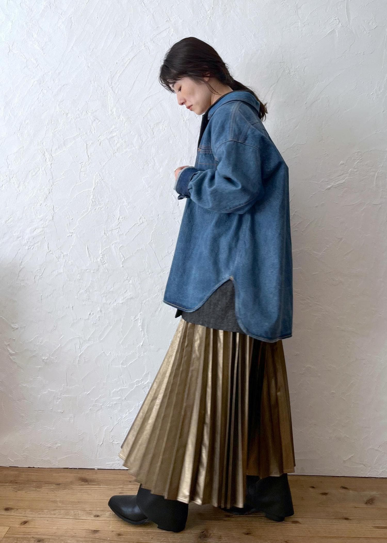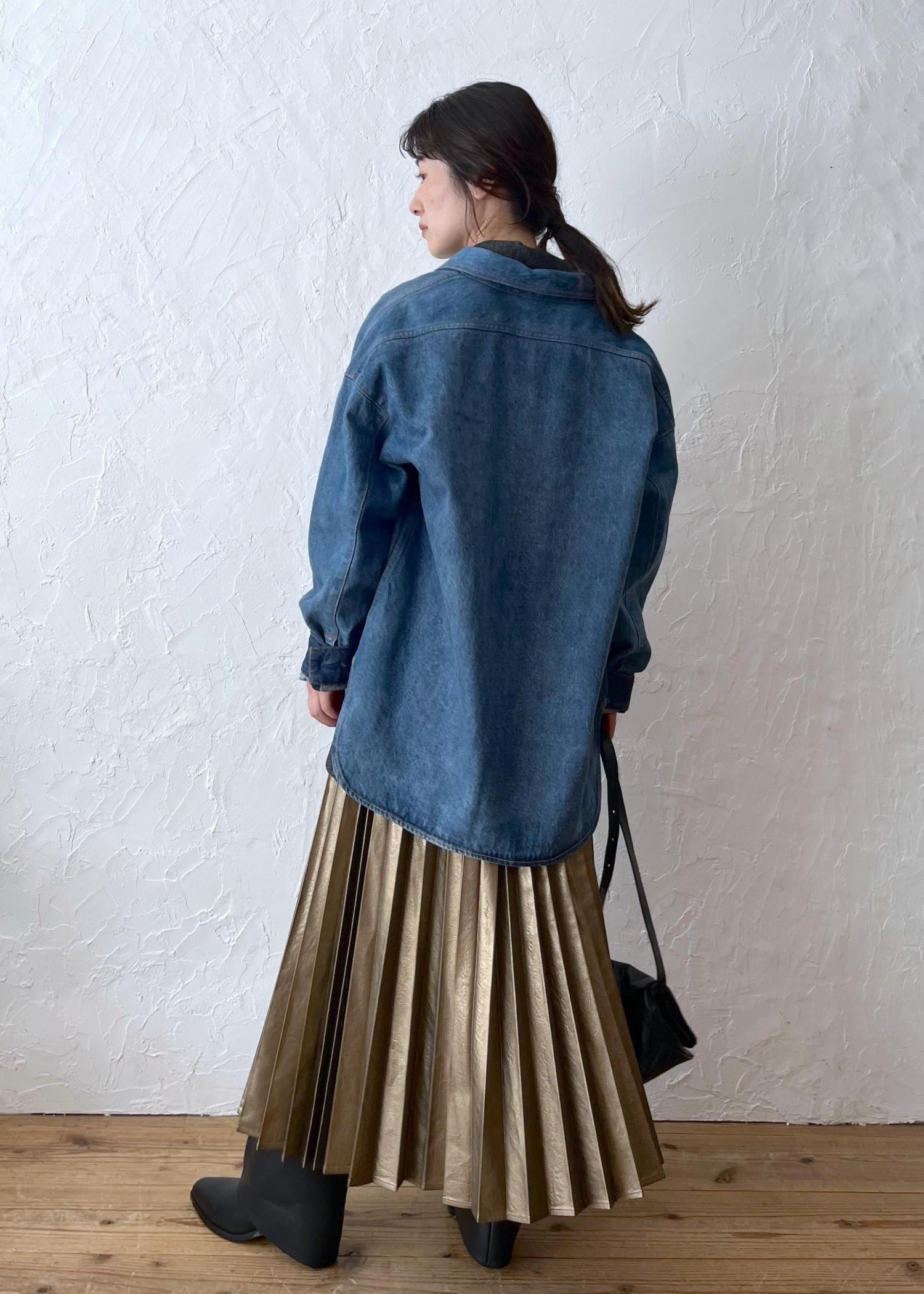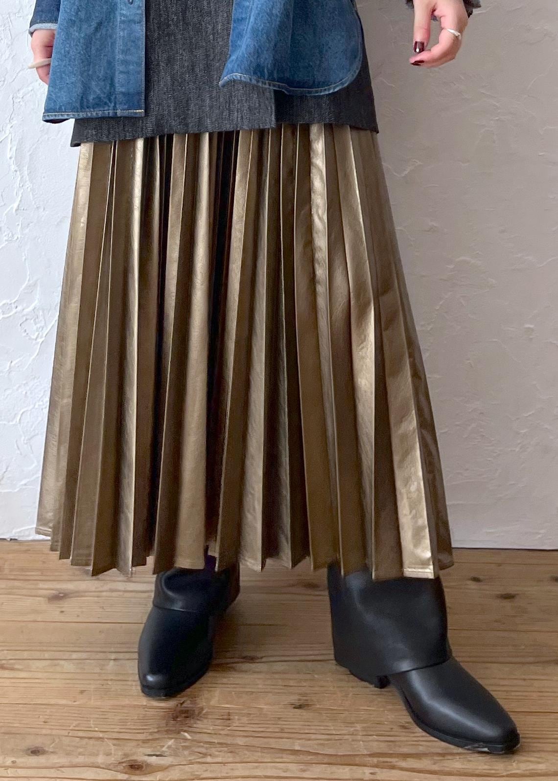 メタリックなシュリンクレザーが華やかなプリーツスカート。見た目以上に軽く、柔らかい素材なので履きやすいです◎ウエストはオールゴムなので腰履きなども可能です。ご自宅でお洗濯可能。 -