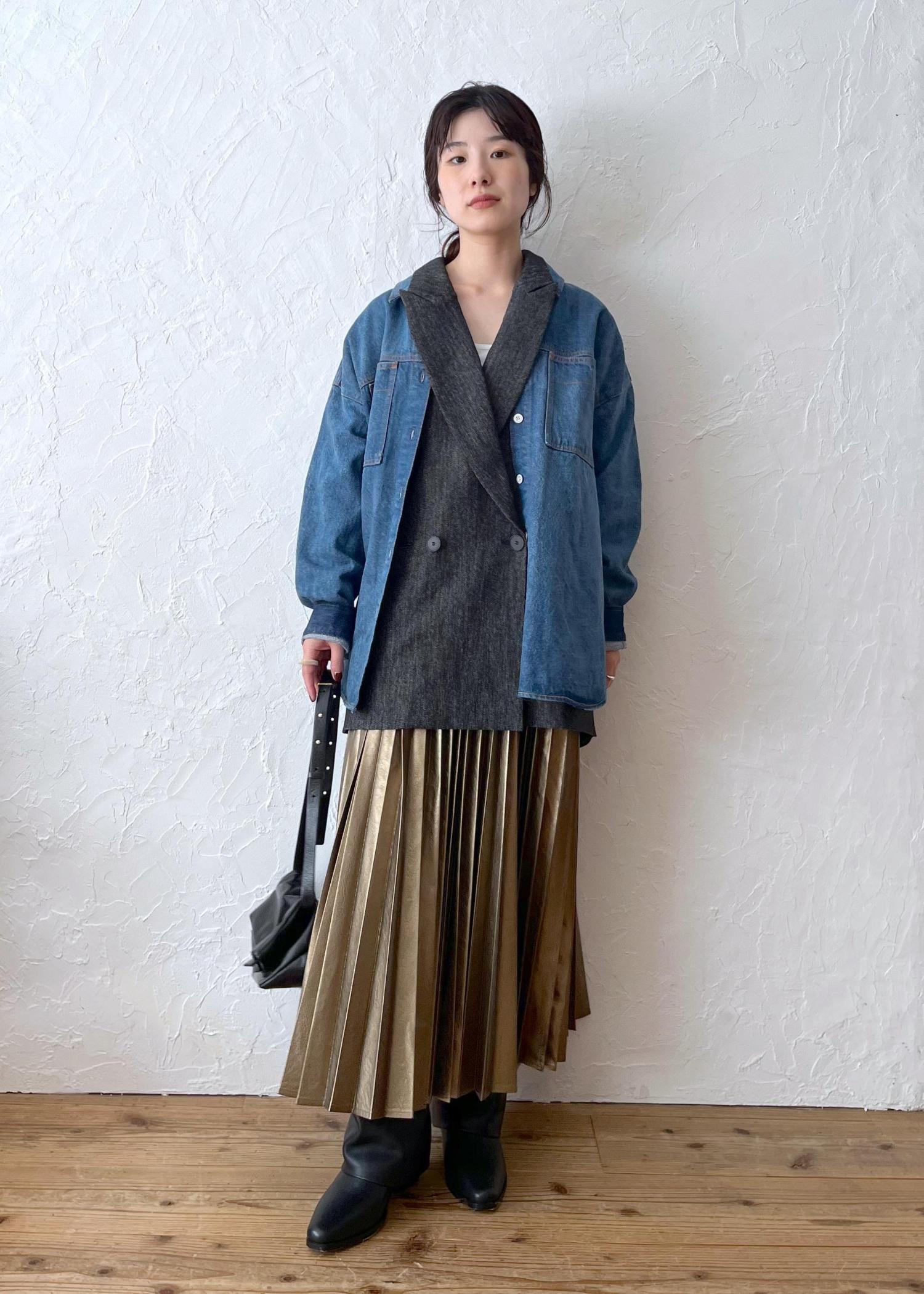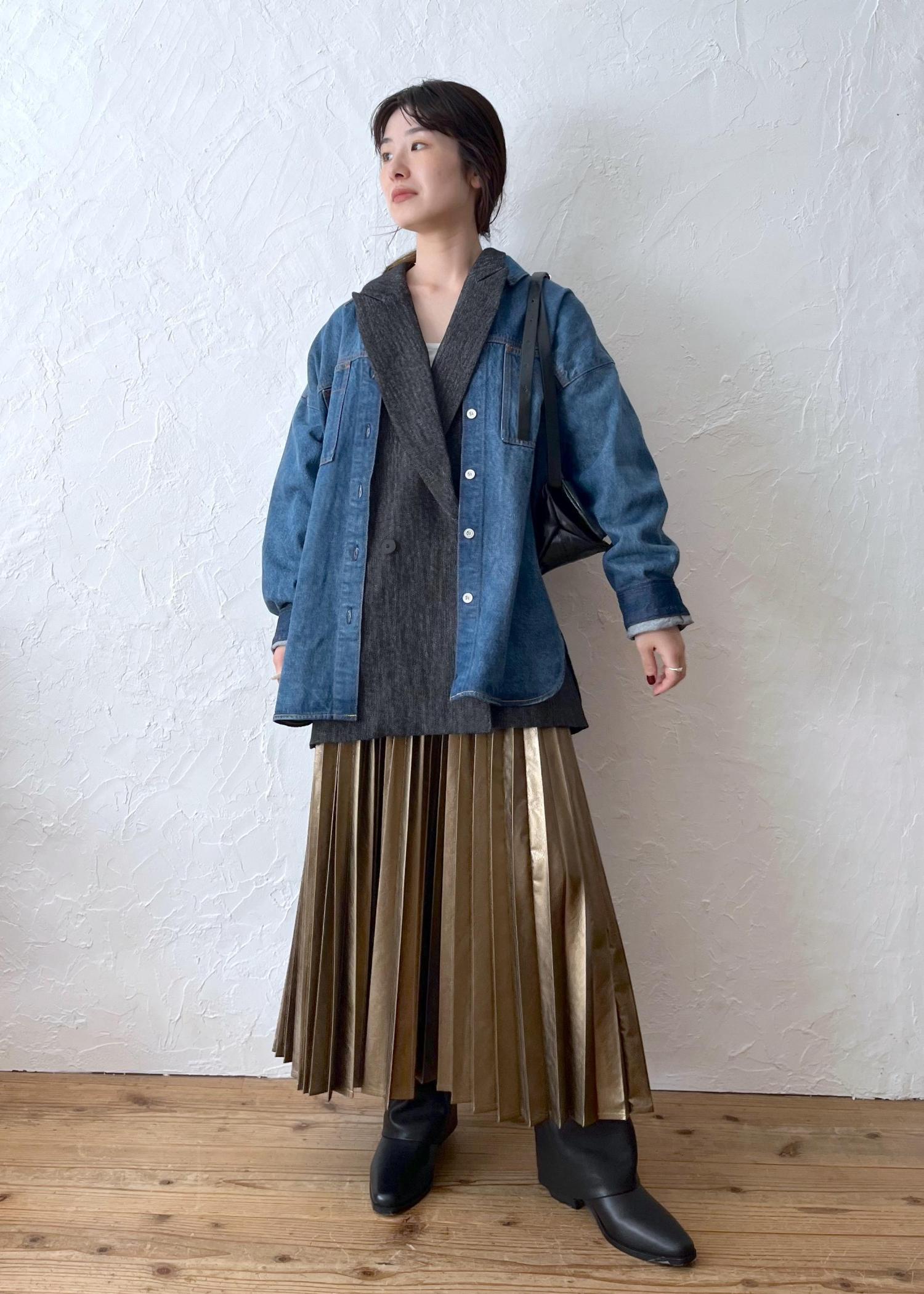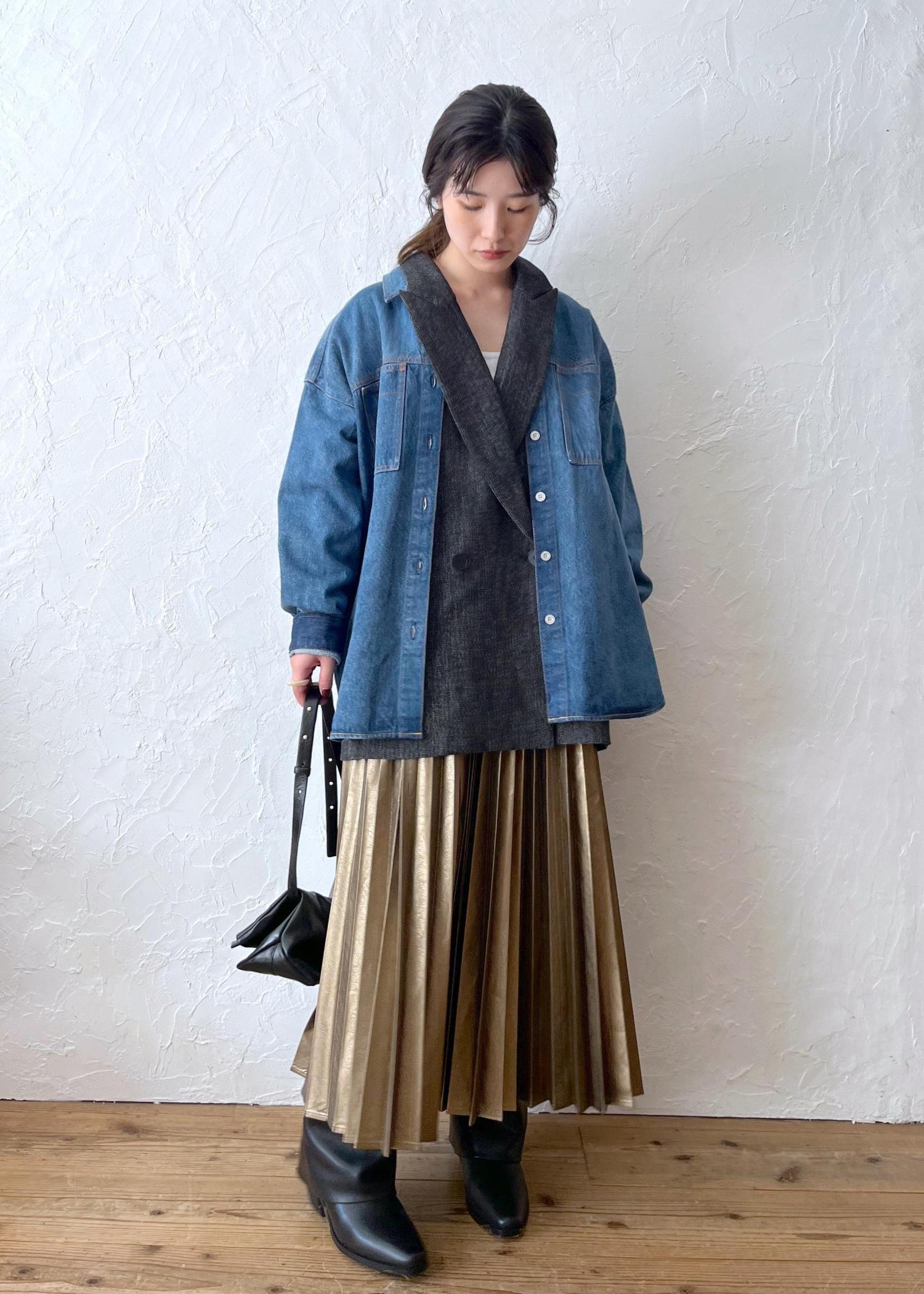 メタリックなシュリンクレザーが華やかなプリーツスカート。見た目以上に軽く、柔らかい素材なので履きやすいです◎ウエストはオールゴムなので腰履きなども可能です。ご自宅でお洗濯可能。 -