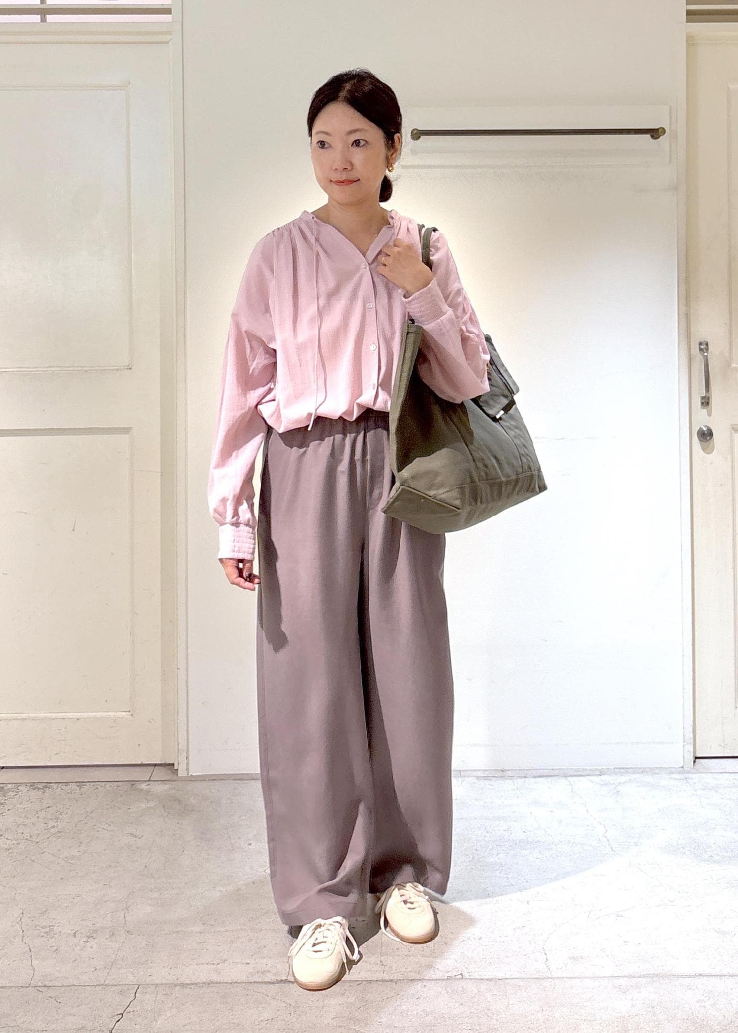 ピンクや白といったフェミニンなカラーにカーキ色をあわせました!