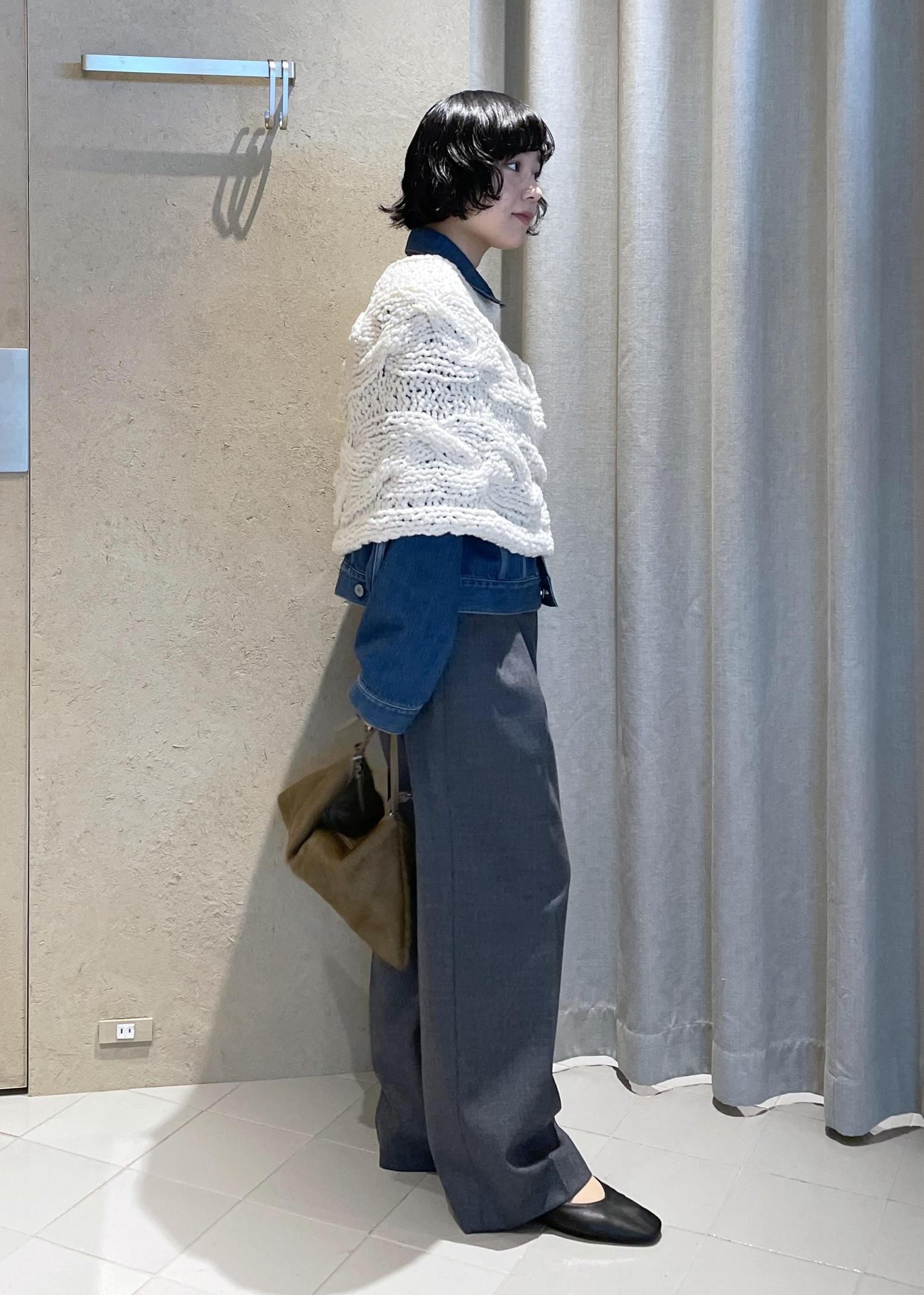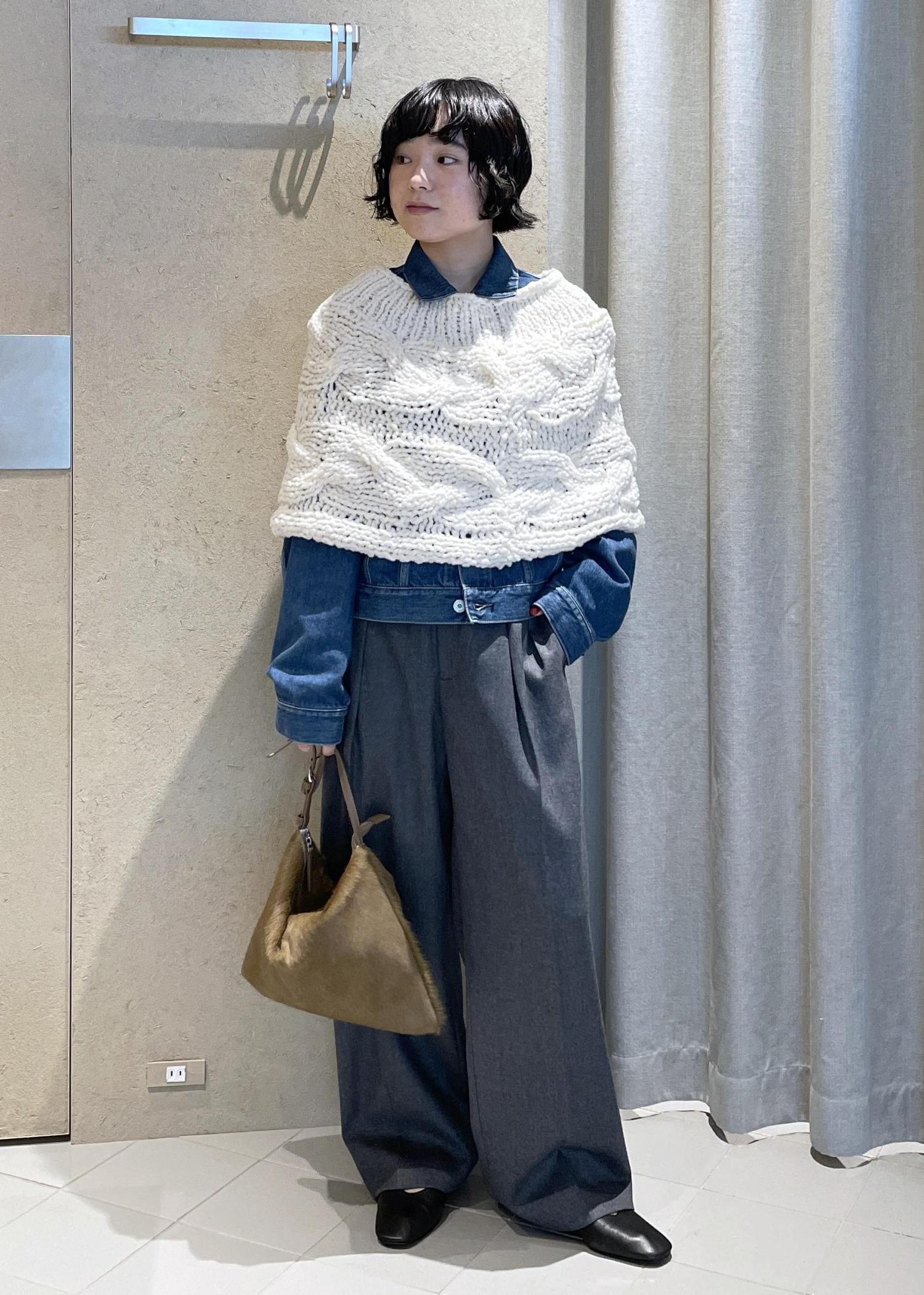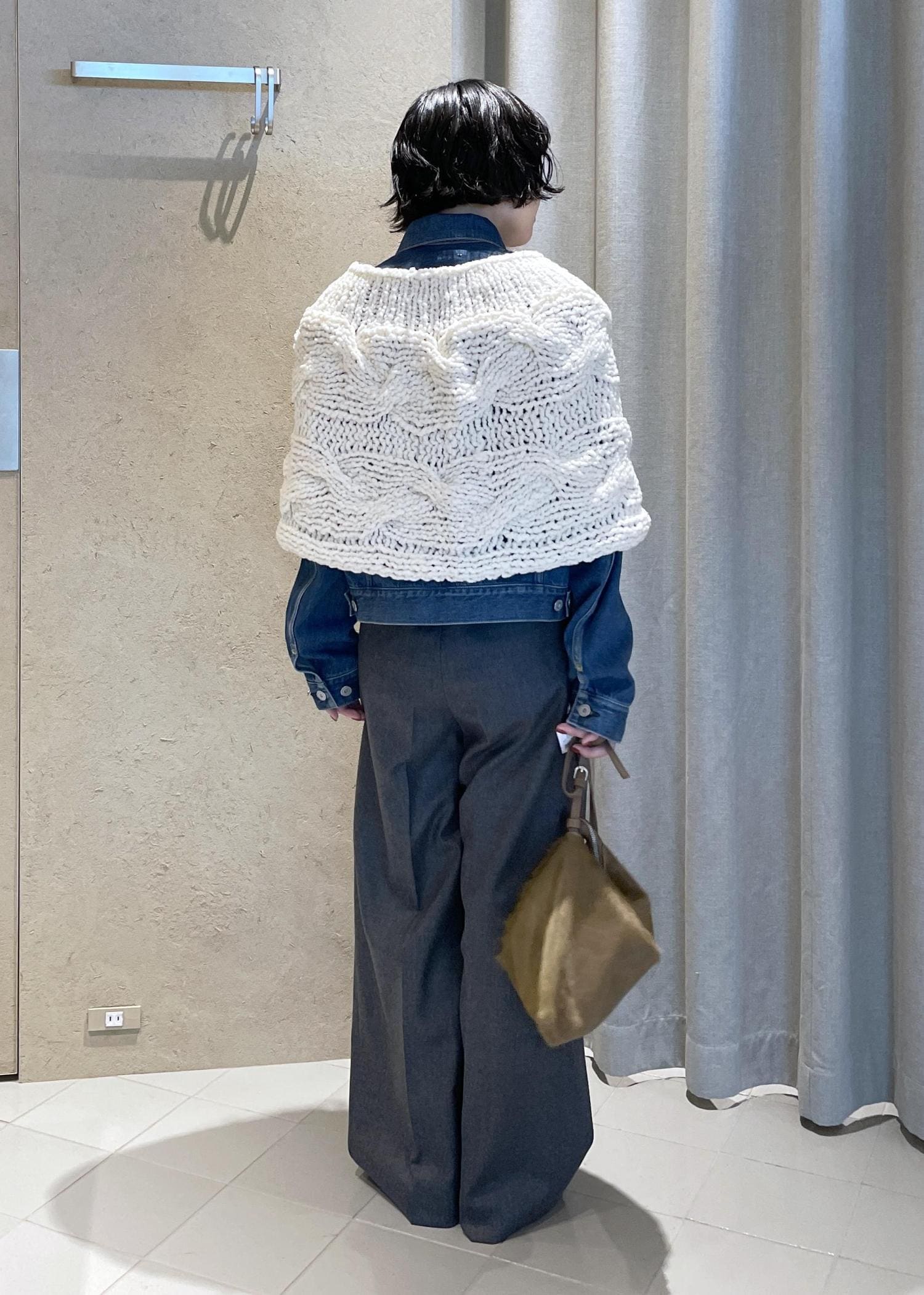 デニムジャケットがカジュアルな雰囲気なのでタックパンツは大人っぽく合わせてみました。このままでもねシンプルでかわいいですが、少しレディな感じも出したかったのでセレクトブランドIRONINGのケープを合わせてみました。こちらのアイテムはトレンチコートやシャツなどにプラスするだけでもこなれ感が出るのでおすすめです◎