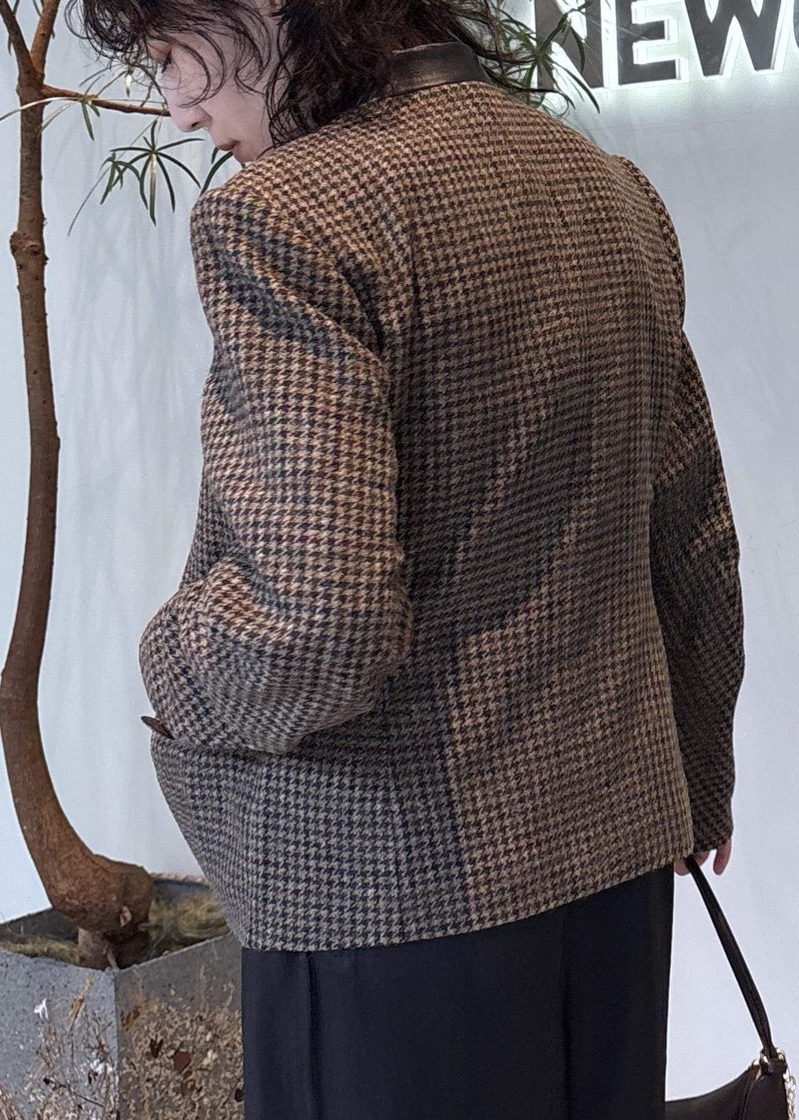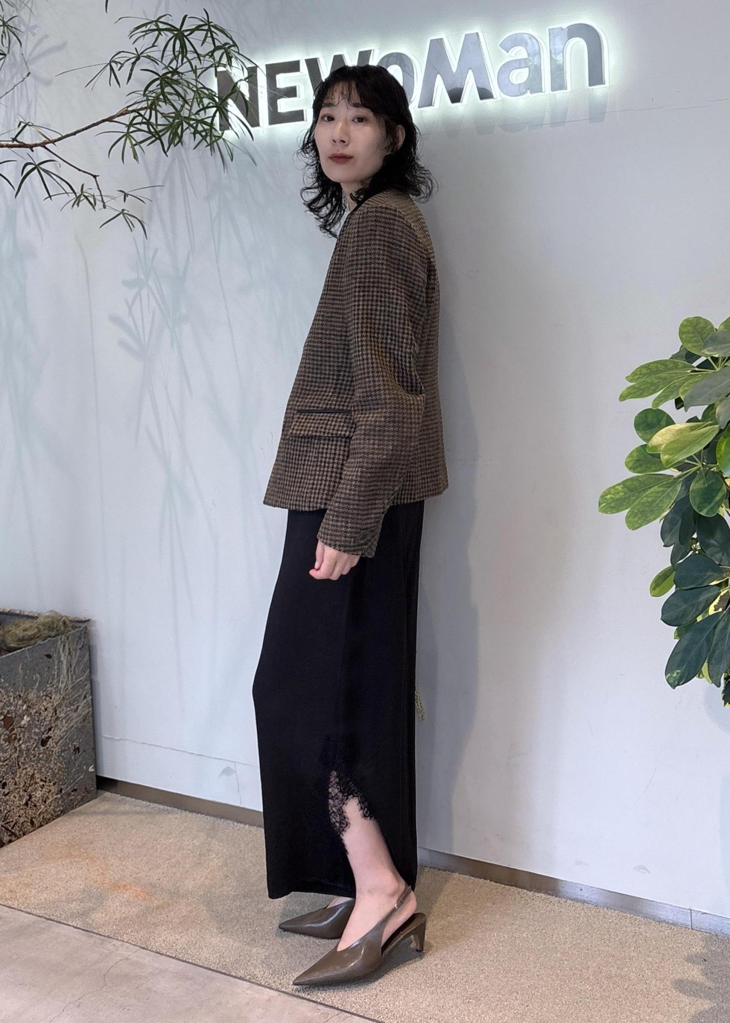 ツィードで季節感たっぷりのジャケットは首元のレザーがポイント。ノーカラーなので女性らしく、オケージョンニーズにも◎