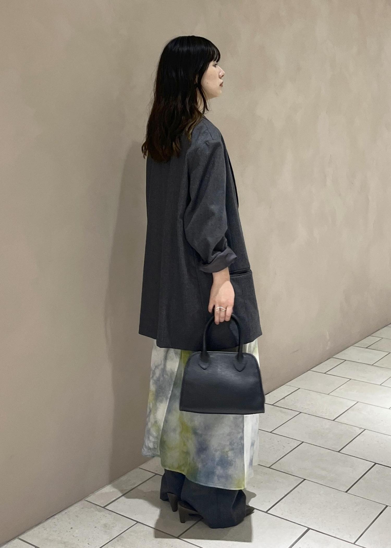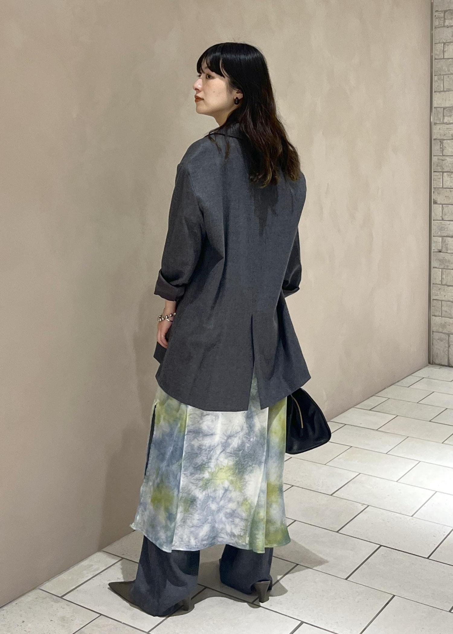 着丈は長めですが、シングルなので腰回りは程よくすっきりとした見た目です。肩周りは落ちたデザイン。
