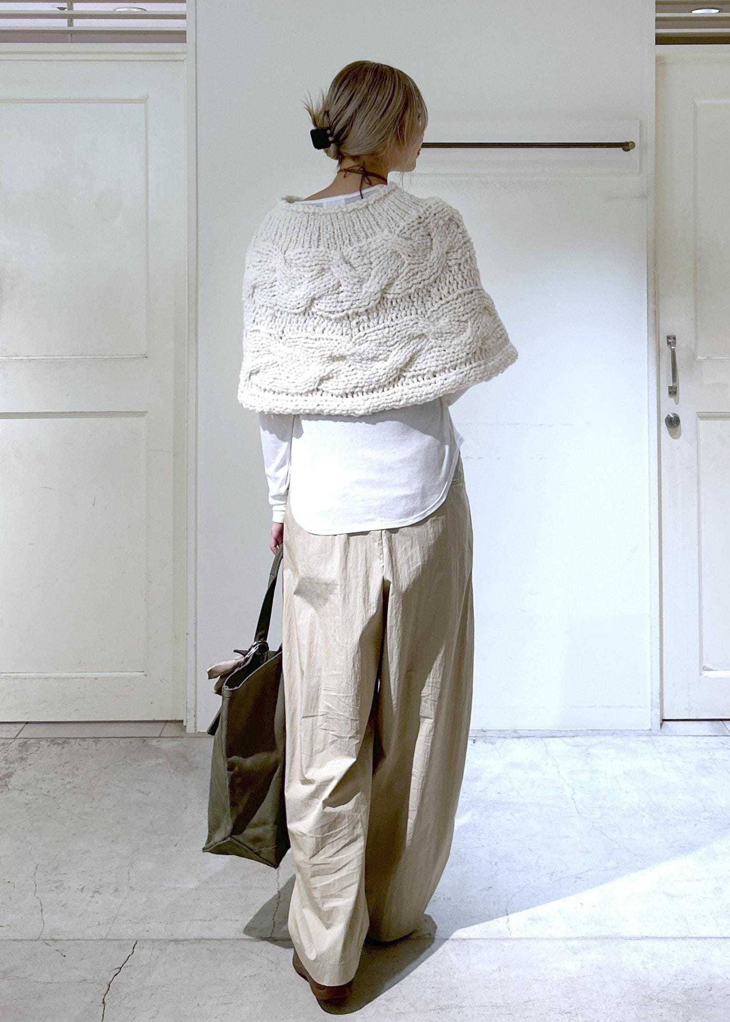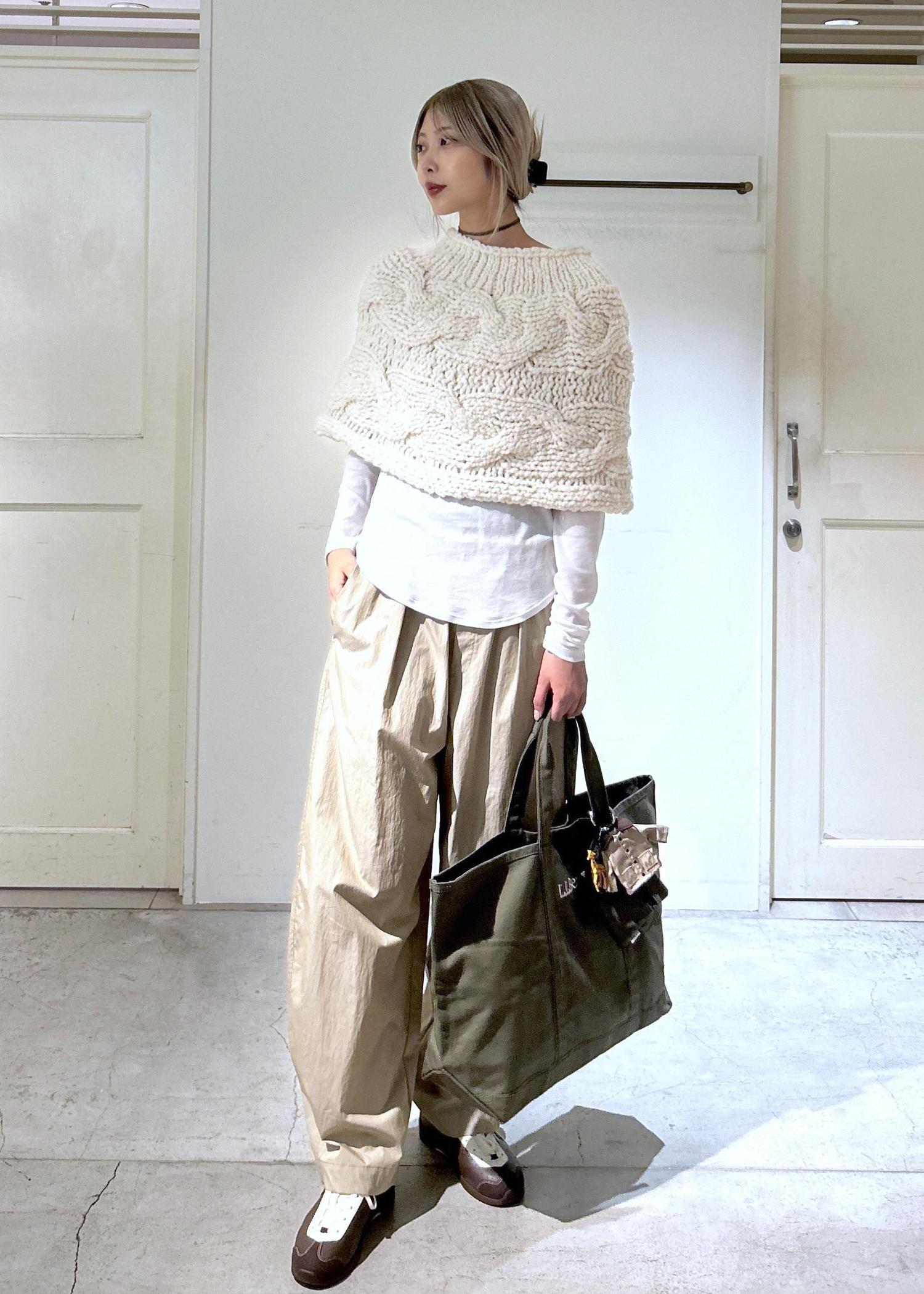 ケープを引き立たせるため落ち着いた色のアイテムを合わせ、全体的にカジュアルな雰囲気にまとめてみました。