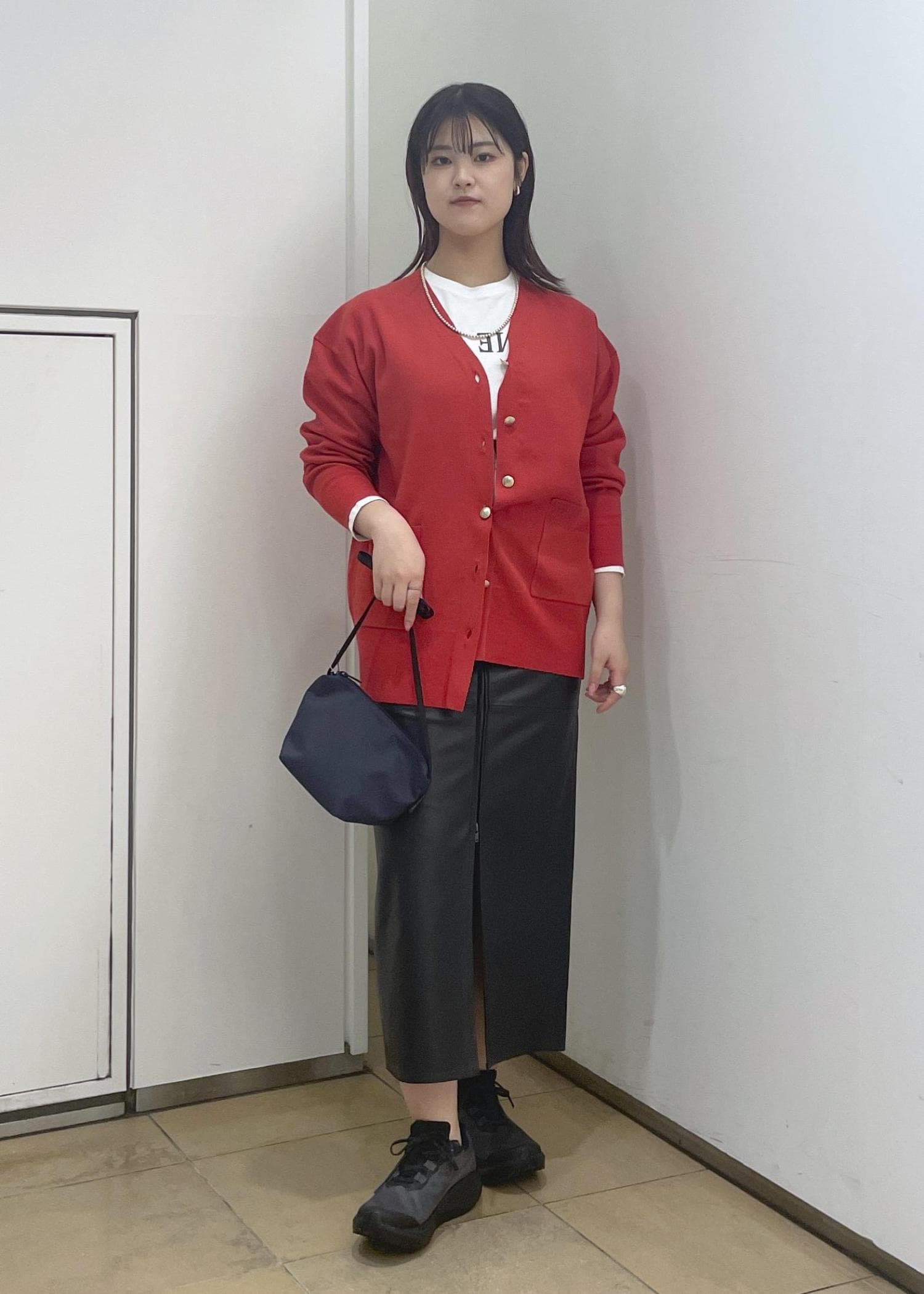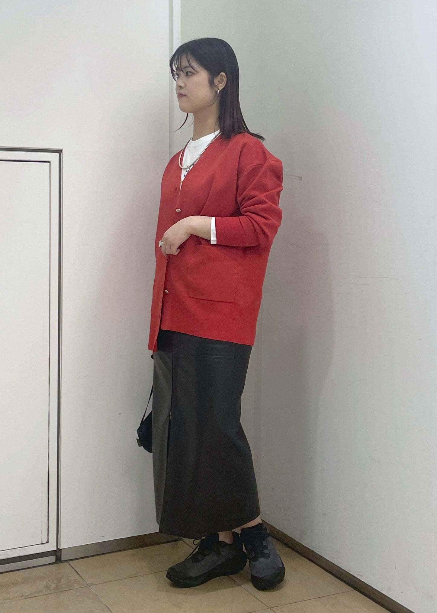レザーのスカートと合わせてシンプルでも季節感を楽しめるコーディネートにしました。