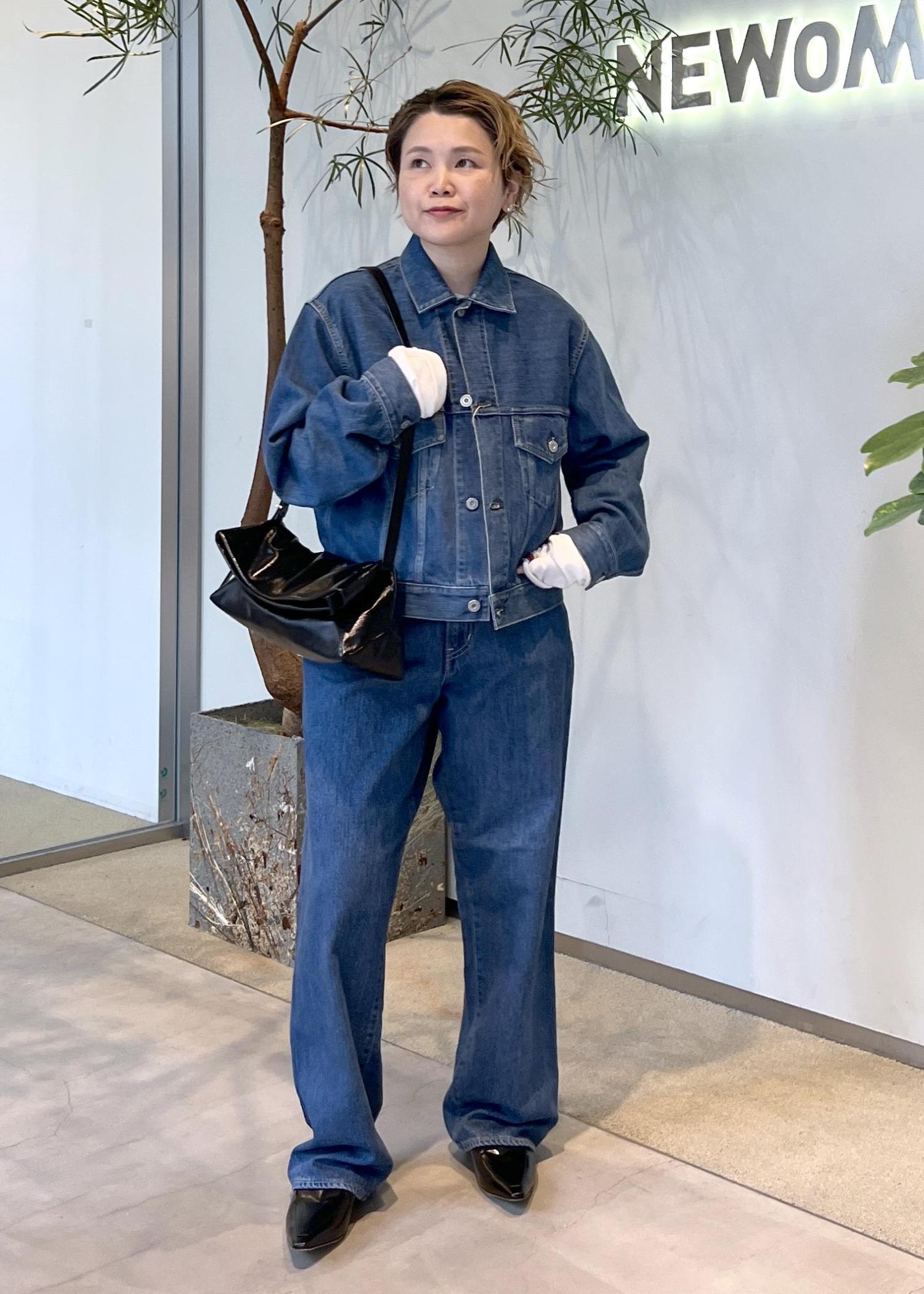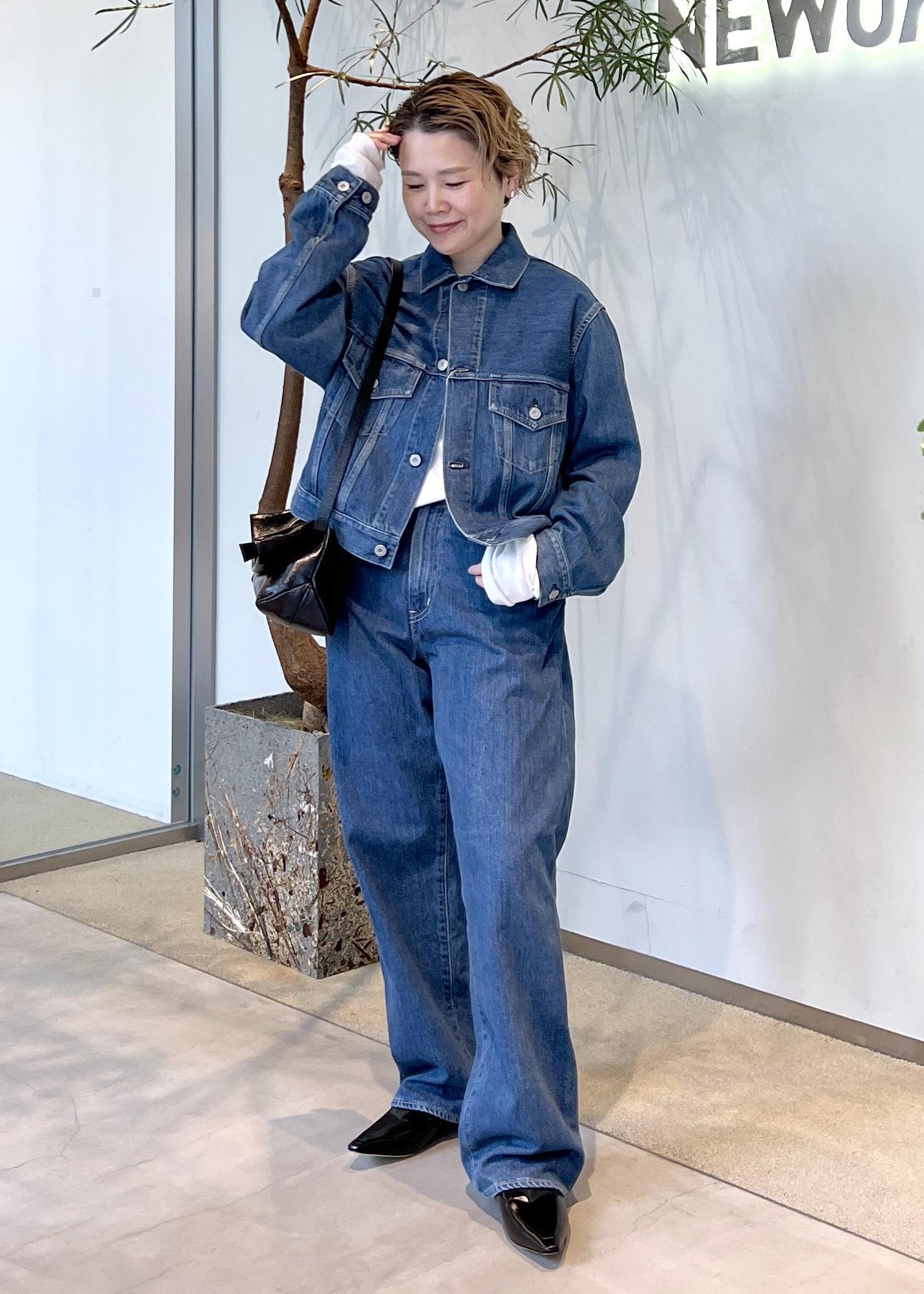 ボトムスのバッククロスのデザインや、絶妙なバランスがポイントのデニムジャケットの組み合わせで、