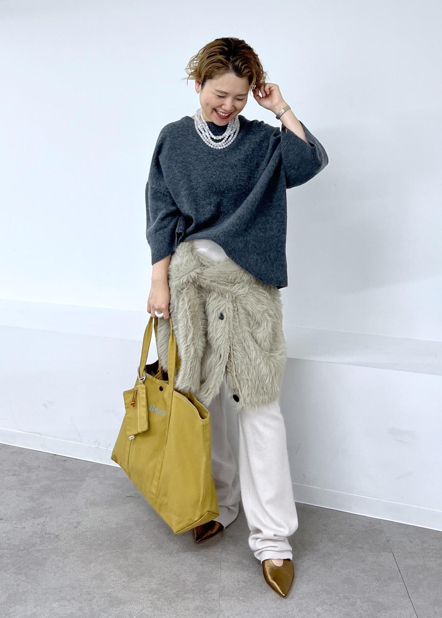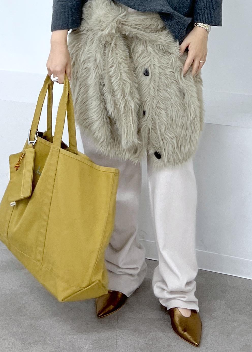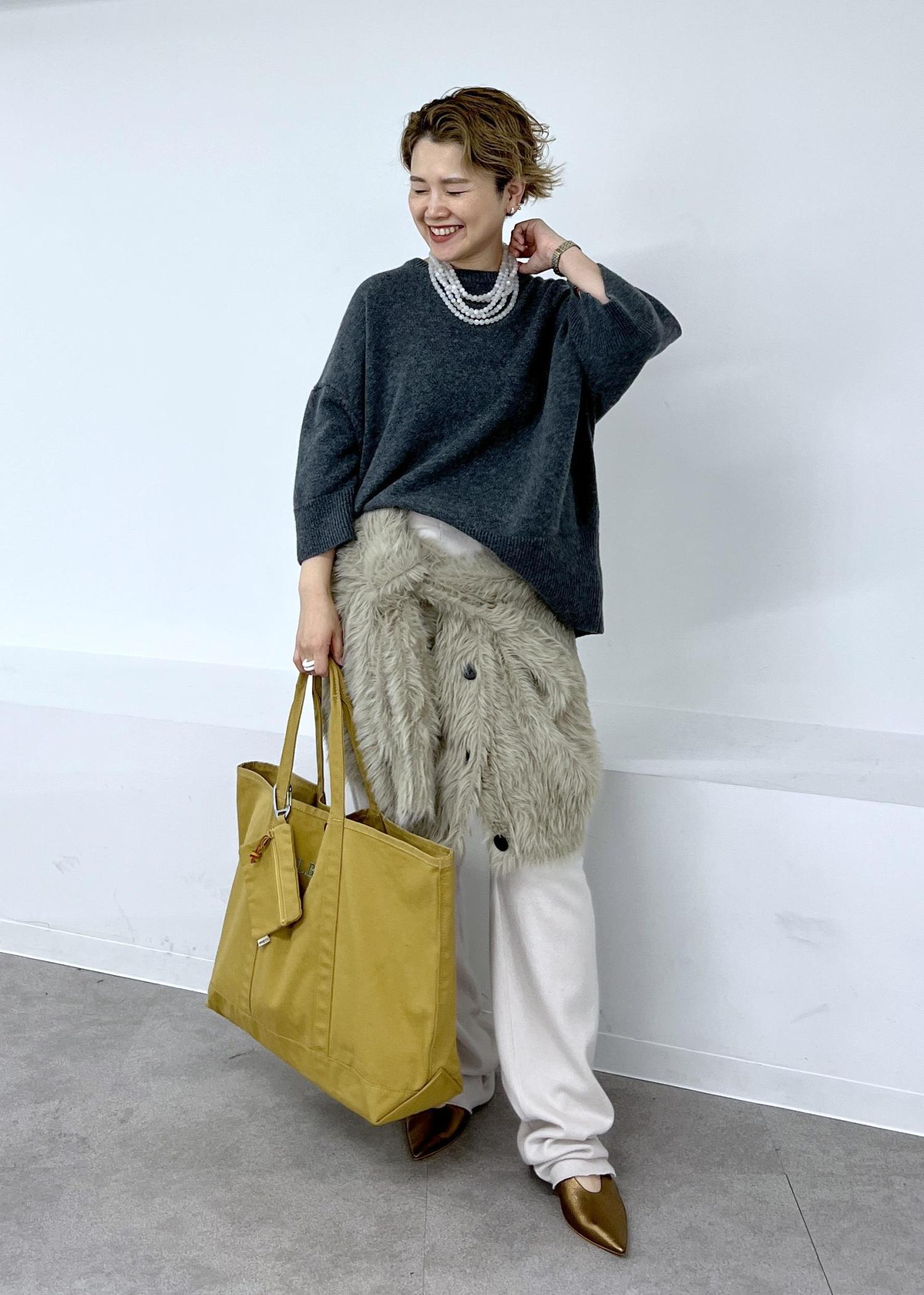 シンプルなスタイリングにシャギーカーデの素材感と、L.L.Beanのカラートートバッグでアクセントをつけました♡