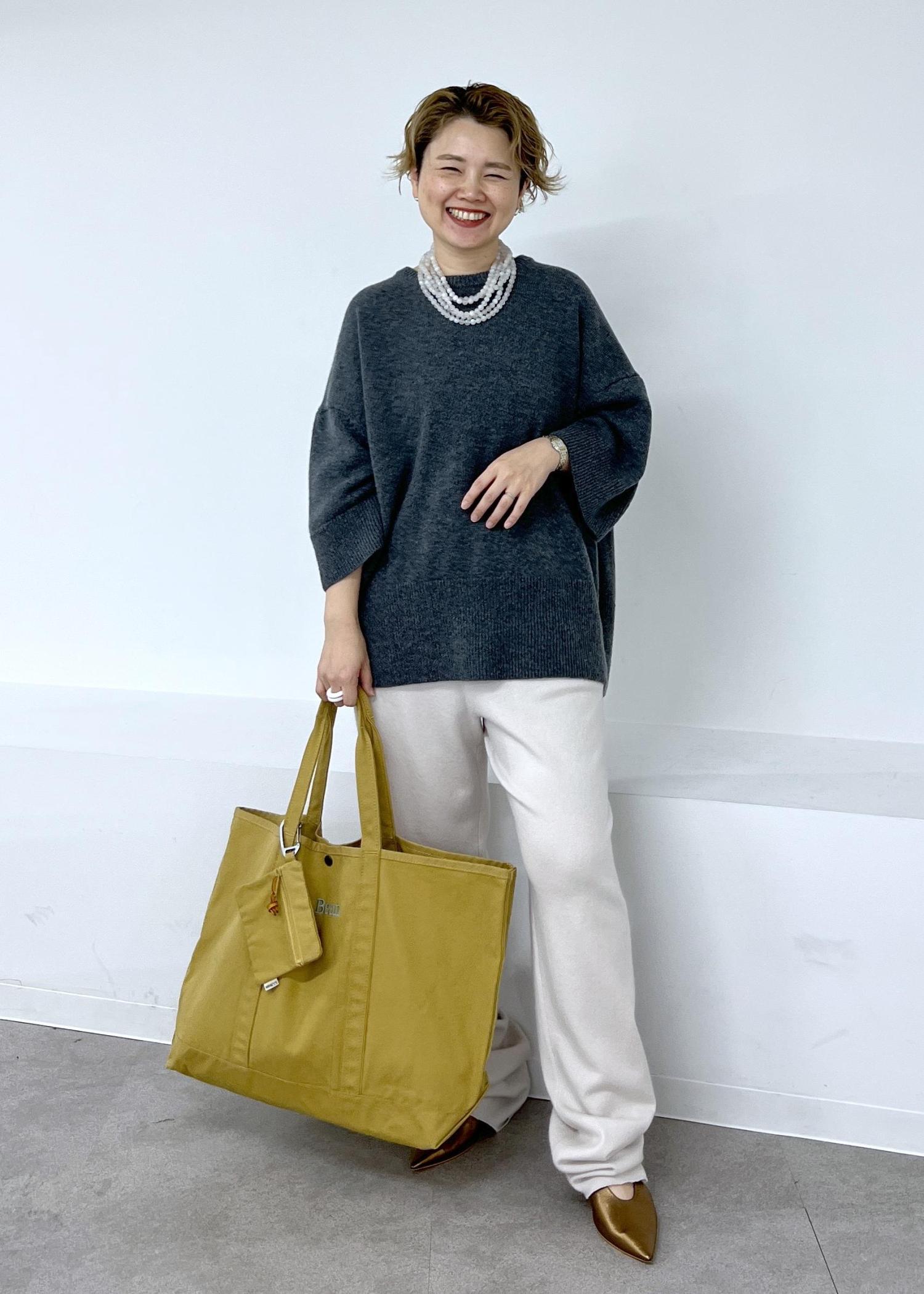 extreme cashmereのゆったりニットが主役のコーディネート。