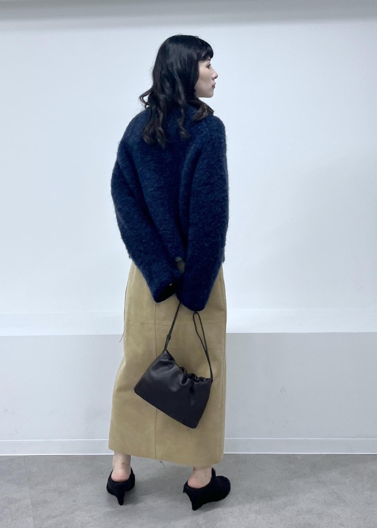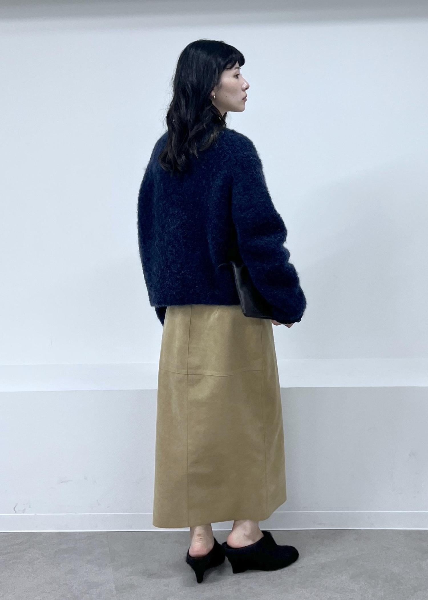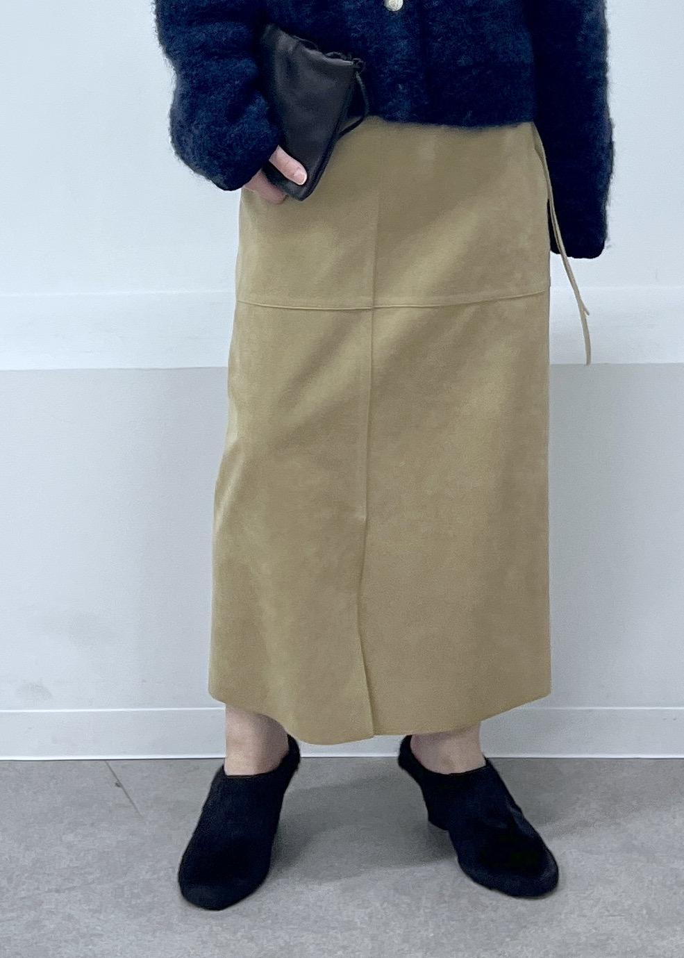 人口皮革のUltrasuede(R)を使用。本革のような滑らかなスエード素材で耐久性にも優れています。タイトシルエットですが前スリットで足捌き◎ -