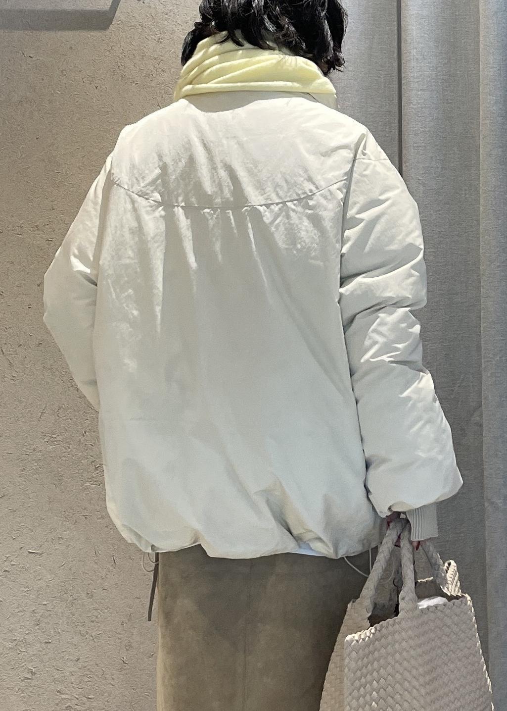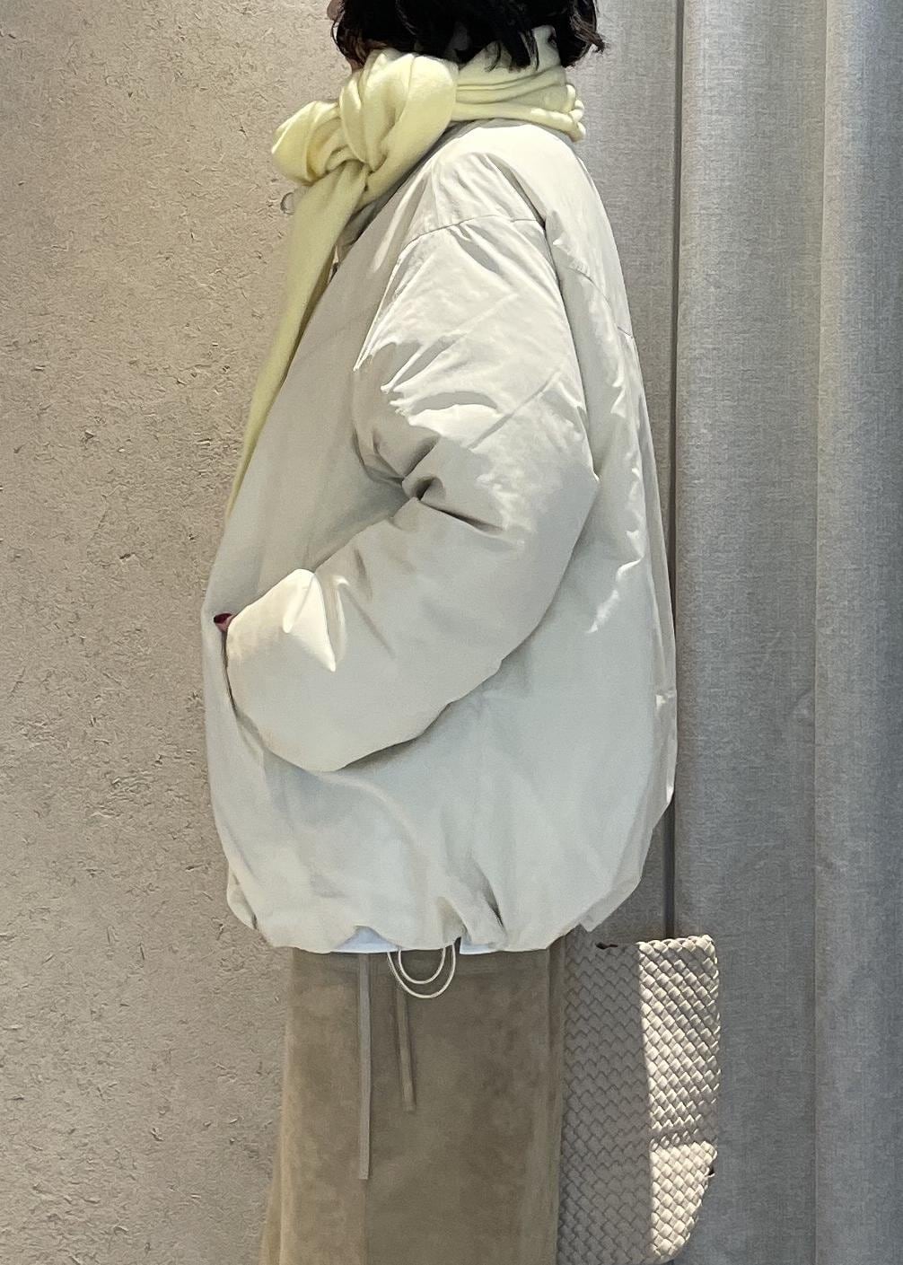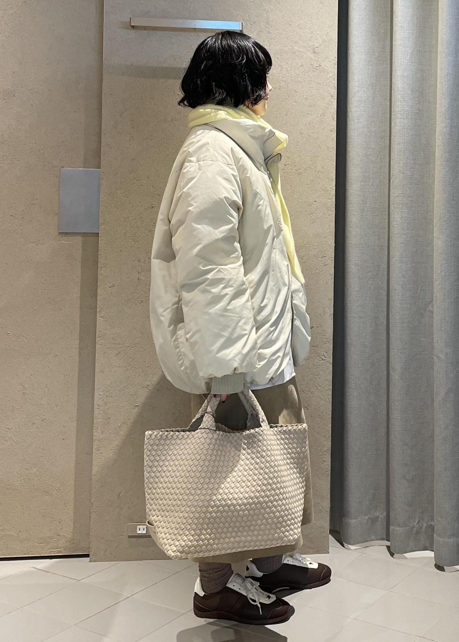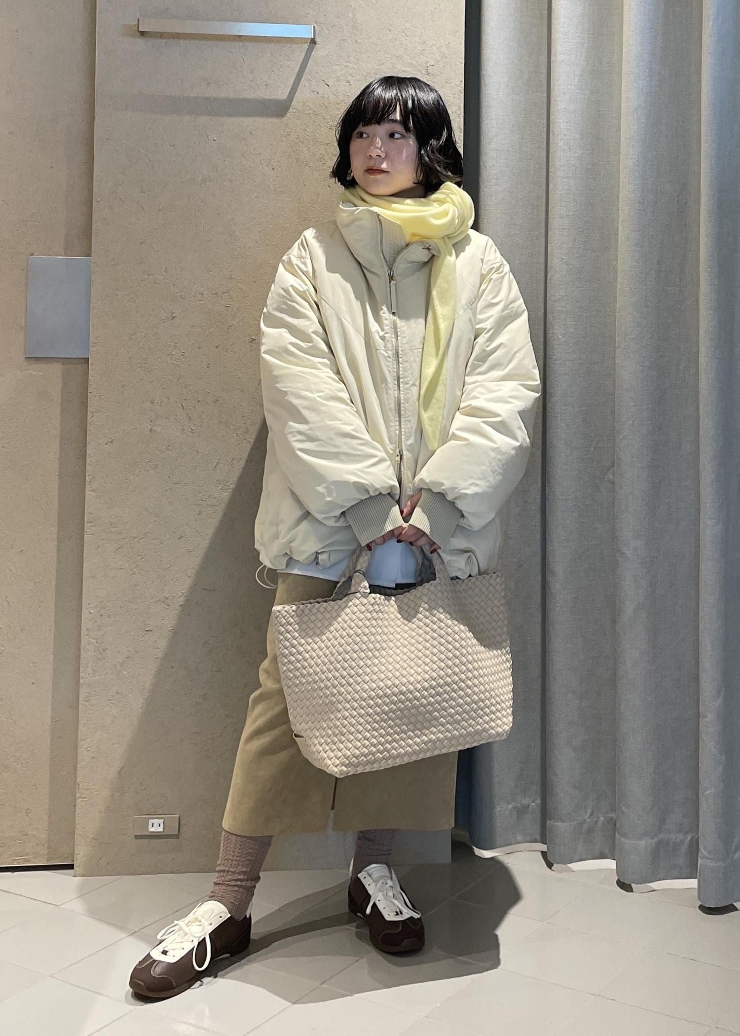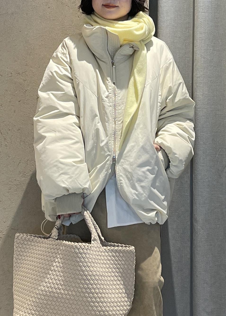 SALON adam et ropé[GREENDOWN(グリーンダウン)]撥水加工スタンドカラーダウンジャケット 2ベージュ / F¥45,100レビュー高輪店、新宿店限定カラーのクリームイエローを着用しています。身長155センチで小柄ですが、しっかりダウンが入っているので中で動く感じもないです。大きめサイズなので防寒対策しっかりされたい方は厚手のニットなどをインナーにしてももたつき気にならないと思います。