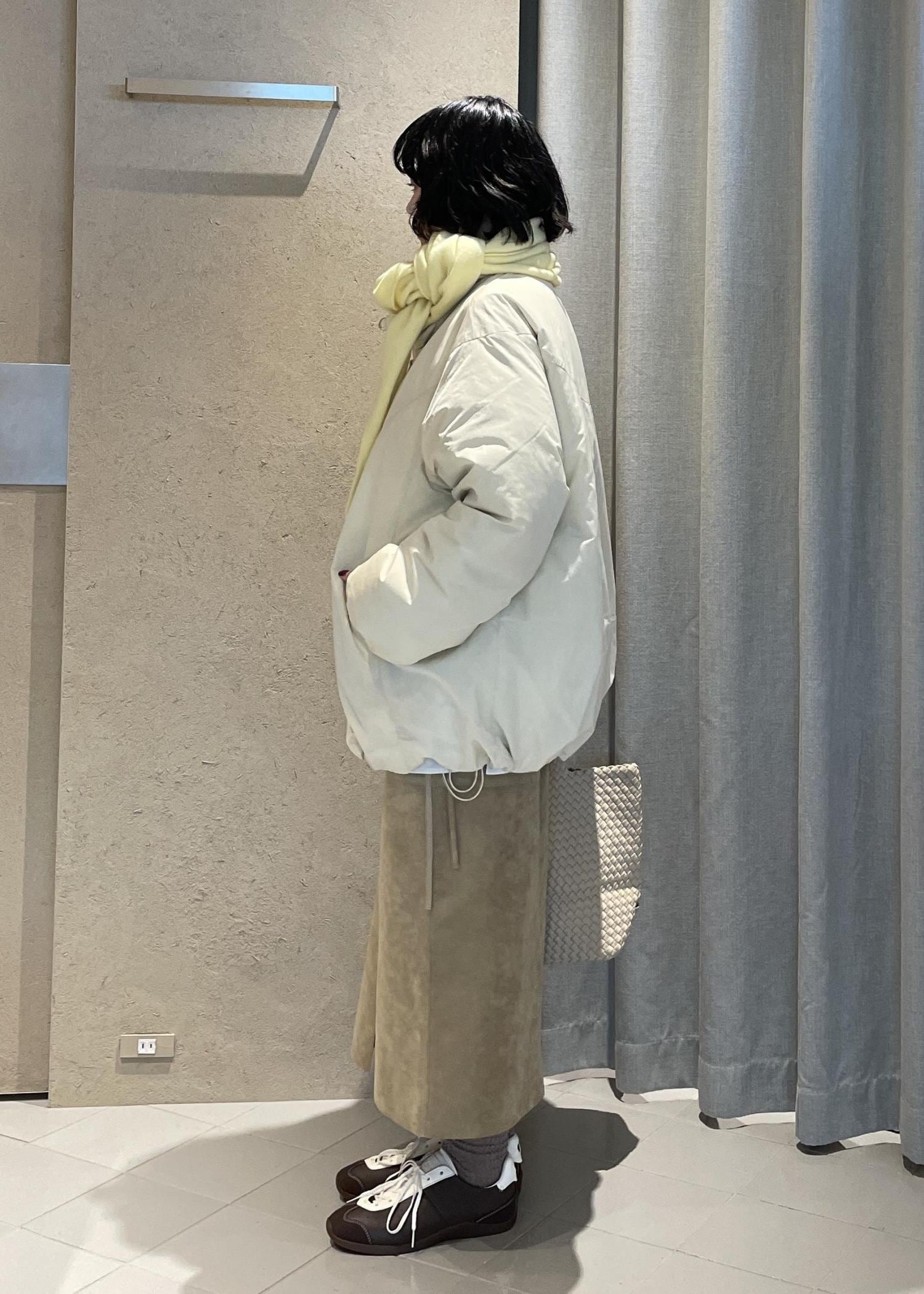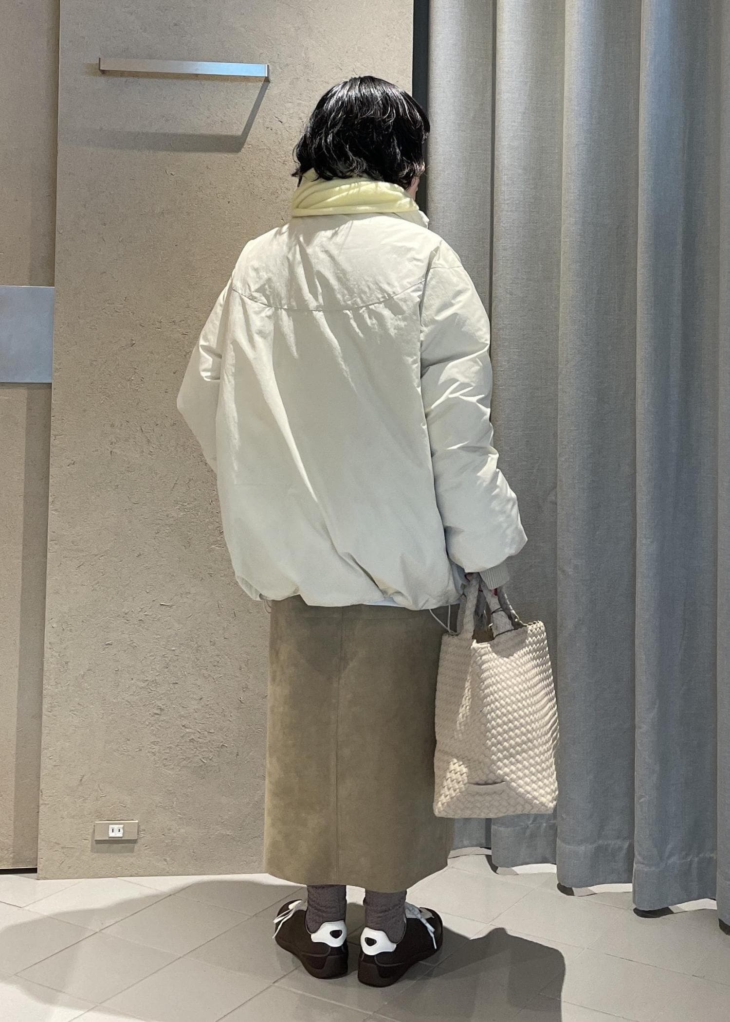急に寒くなり本格的にアウターお探しの方も多いはず!こちらのアウターはしっかりダウンが入っていて保温性も抜群です。さらにサムホールがついているので手袋要らずなのも嬉しいポイント◯私は身長155センチと低身長なのでボトムはタイトスカートで合わせてバランスをとってみました。