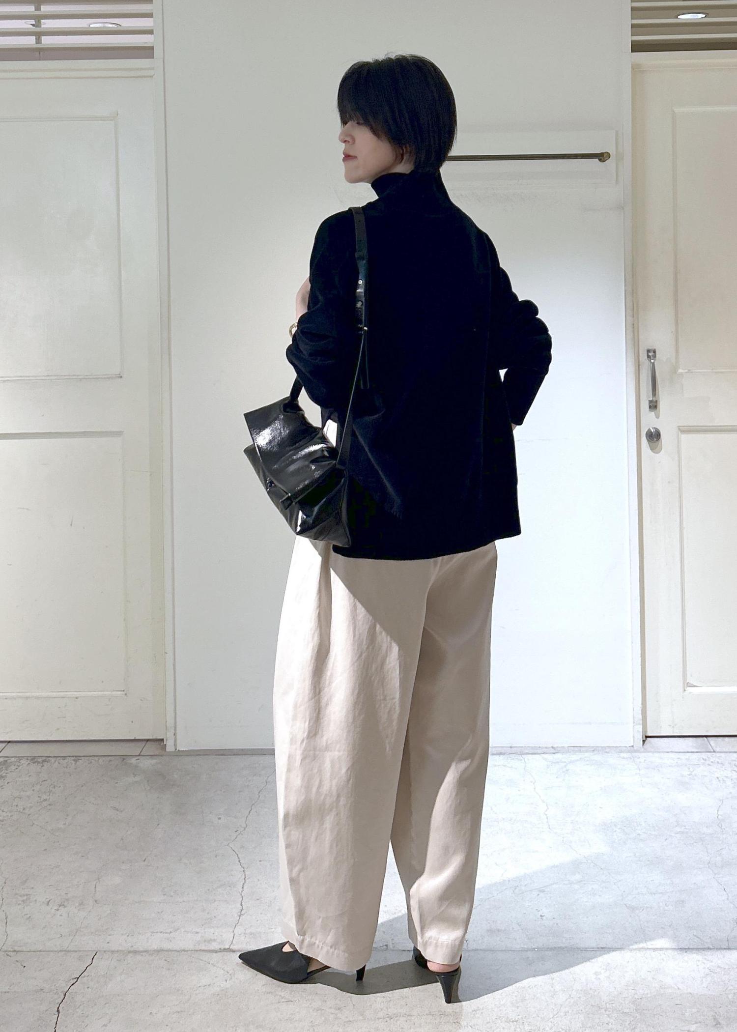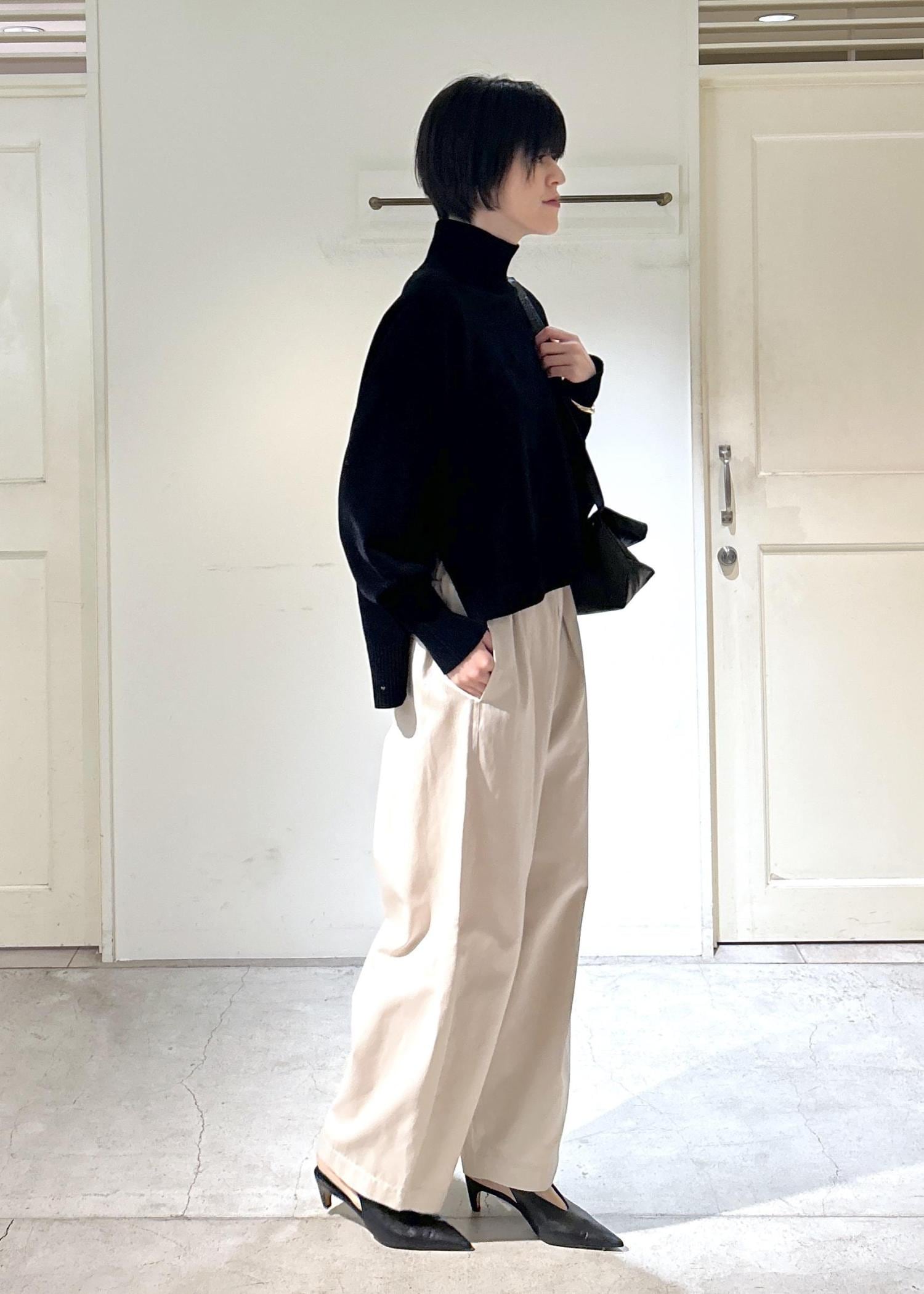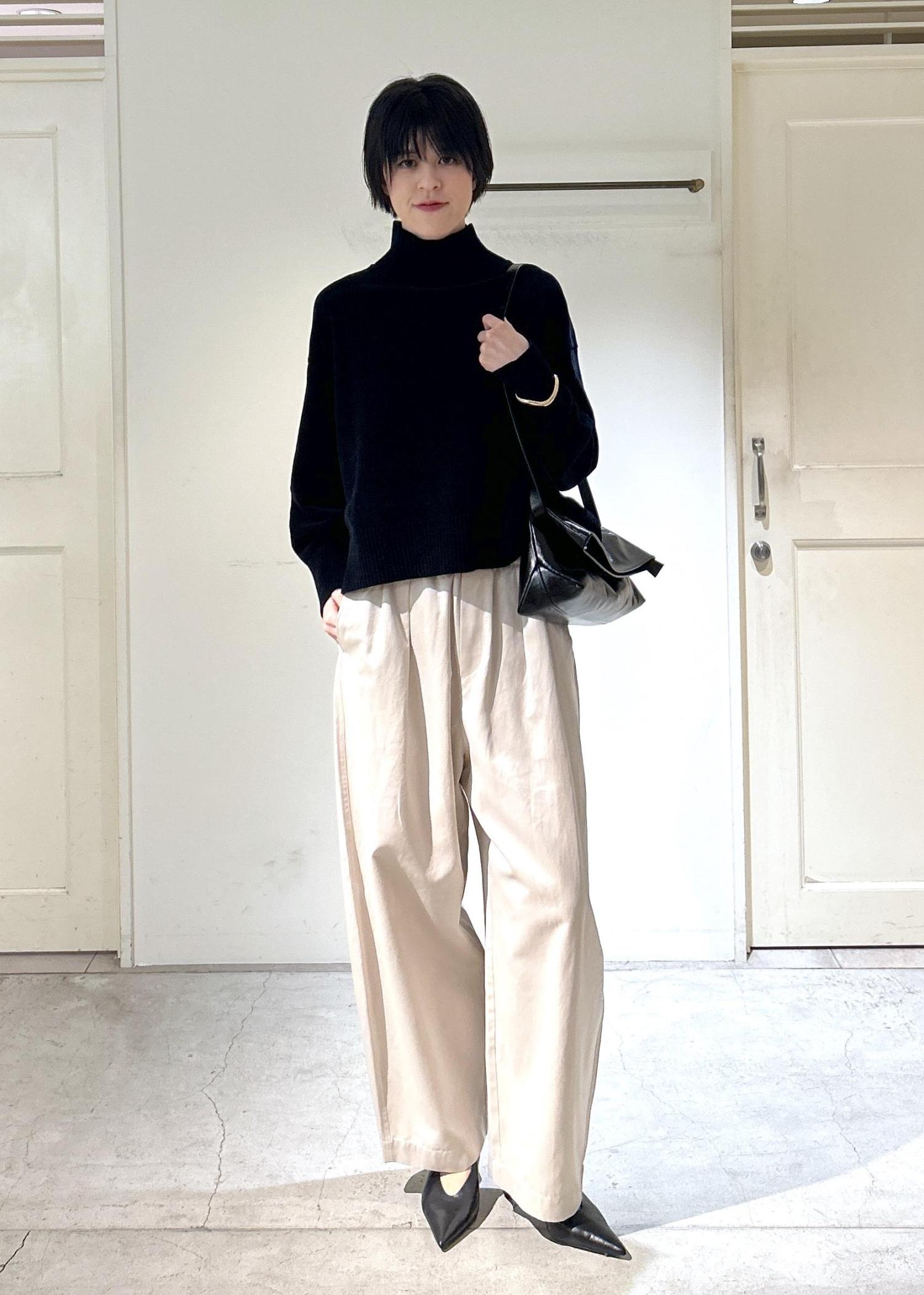 SALON adam et ropéタートルネックプルオーバー-CreamyCotton /クリーミーコットン-ブラック / F¥19,800レビュー身長171cmで、丈はお尻が隠れるくらいの長さ。身幅はゆったりしていて、首周りは程よくフィット感があります。肉厚で肌触りが良く、シワになりにくいのも嬉しいポイントです。