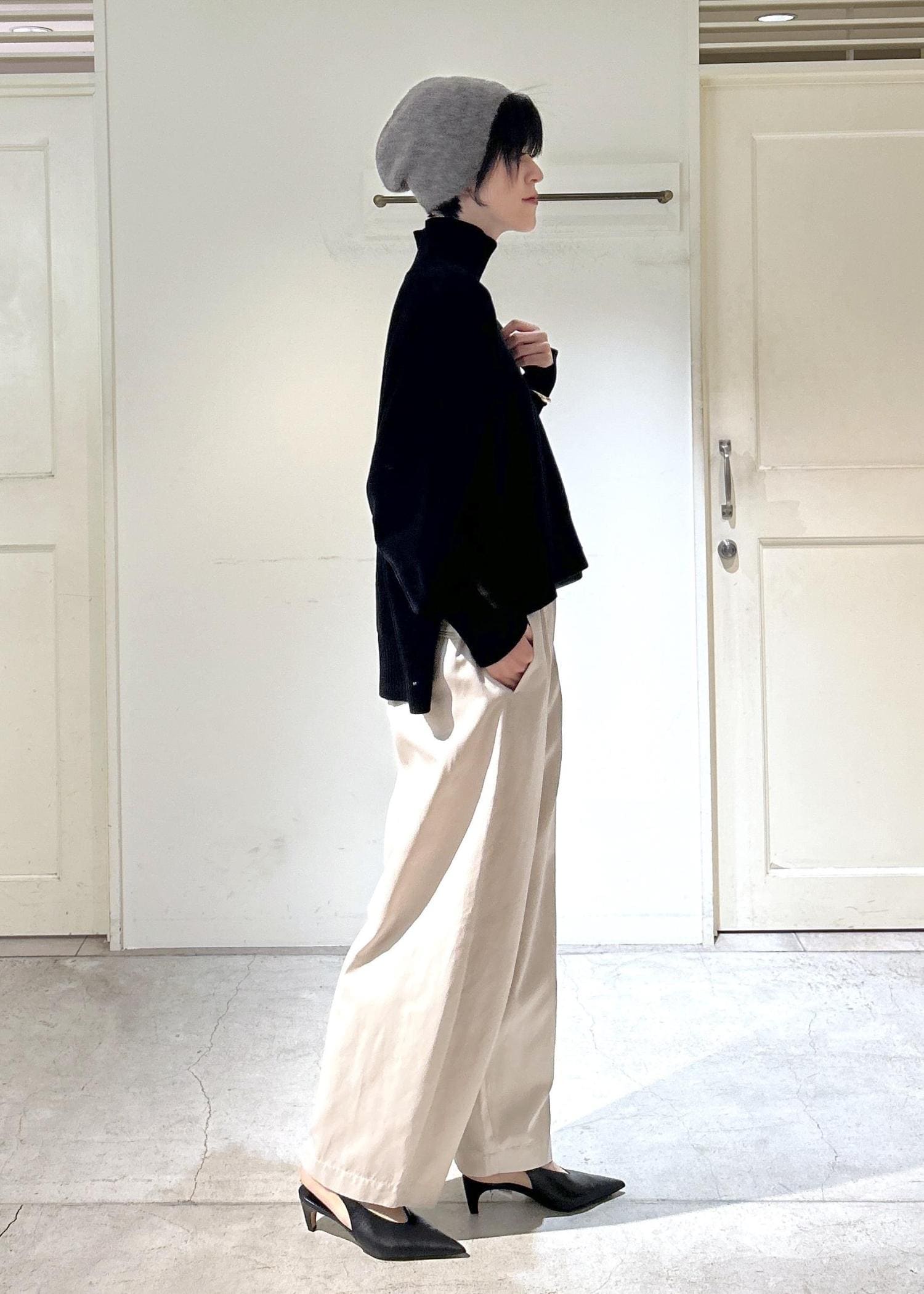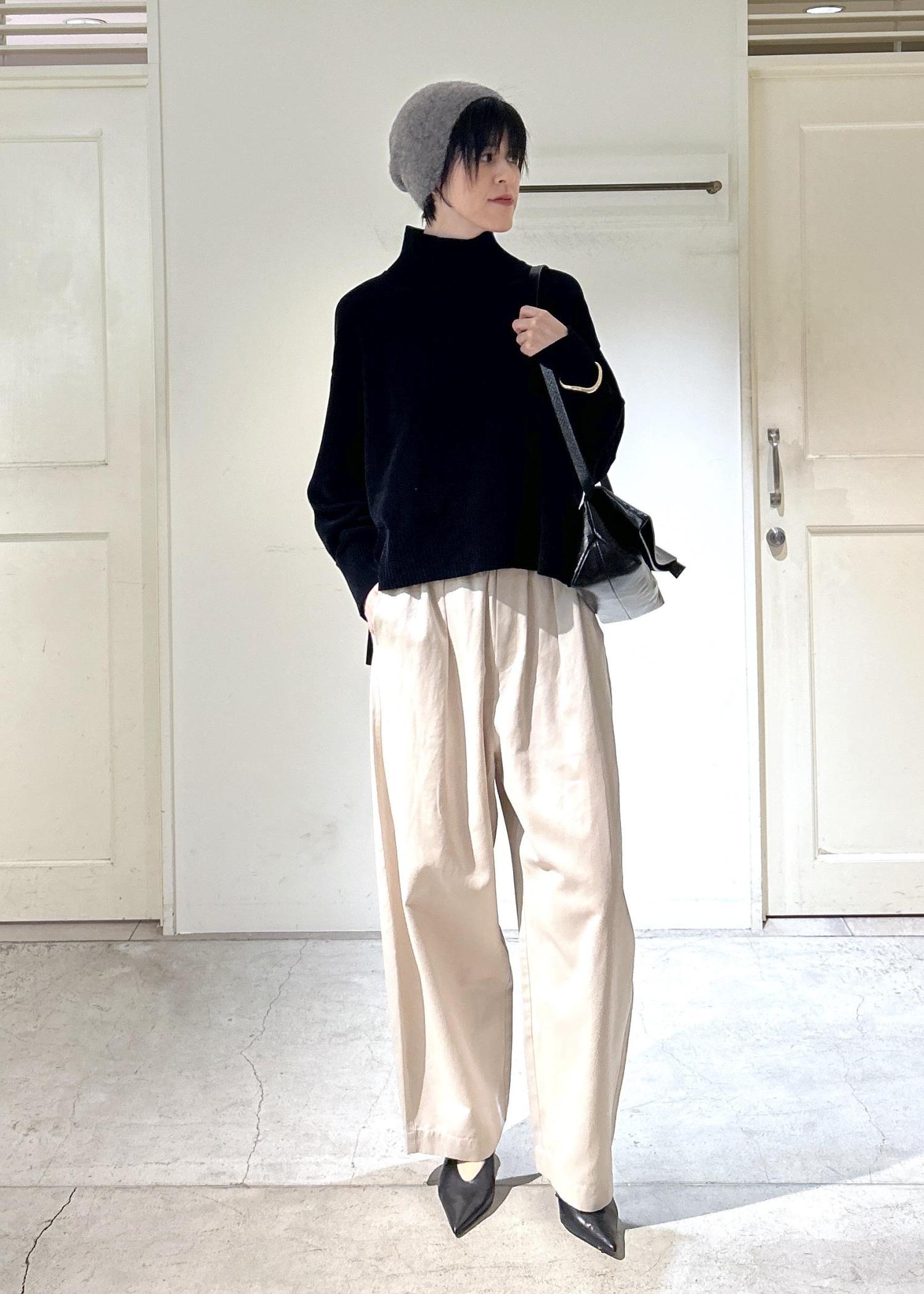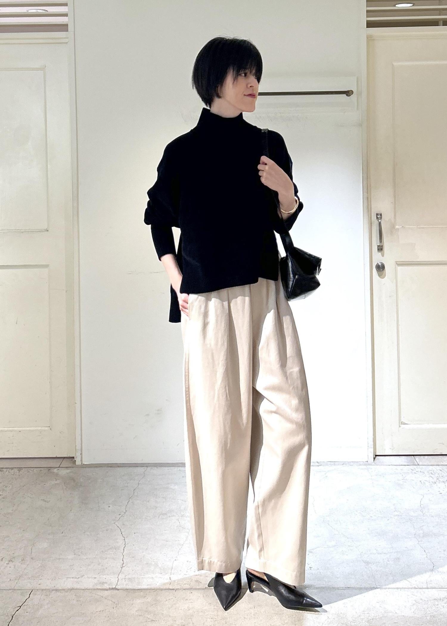SALON adam et ropéタートルネックプルオーバー-CreamyCotton /クリーミーコットン-ブラック / F¥19,800レビュー身長171cmで、丈はお尻が隠れるくらいの長さ。身幅はゆったりしていて、首周りは程よくフィット感があります。肉厚で肌触りが良く、シワになりにくいのも嬉しいポイントです。