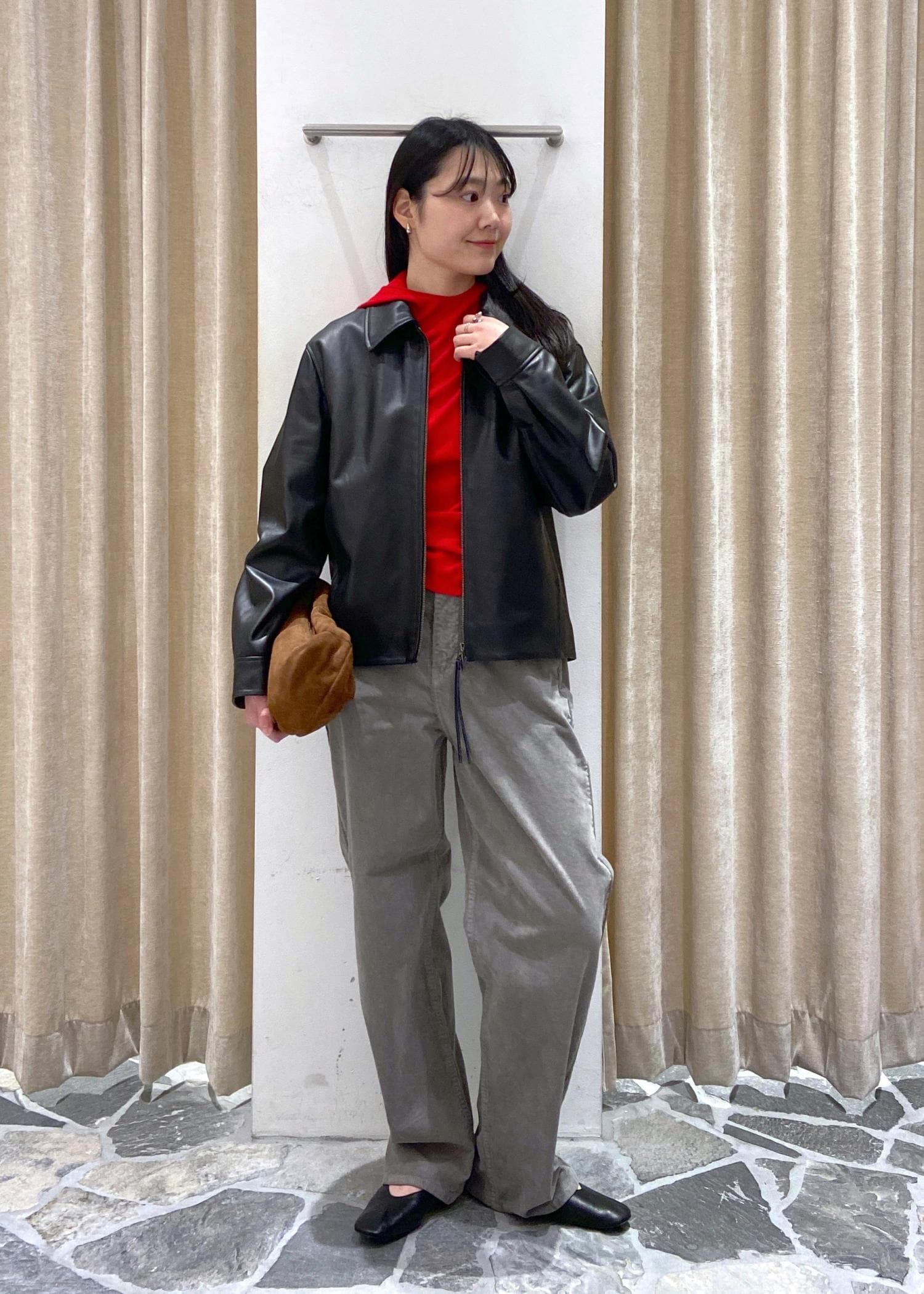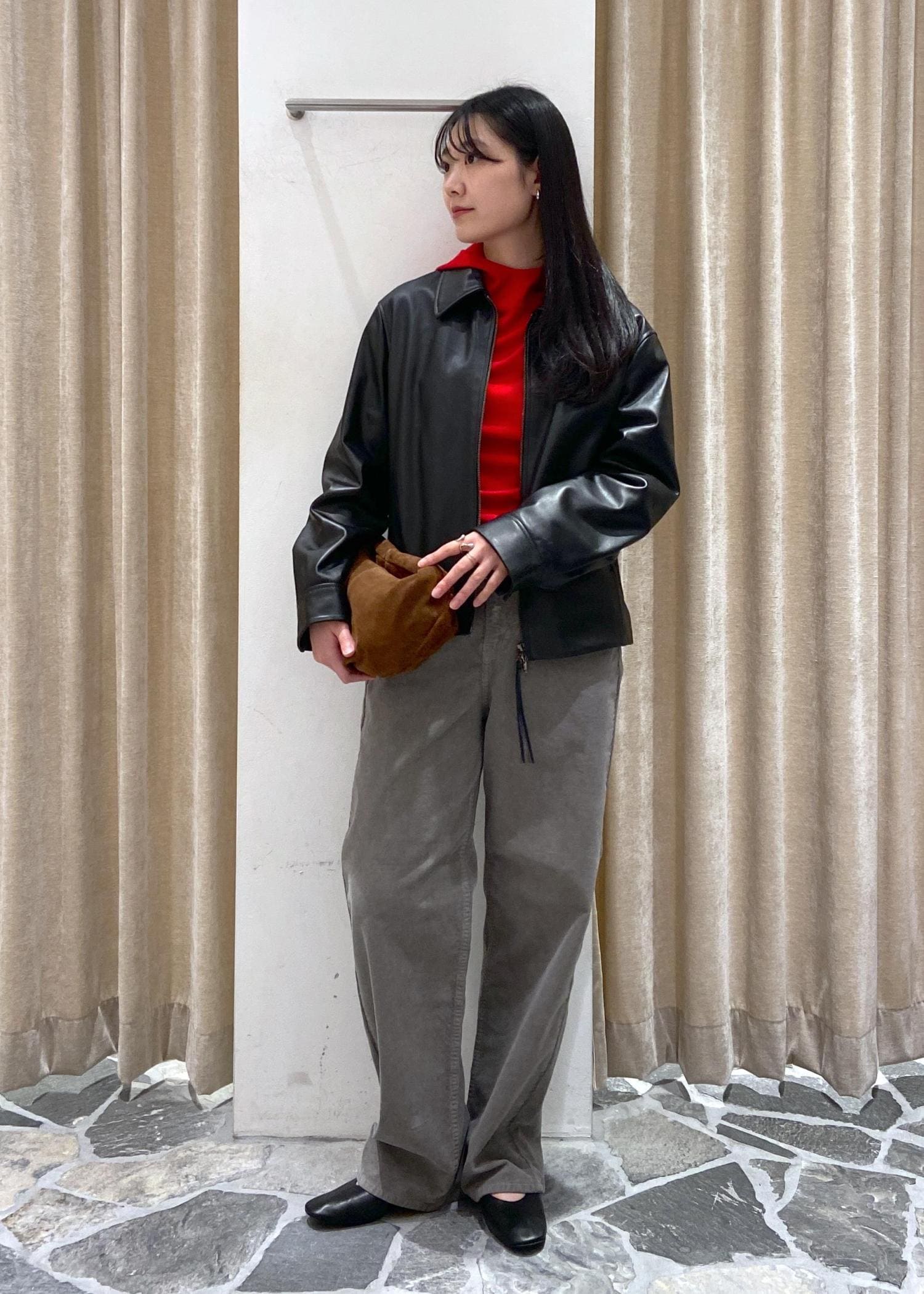 レザージャケットに赤を差し色にしたコーデ。メリージェーンやグレーのゆったりしたコーデュロイパンツでハードすぎない印象に。