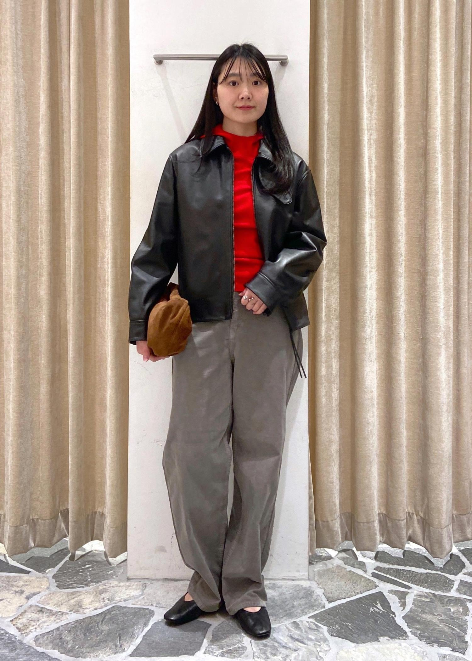 レザージャケット×差し色ニット