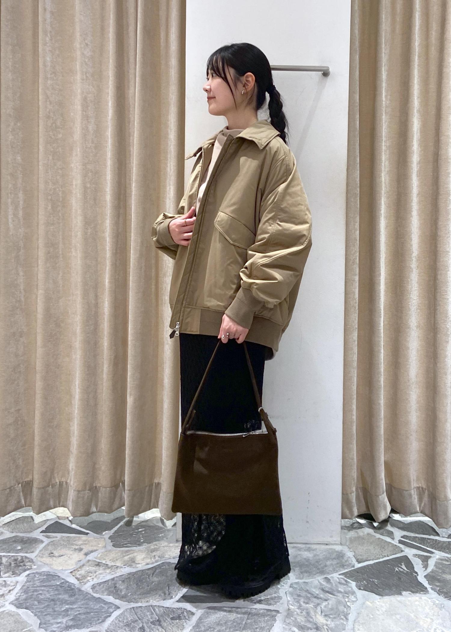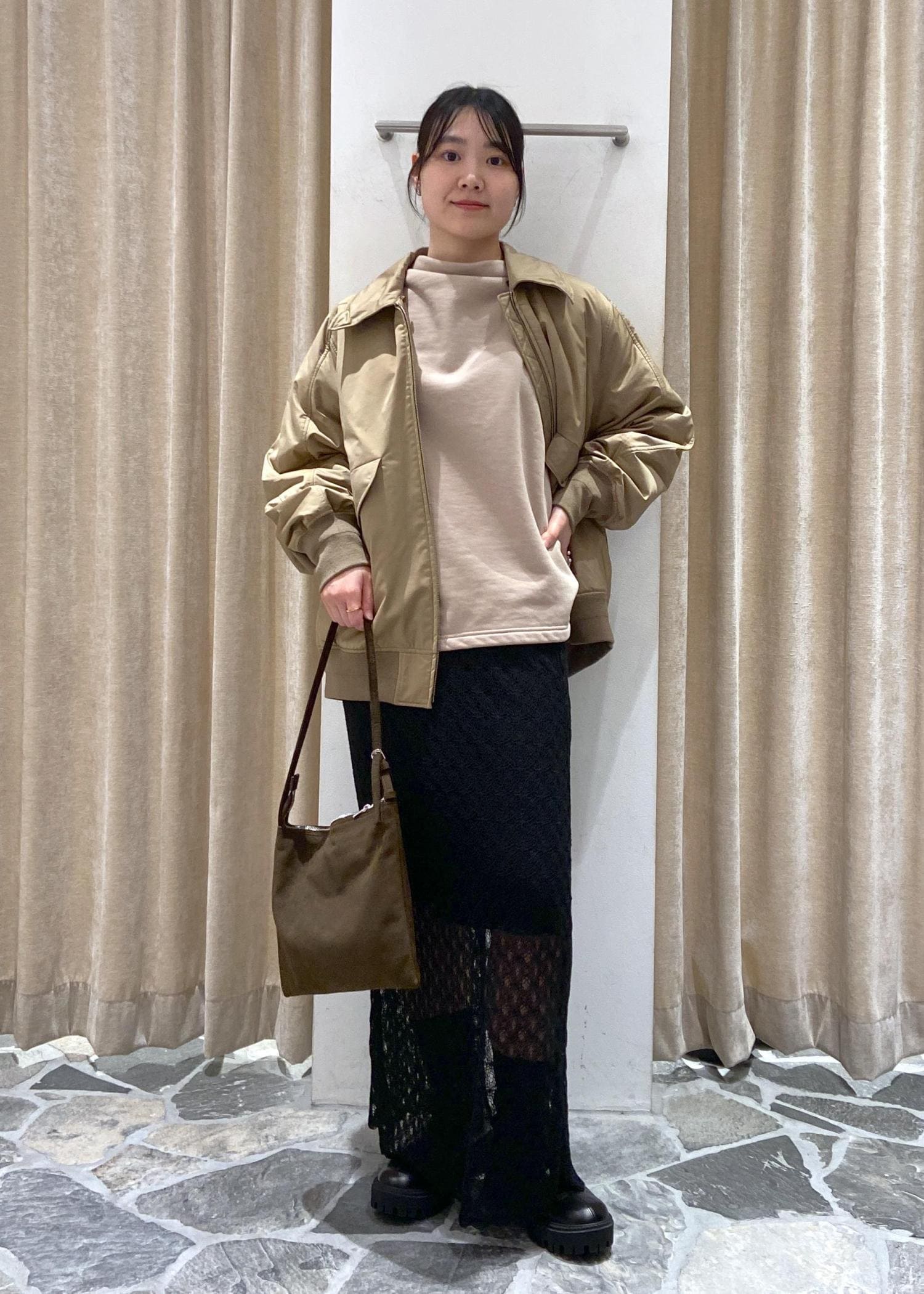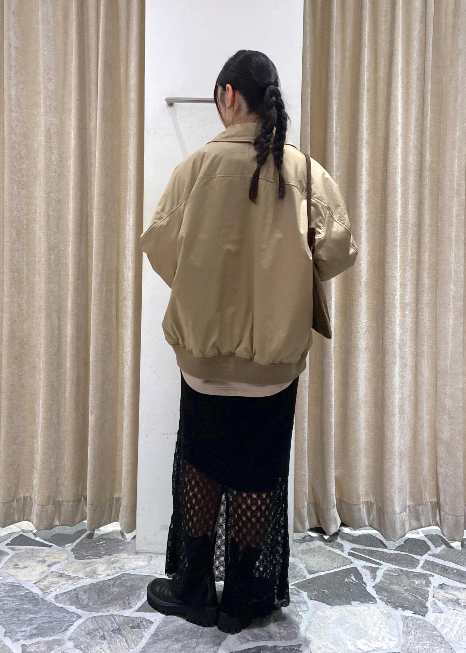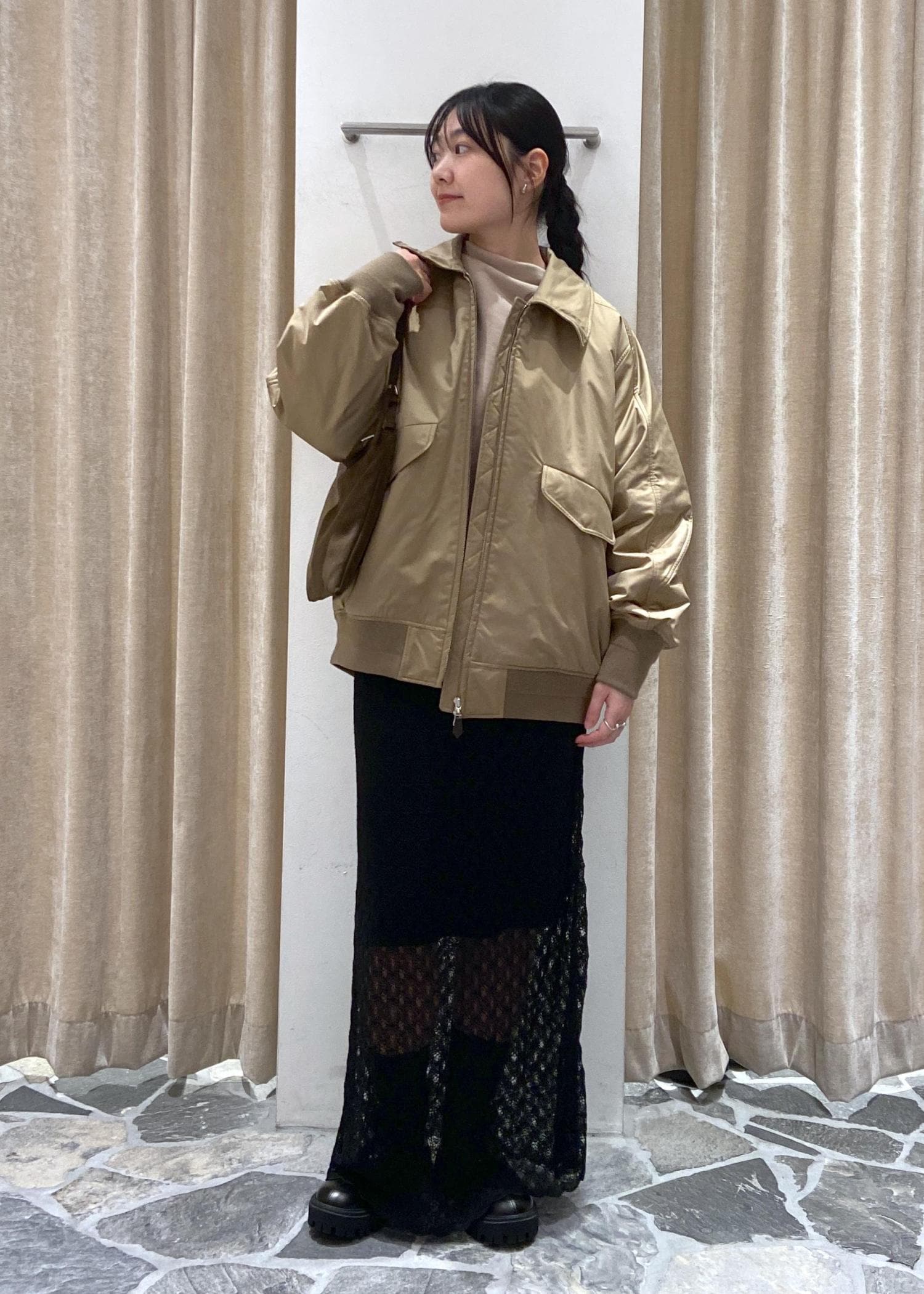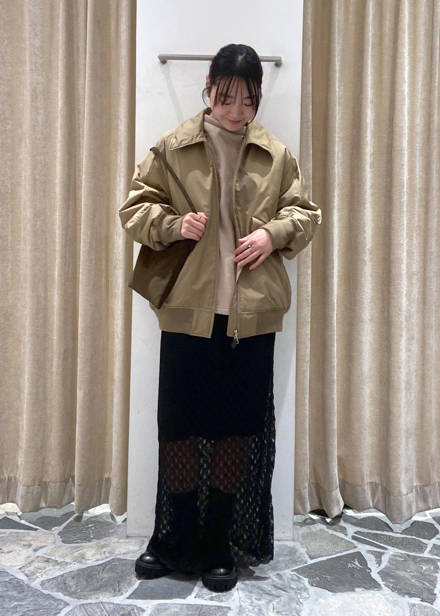 少しフェミニンな印象もプラスしたいので、ファーは外してレースのスカートを合わせてみました。