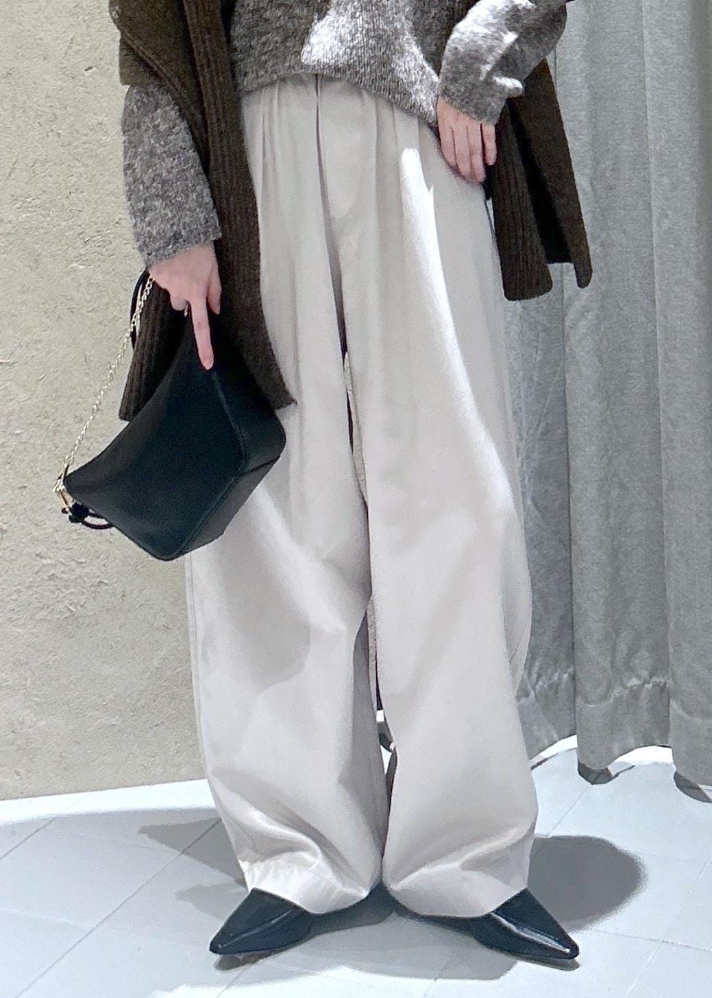 サテンパンツの光沢感が、ニットと相性抜群です◎
