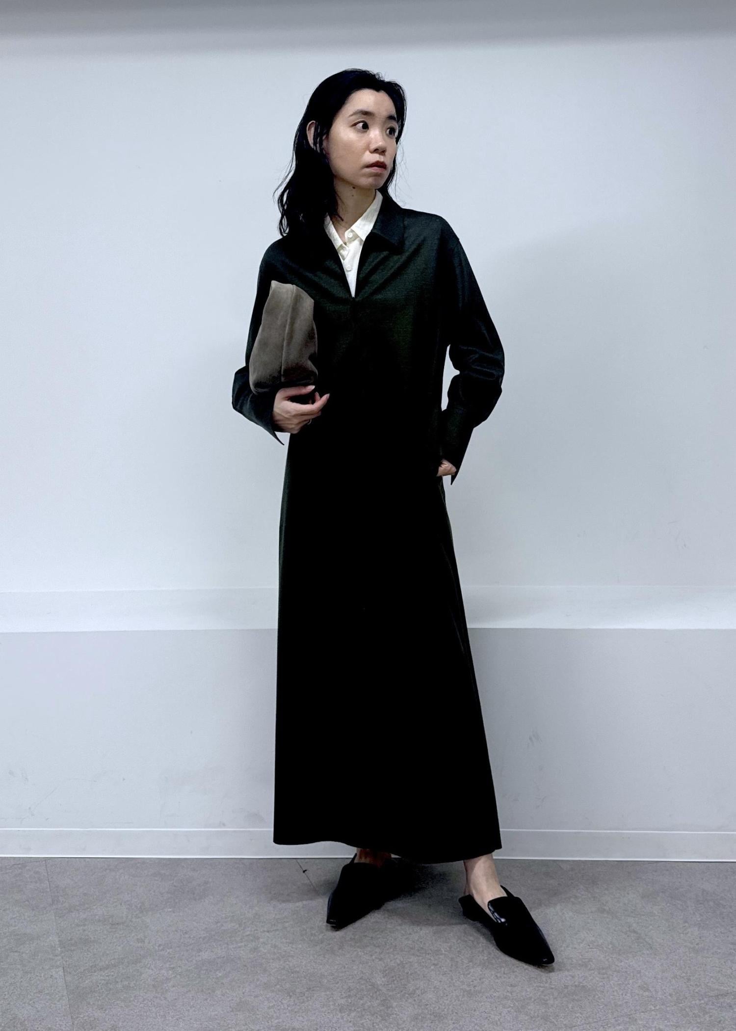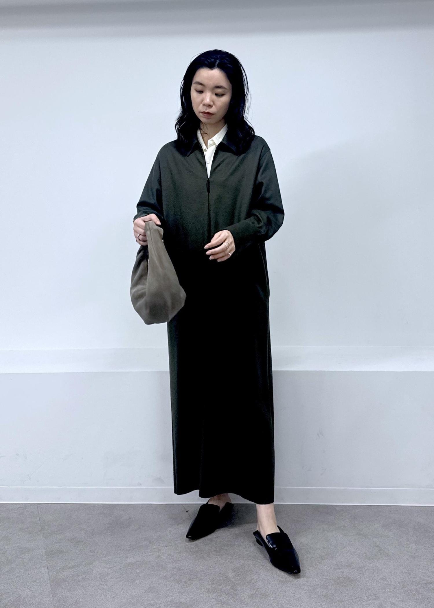 品のあるカーキで、これからクリスマスシーズン、人と会うシーンで使いたいワンピース