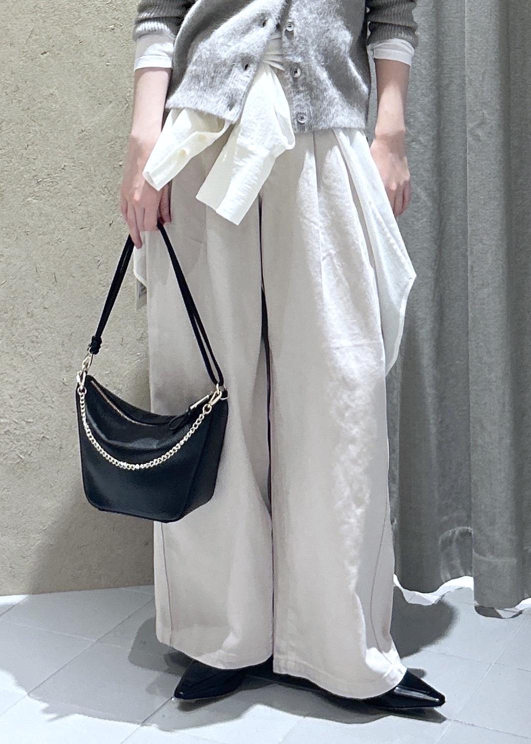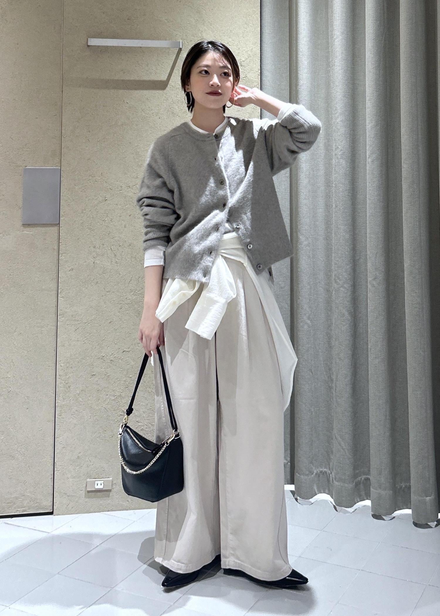 スタイリングをワントーンにまとめた時は、小物でブラックやレザーなどを締めで合わせると「大人」感がプラスされます◎