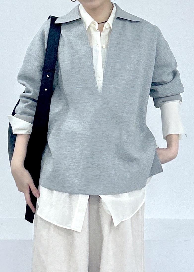 深めのスキッパーで、シャツやレースなどレイヤードして楽しんで頂けるアイテムです。