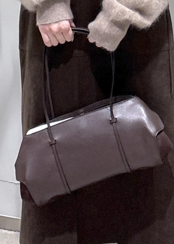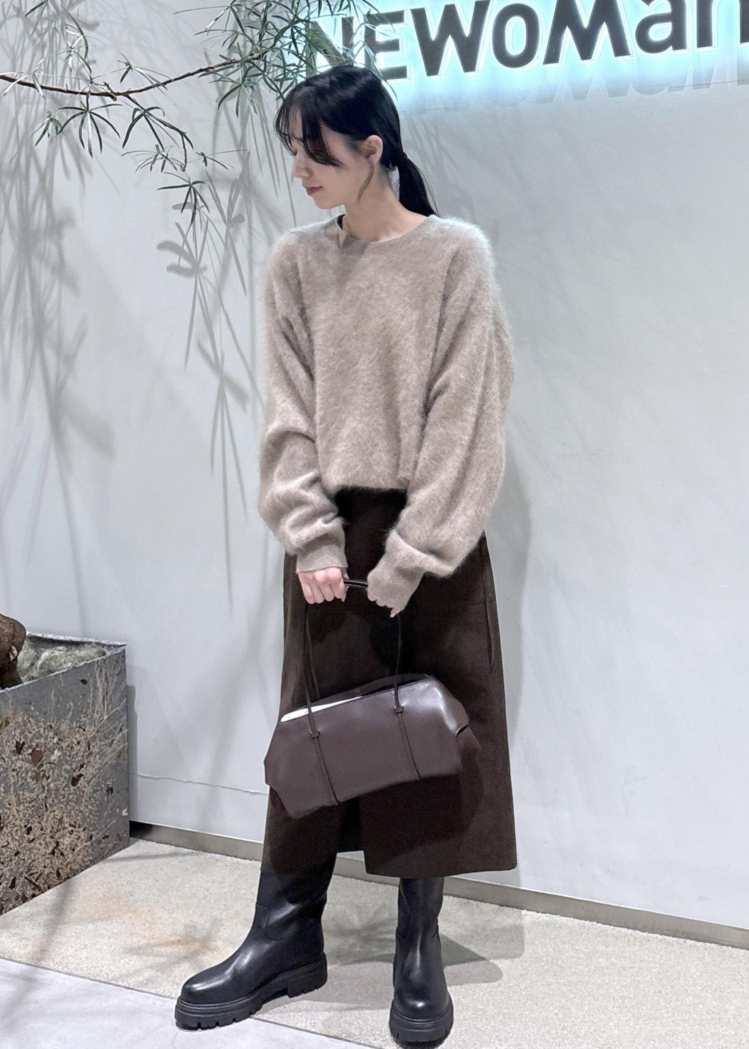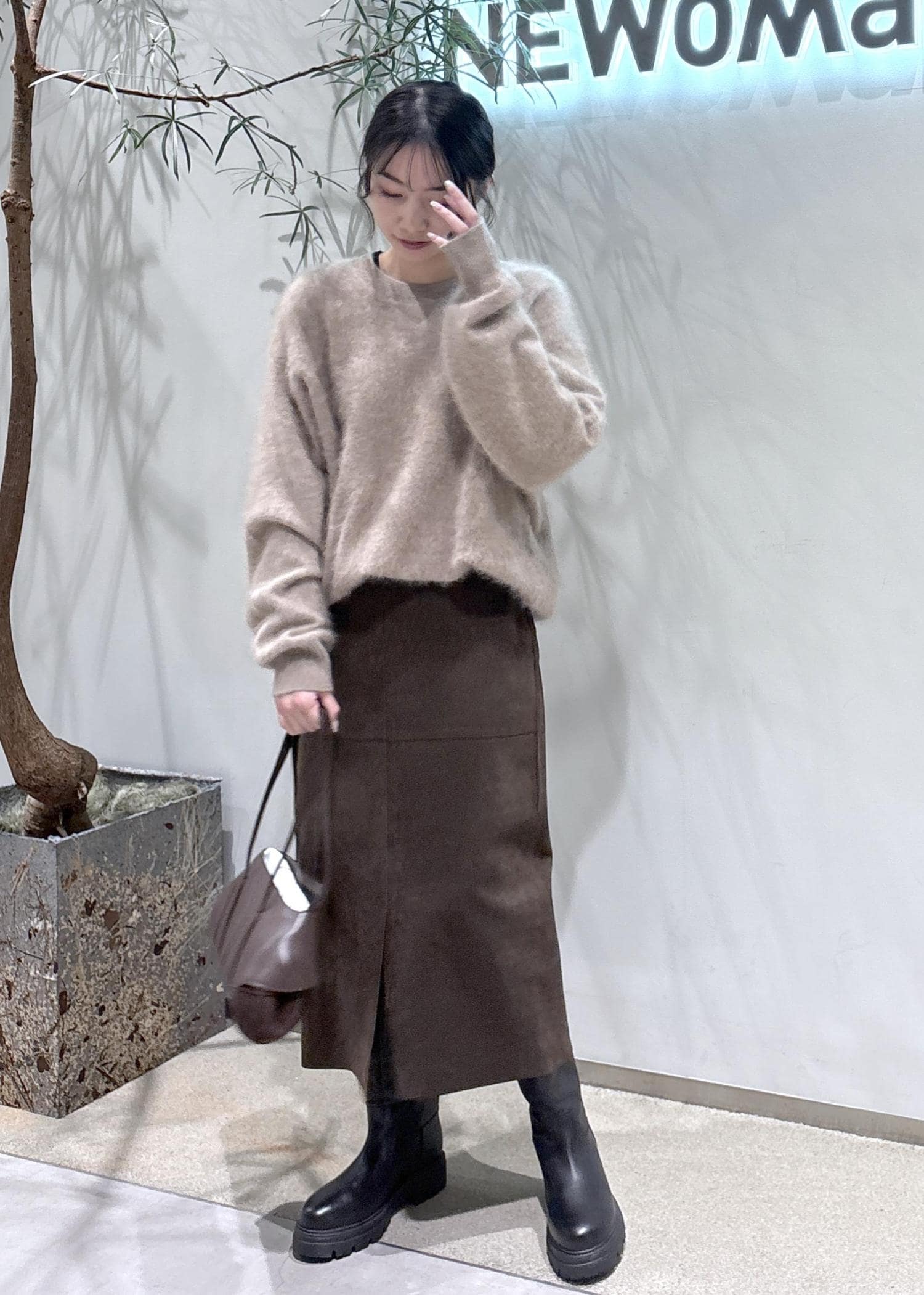 ふわっと軽いニットに、深みブラウンのスカートを合わせた冬のニュアンスコーデに仕上げました。