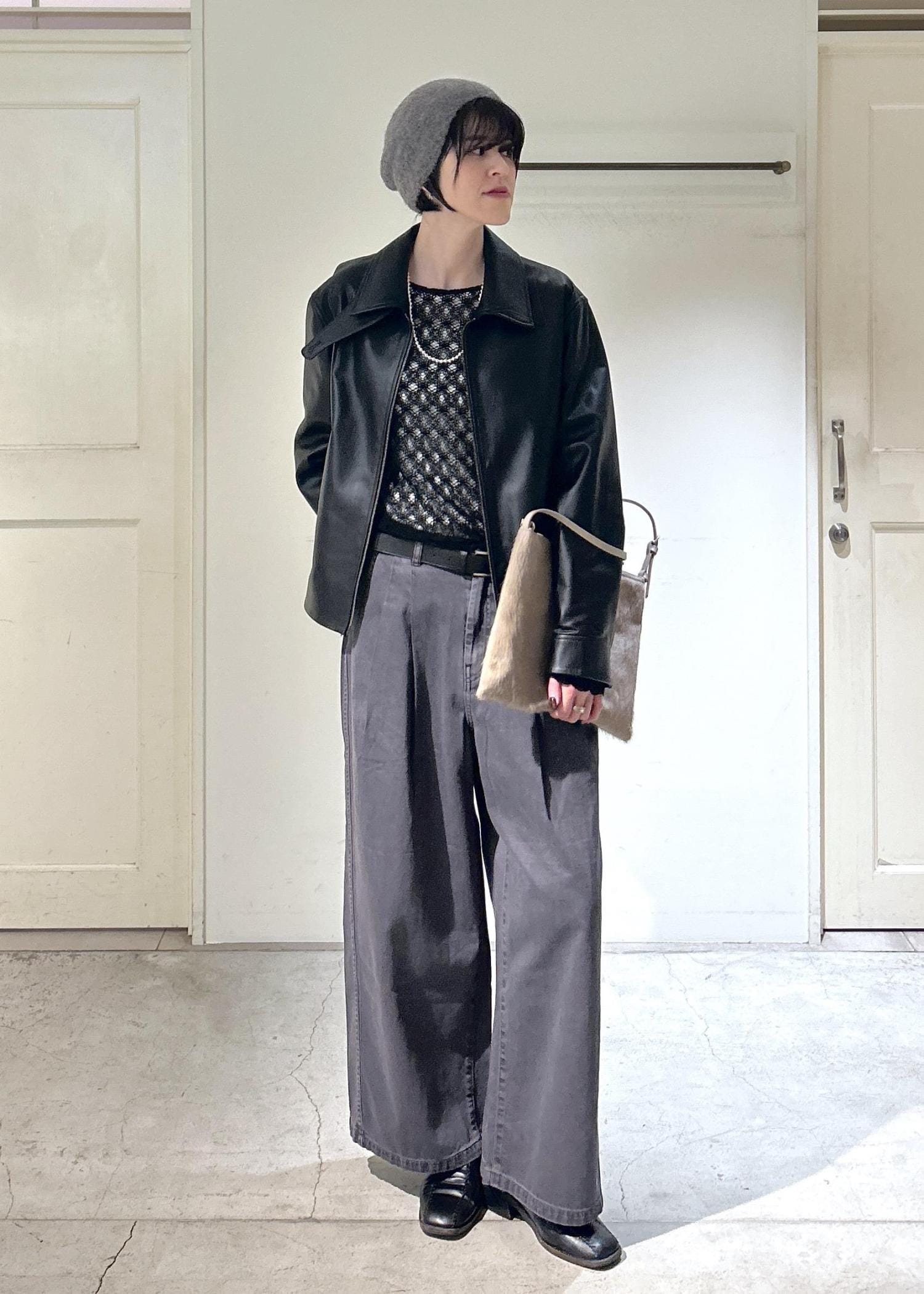 レザーブルゾンをメインにワントーンコーデを組んでみました。ハードになりすぎないよう、フラワーレースのブラウスで女性らしさをプラスしたのがポイントです。