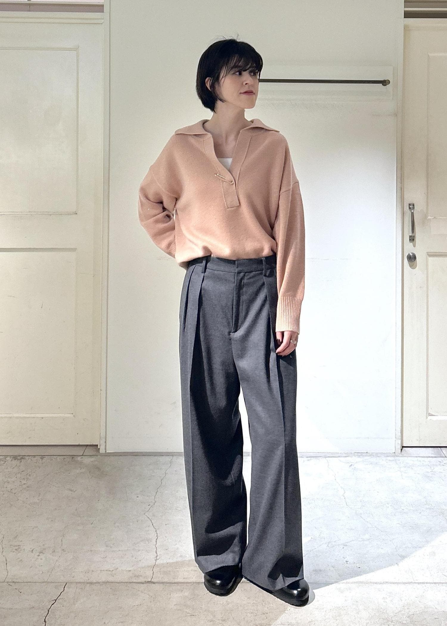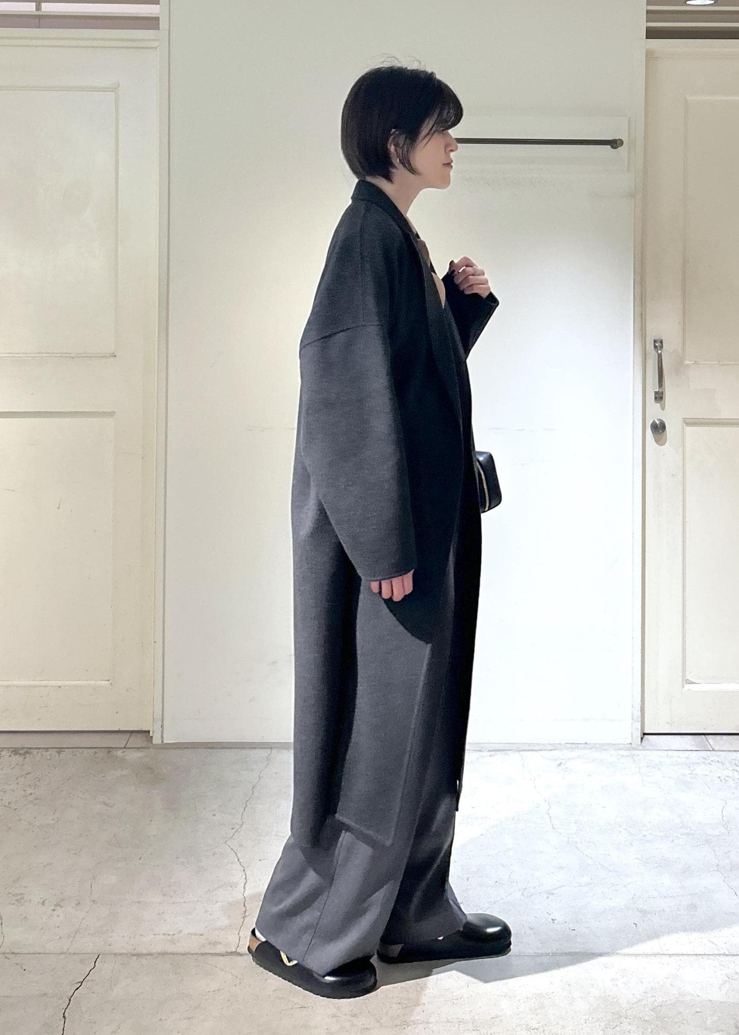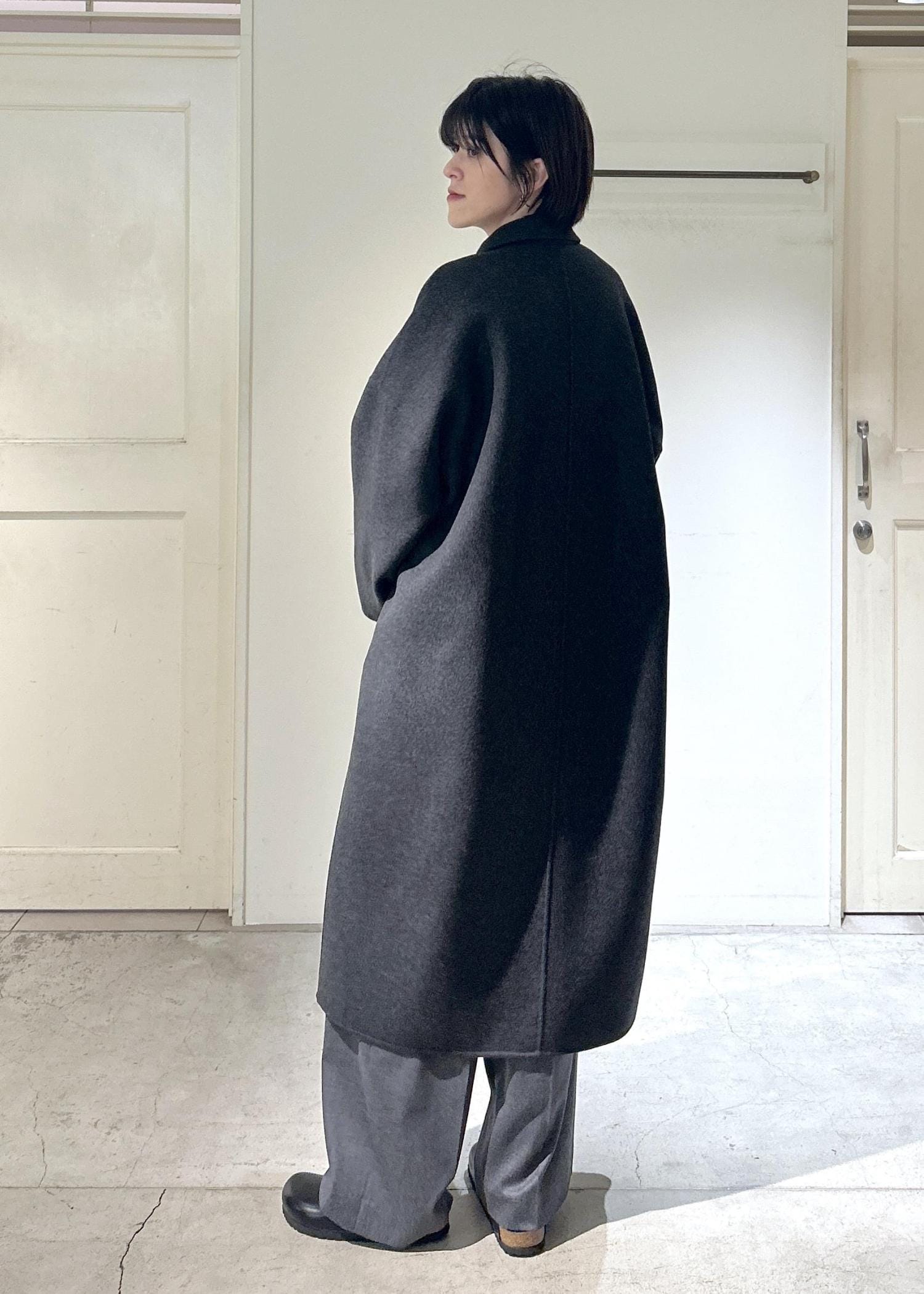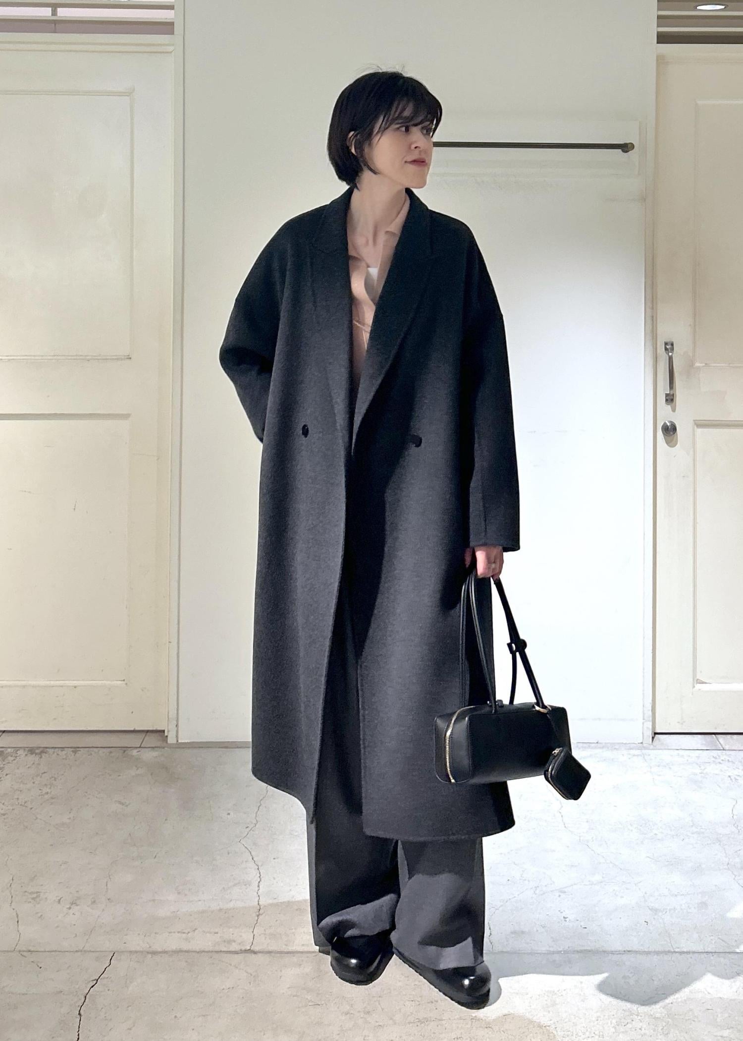 シンプルなタックパンツと合わせて、グレーのコートでまとめました!