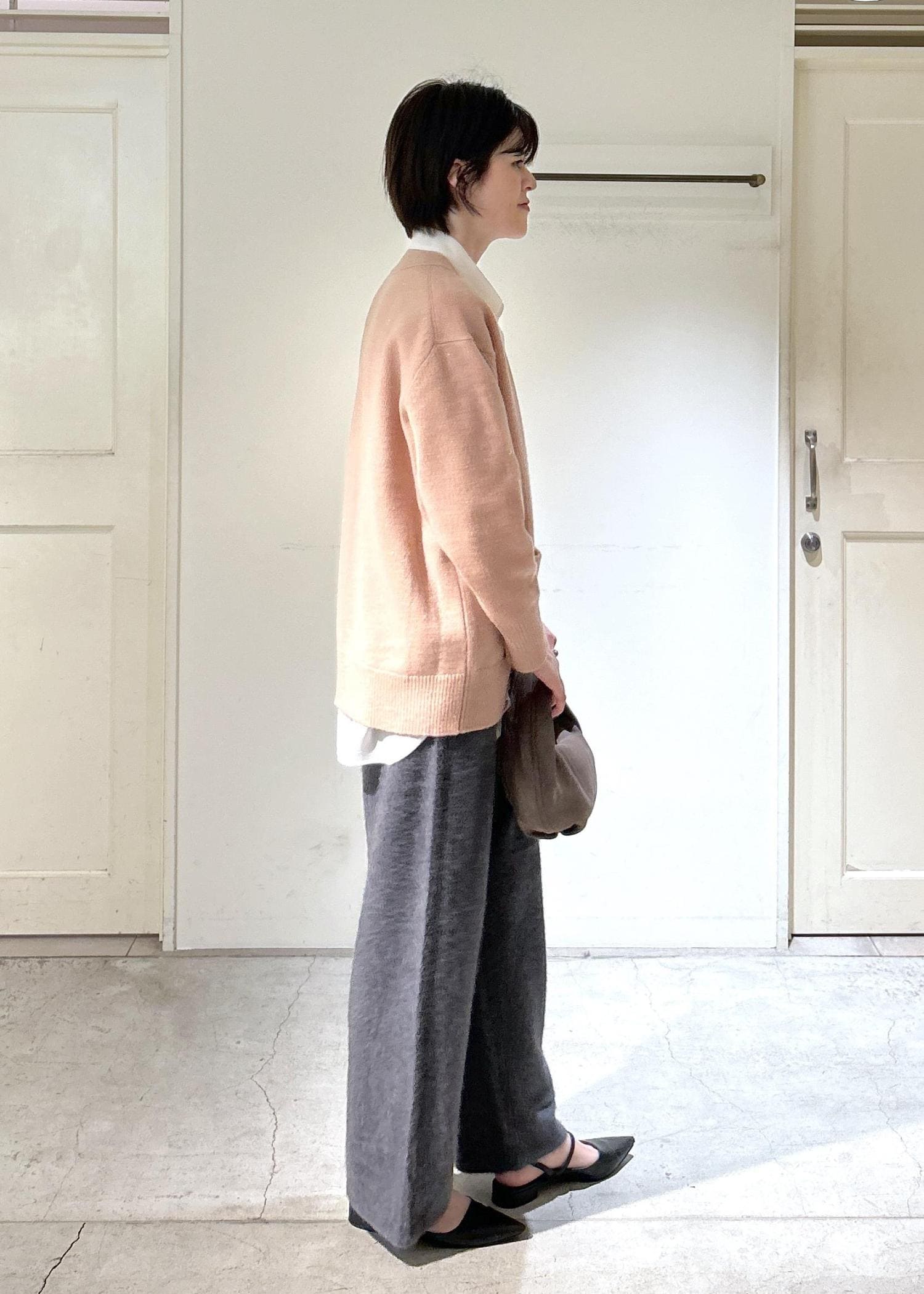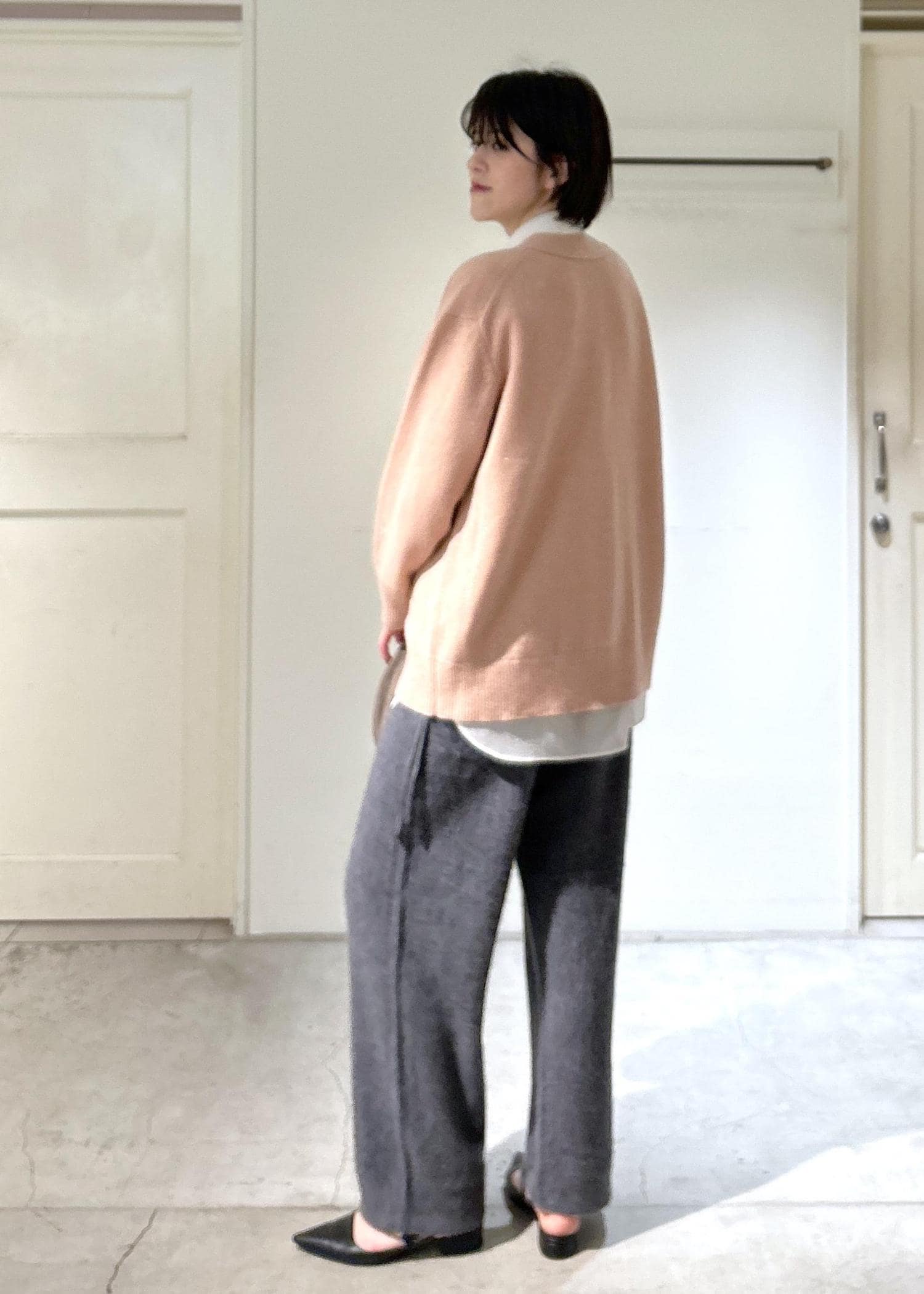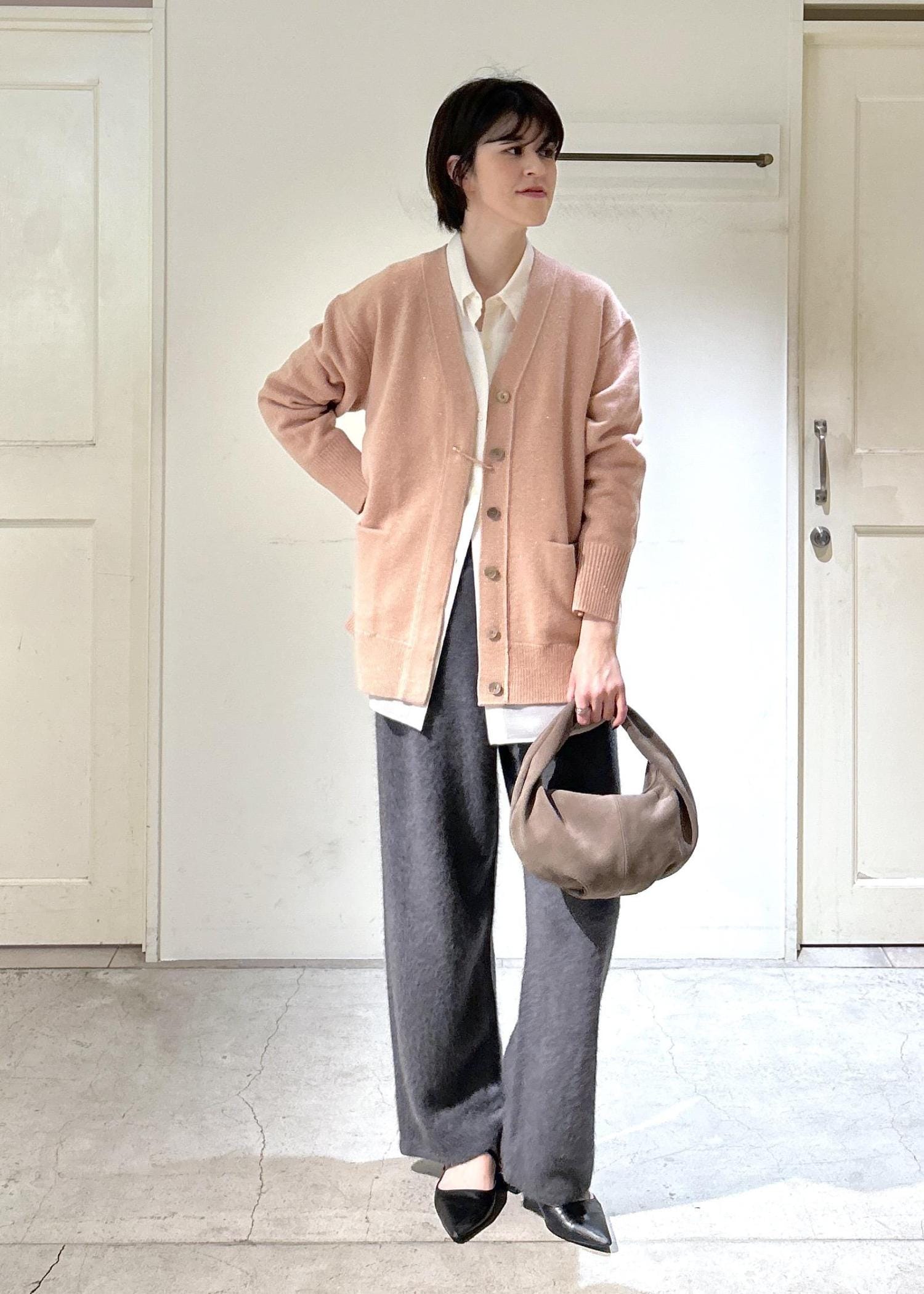 スパンコールニットのカーディガンとフォックスウールのパンツを合わせて、リラックスコーデを組んでみました。