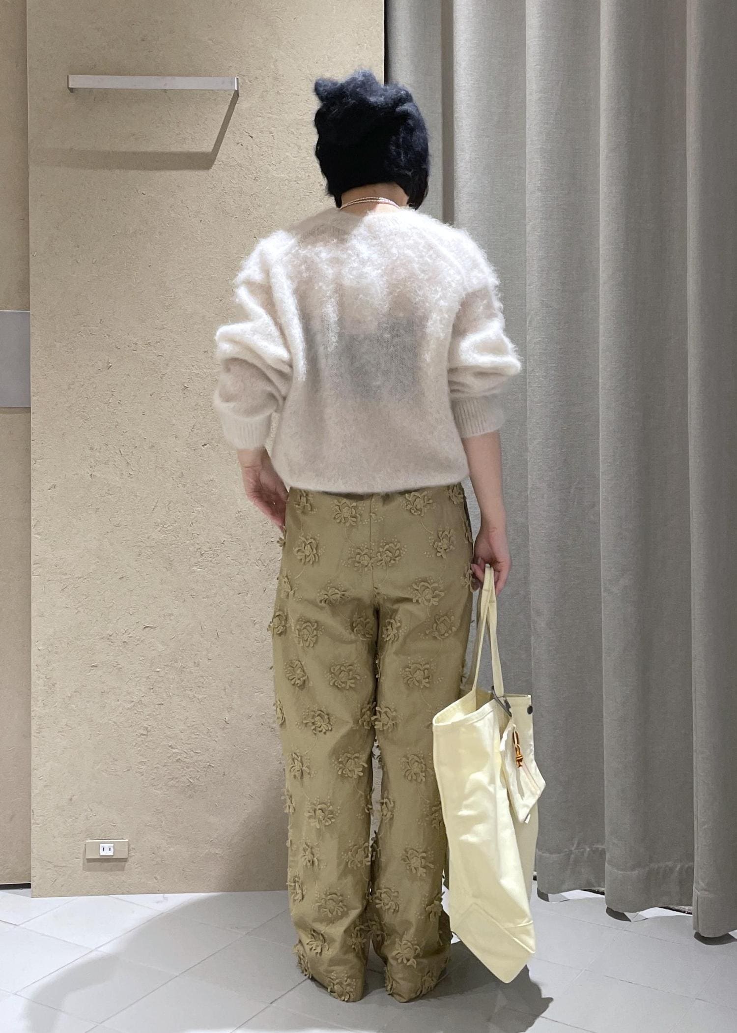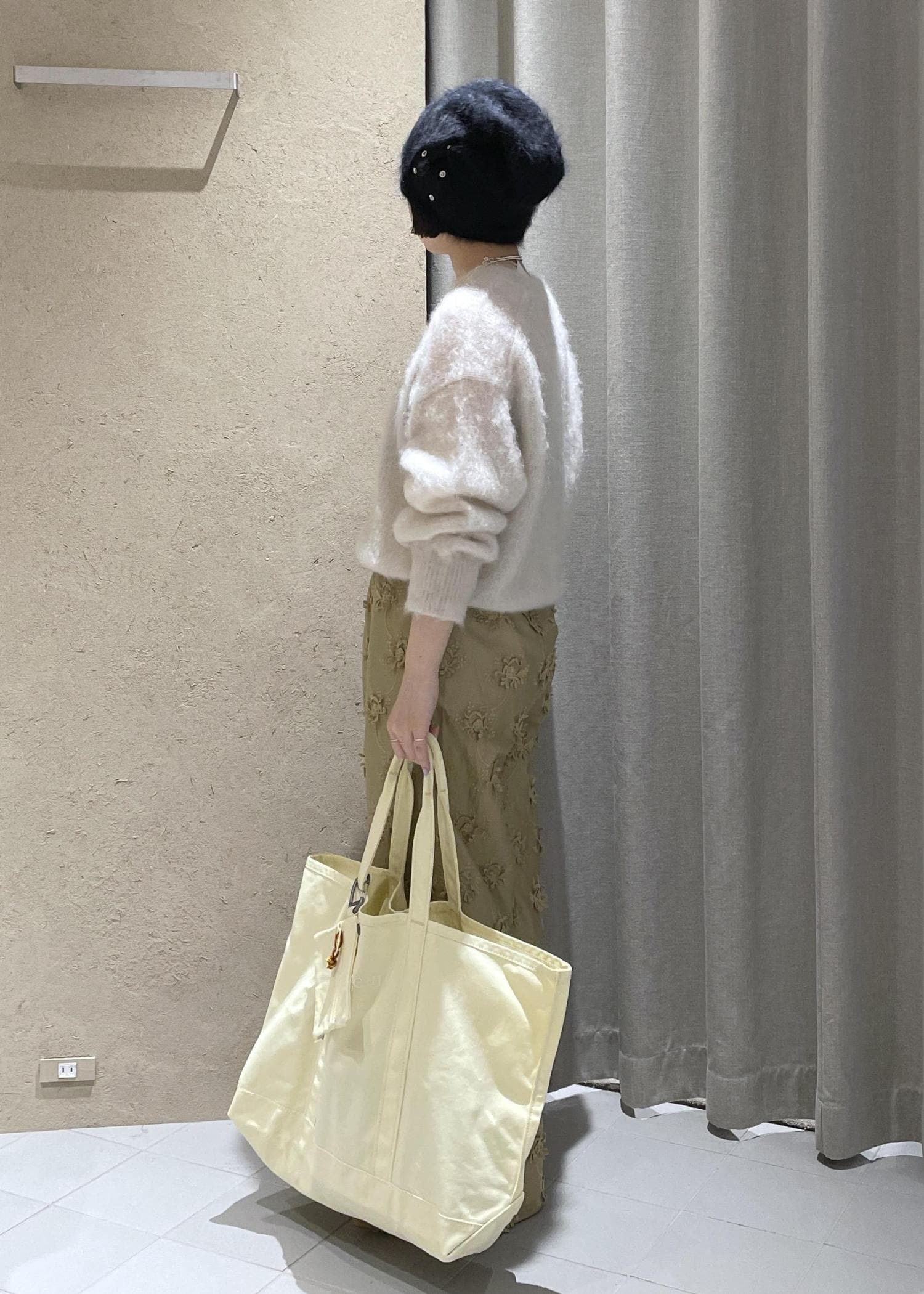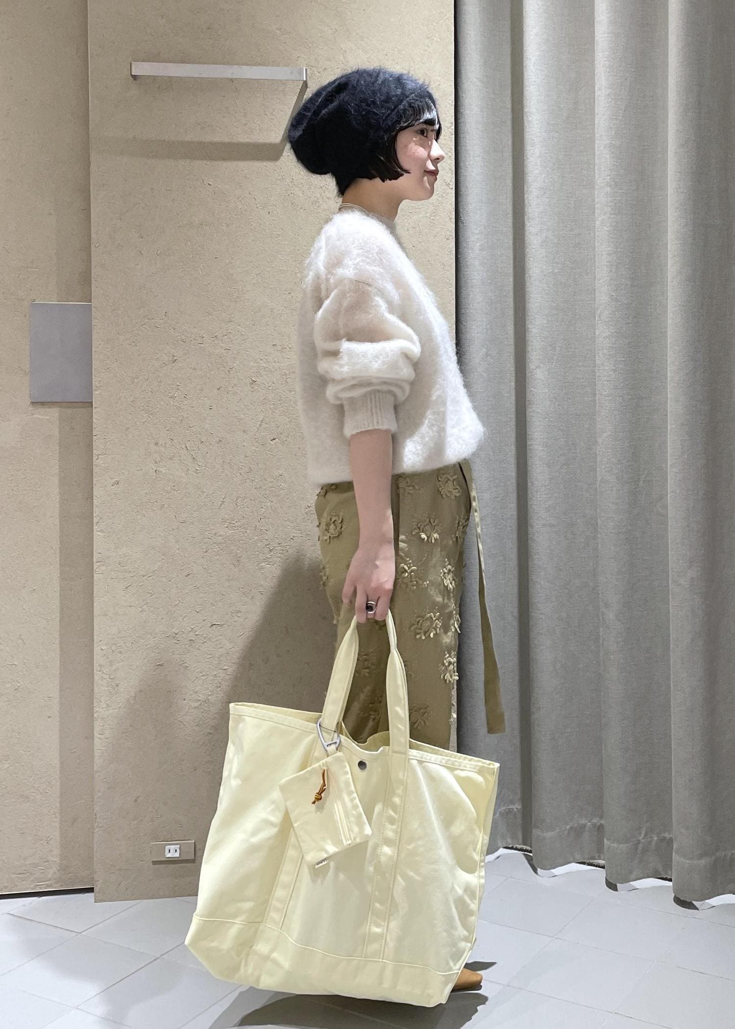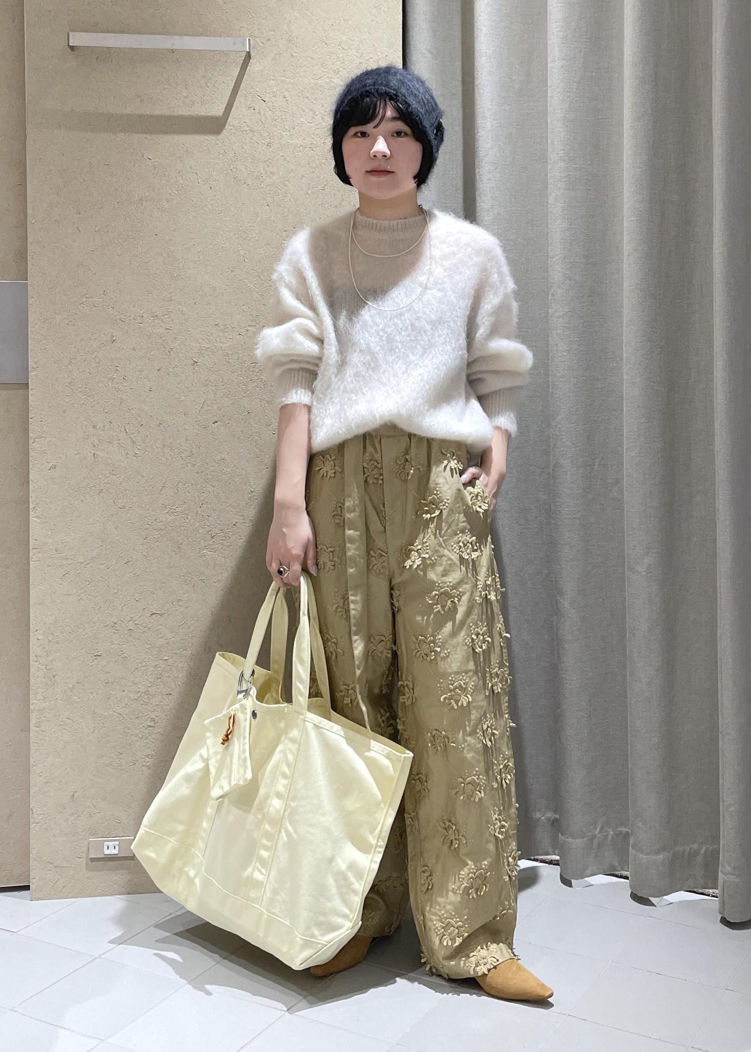 トップスはファンも多いBATONARのニット。ジャパンメイドの形の良いニットは年代問わず使っていただきやすいサイズ感です。モヘヤ100%で若干チクチク感はありますが、気にならない程度です。