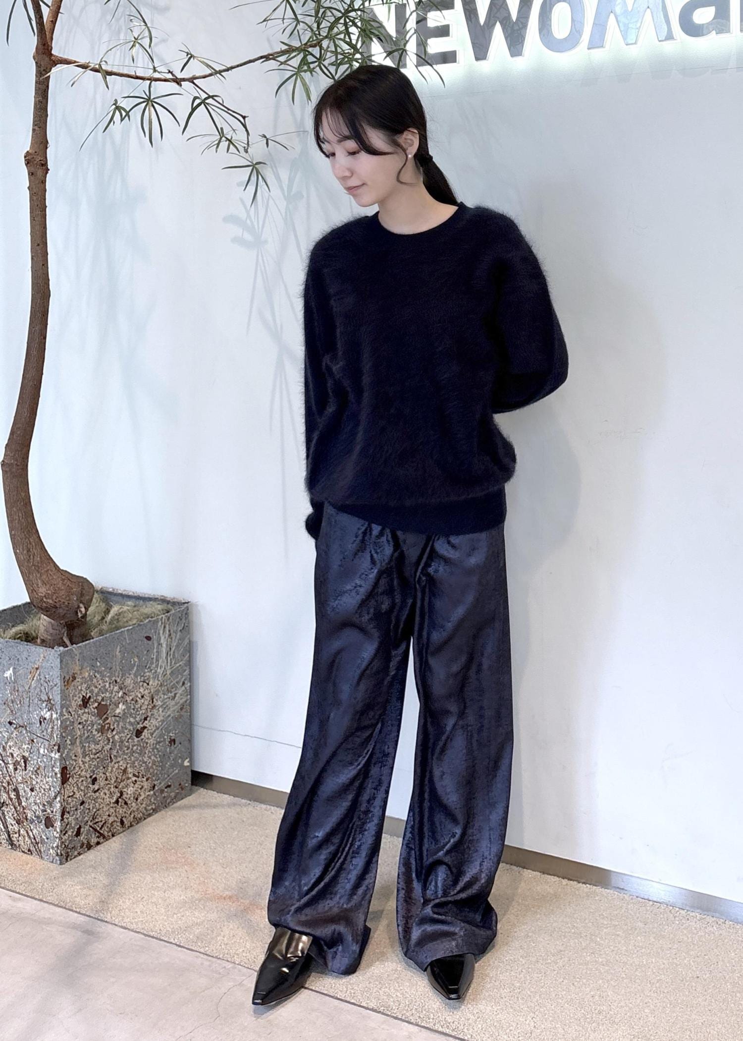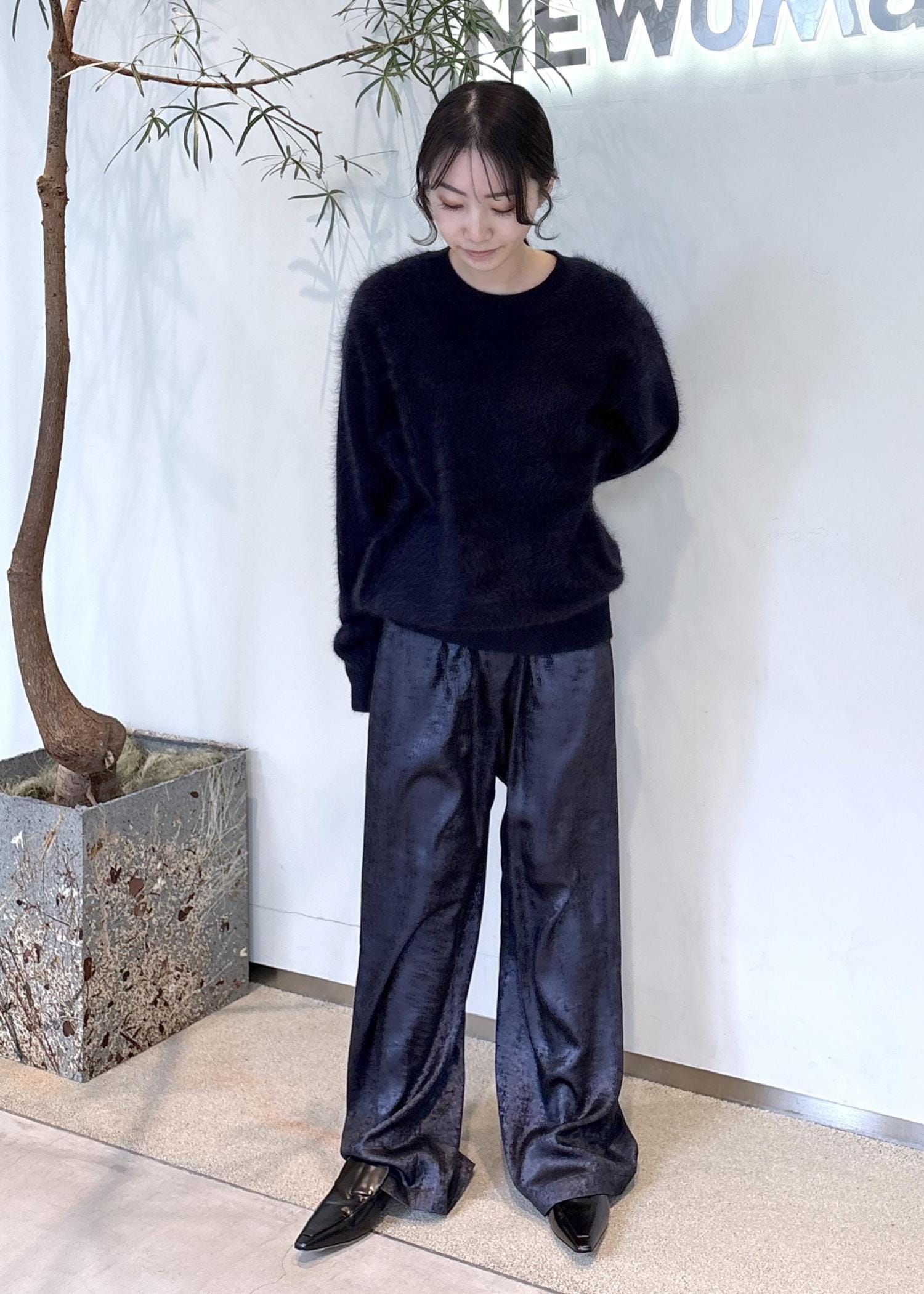 パンツが歩くたびに揺れるため、オールブラックでも軽さのある印象にしました。
