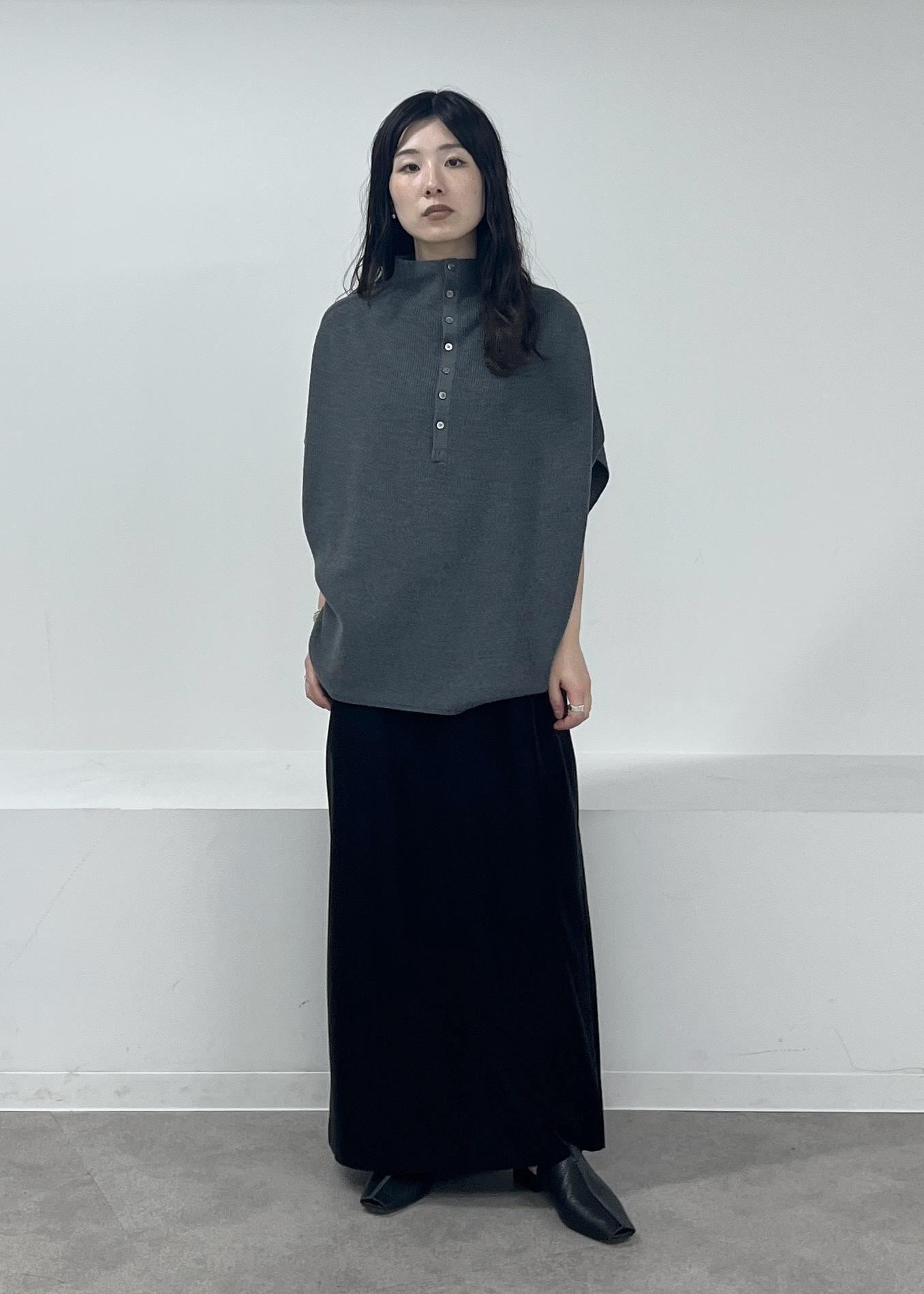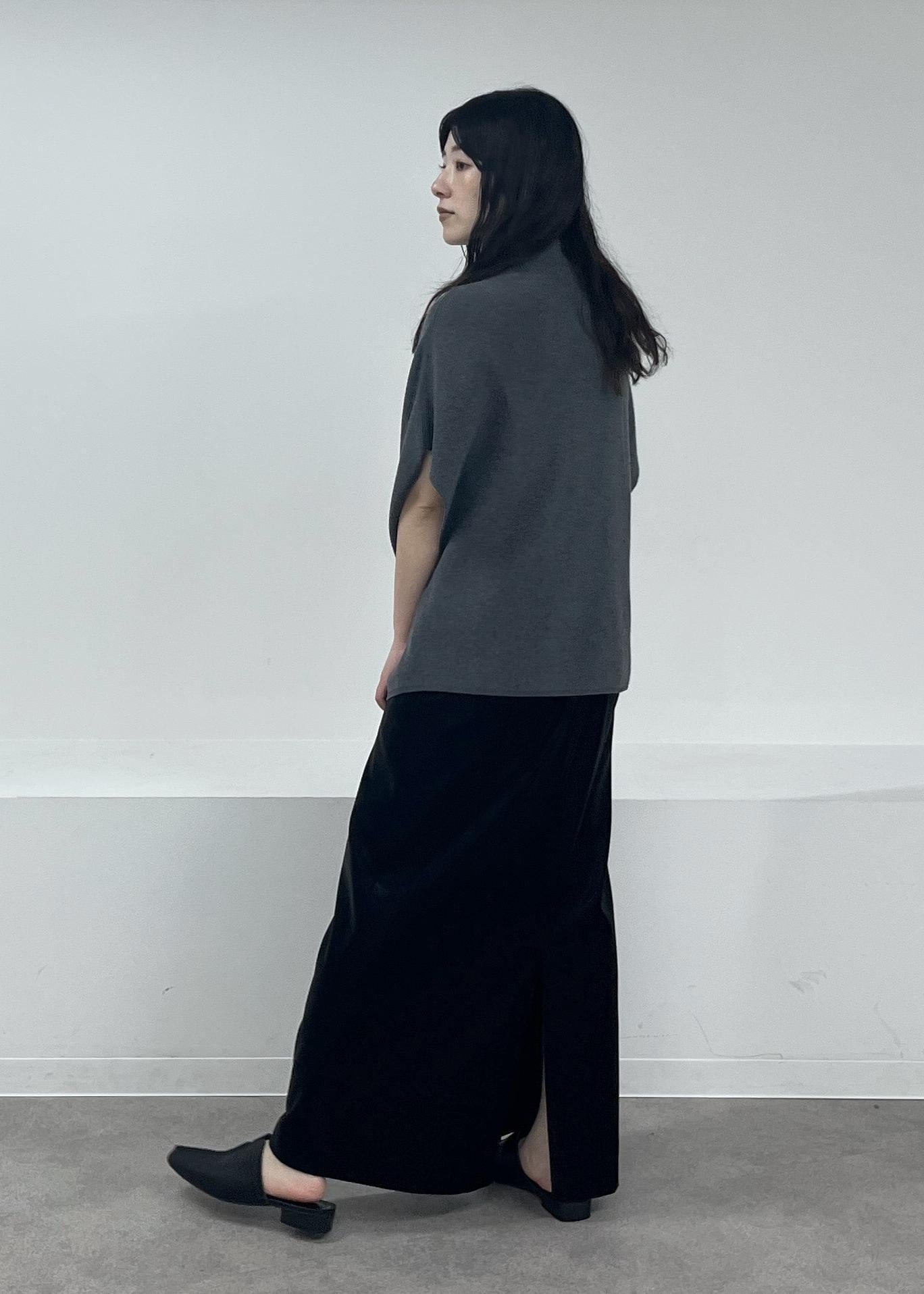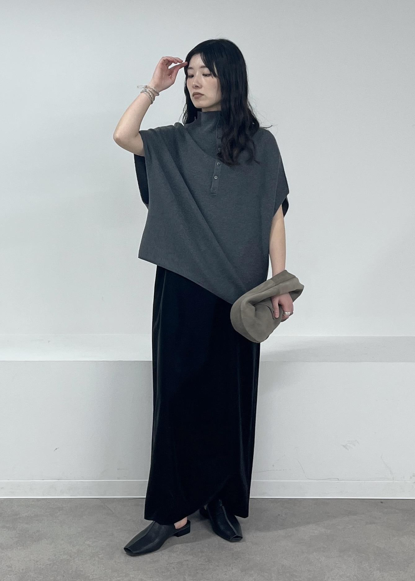 ゆったりとしたシルエット。首の半分辺りまでのハイネックにもなります。脇周りは空いてます。