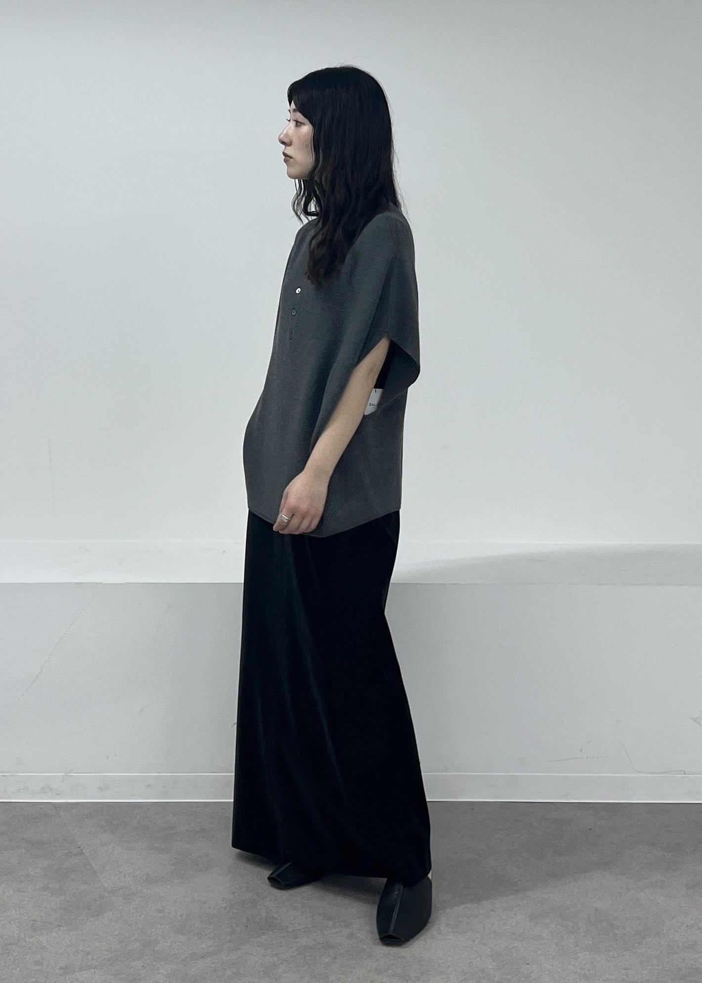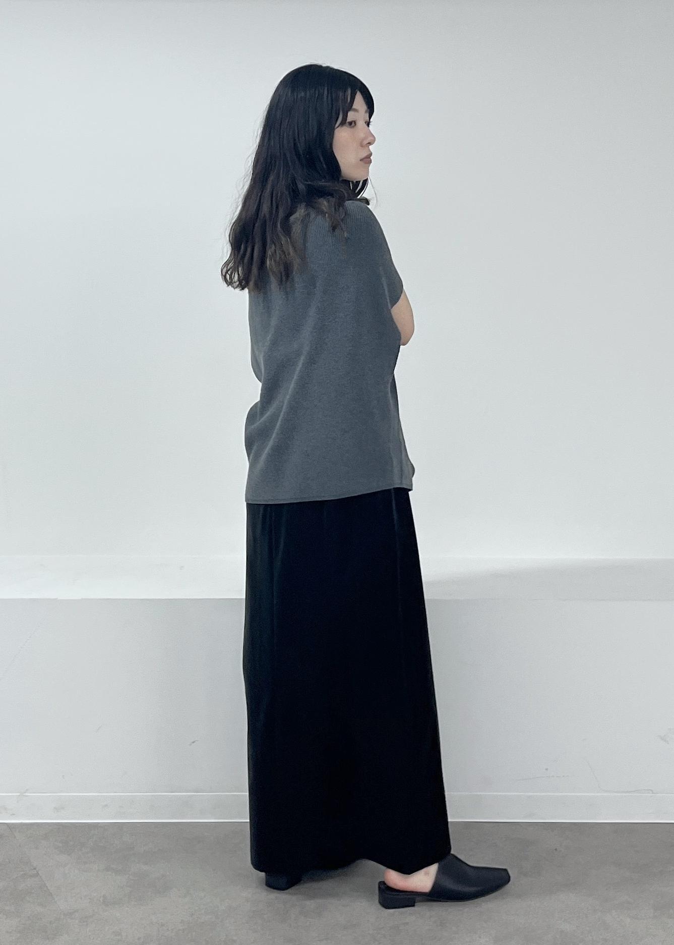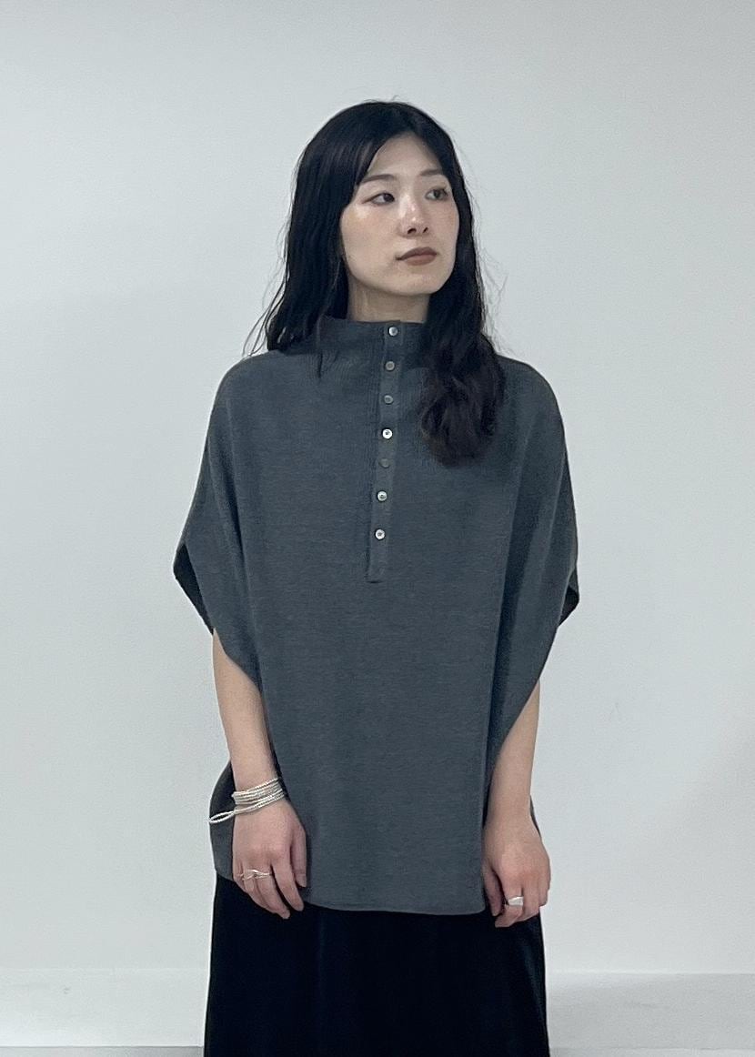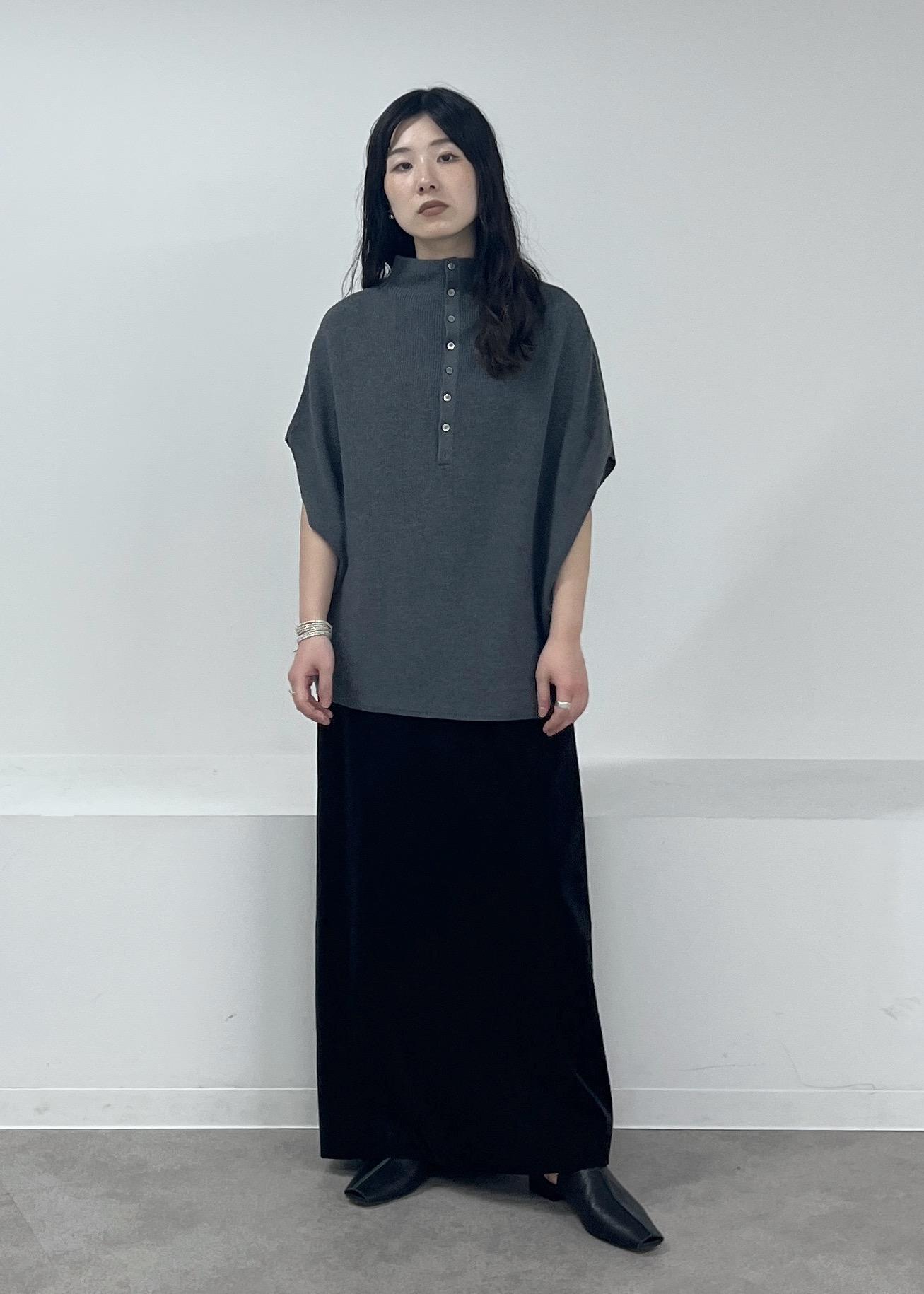 ゆったりとしたシルエット。首の半分辺りまでのハイネックにもなります。脇周りは空いてます。