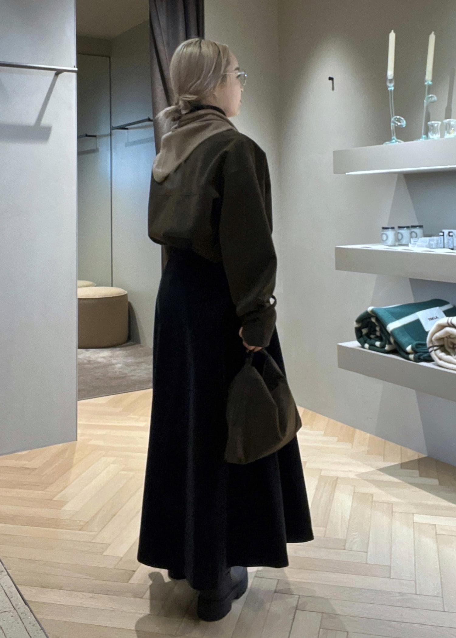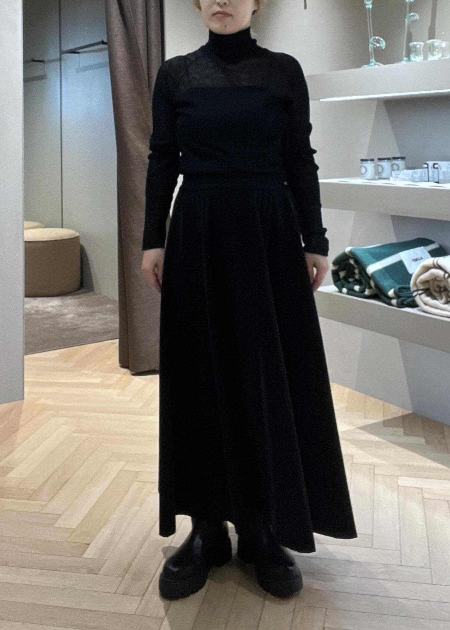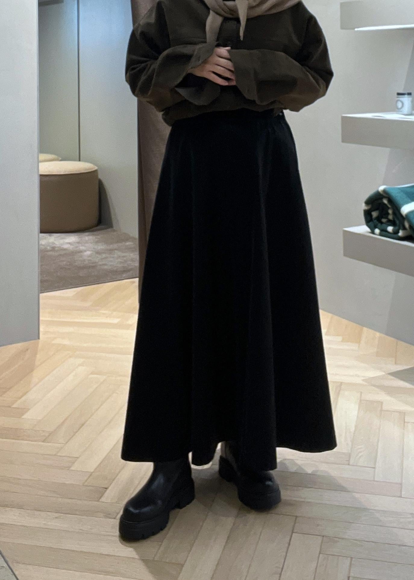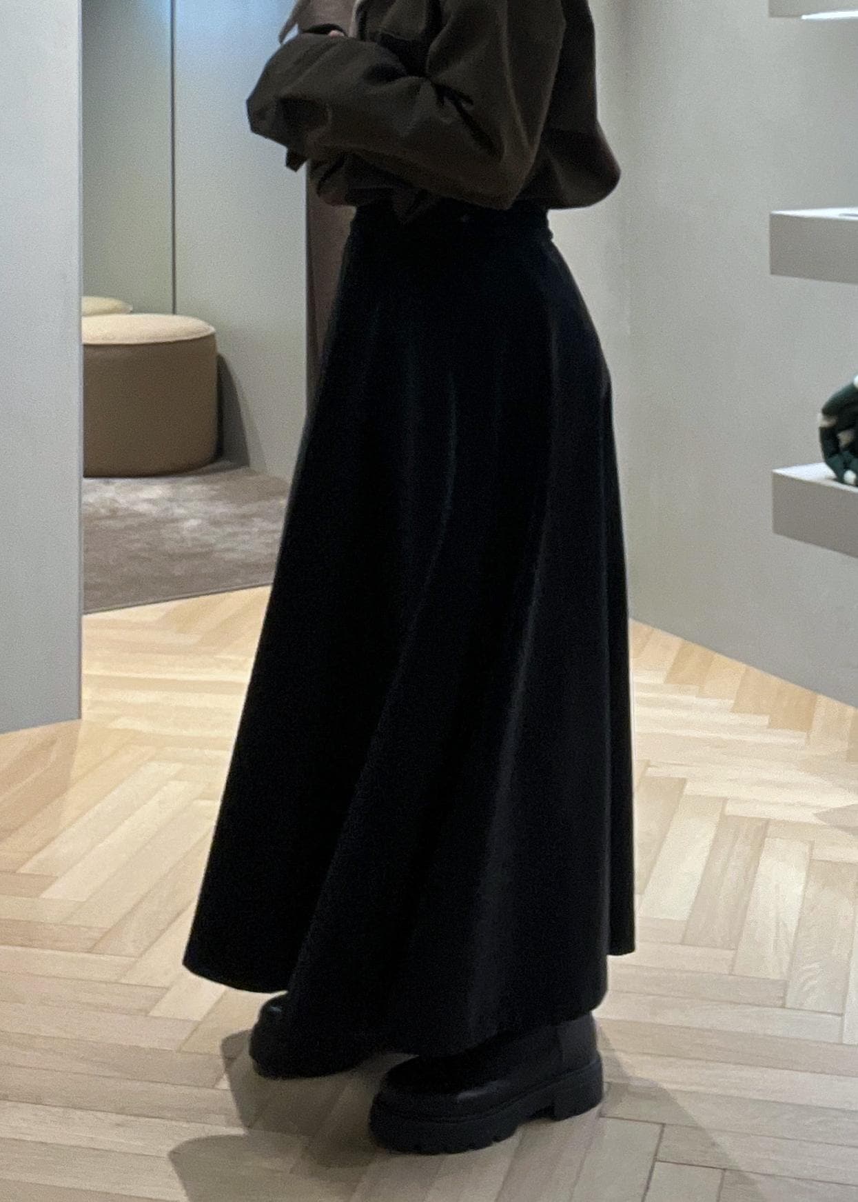 SALON adam et ropéパールレザーライクフレアスカートブラック / F¥24,200レビュー152cmでも足首がしっかり見えるくらいで履きやすい丈。高身長さんならブーツ合わせがおすすめです。